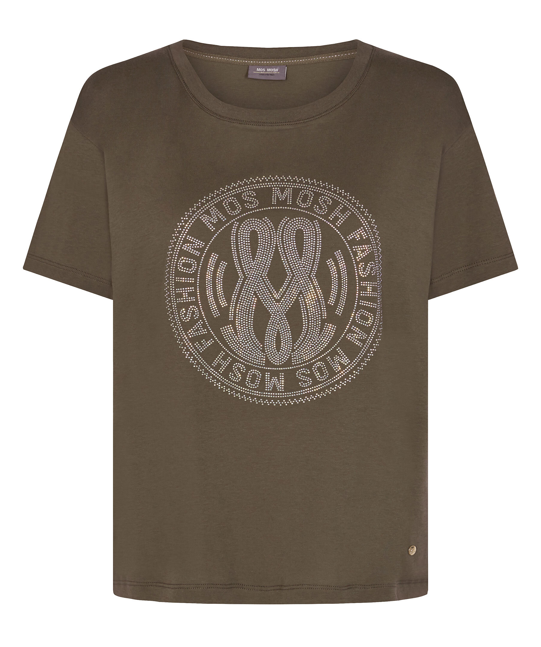 Militärgrön t-shirt med logotyp i glittriga strasstenar från Mos Mosh. Rundad halsringning med tunt ribbad mudd.