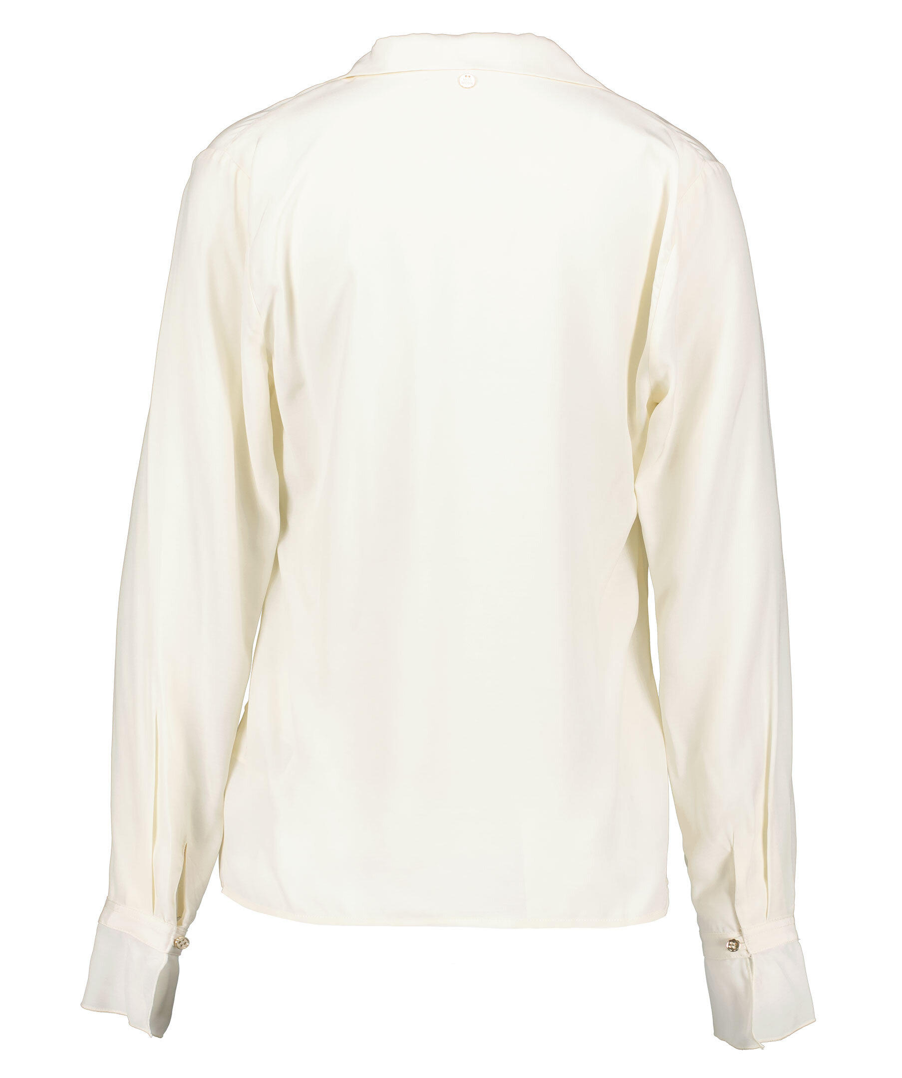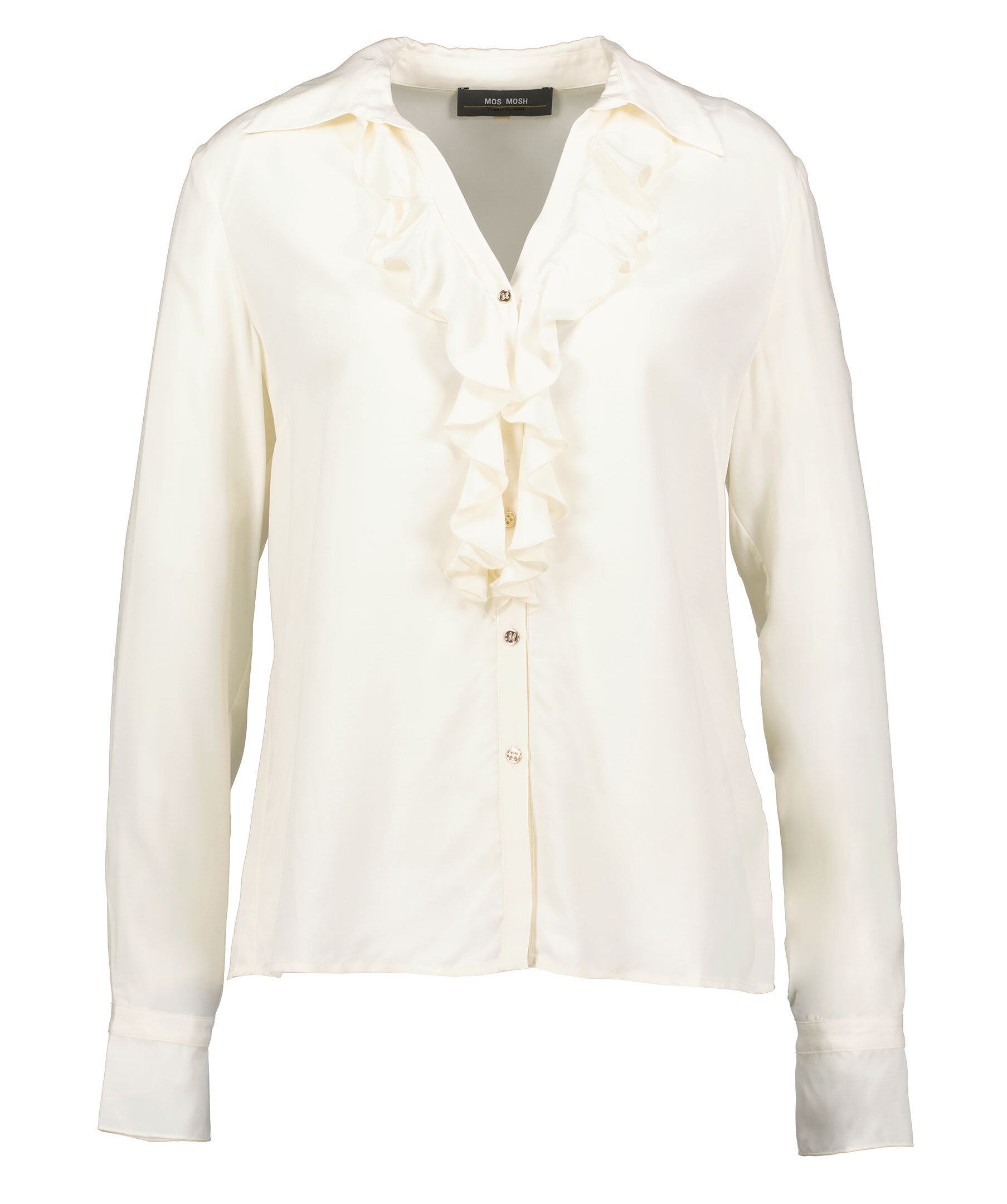 Vit blus med med volanger och v-ringad halsringning från Mos Mosh, spetsig krage. Stängs framtill med guldfärgade knappar. Tillverkad i viskos blandning.