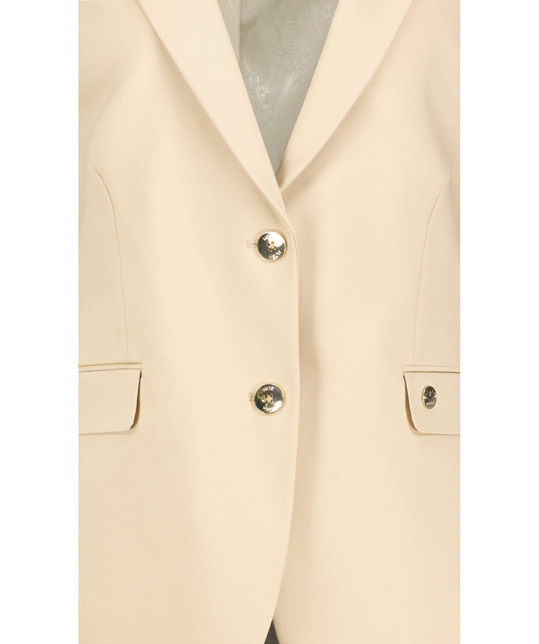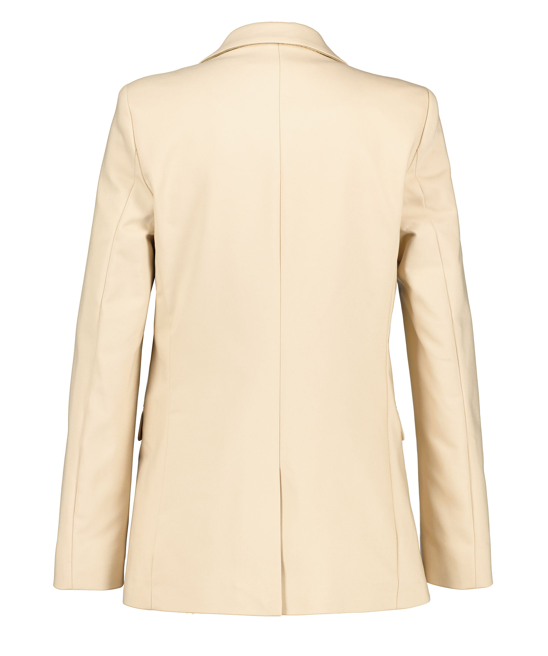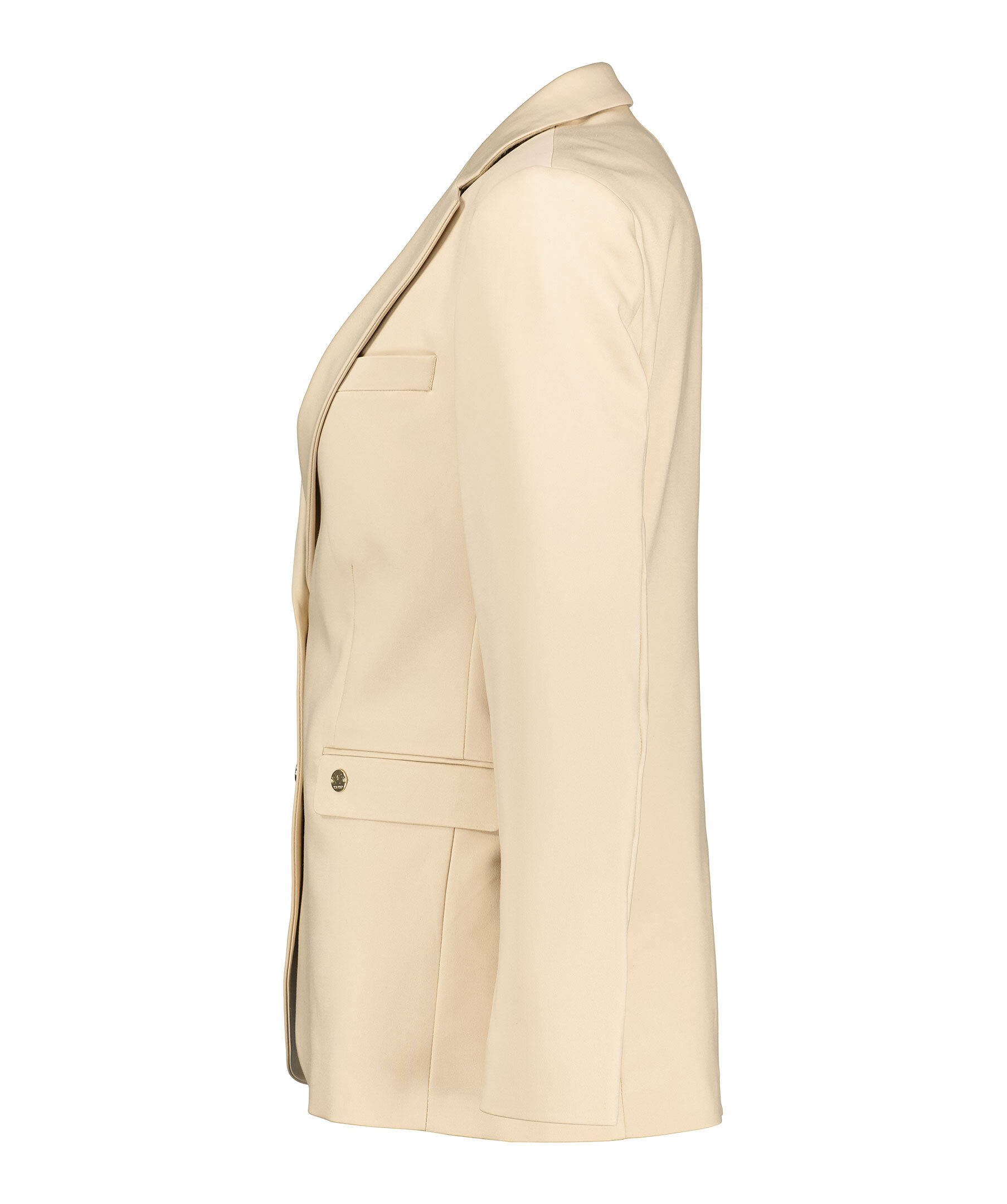 Beige Kavaj från Mos Mosh. Stängs framtill med två guldfärgade knappar. Två fickor framtill med lock, varav en med bricka med logotyp. En snedställd bröstficka på vänster sida. Sprund baktill. Tillverkad i stretchigt material. Aningen Oversized passform.