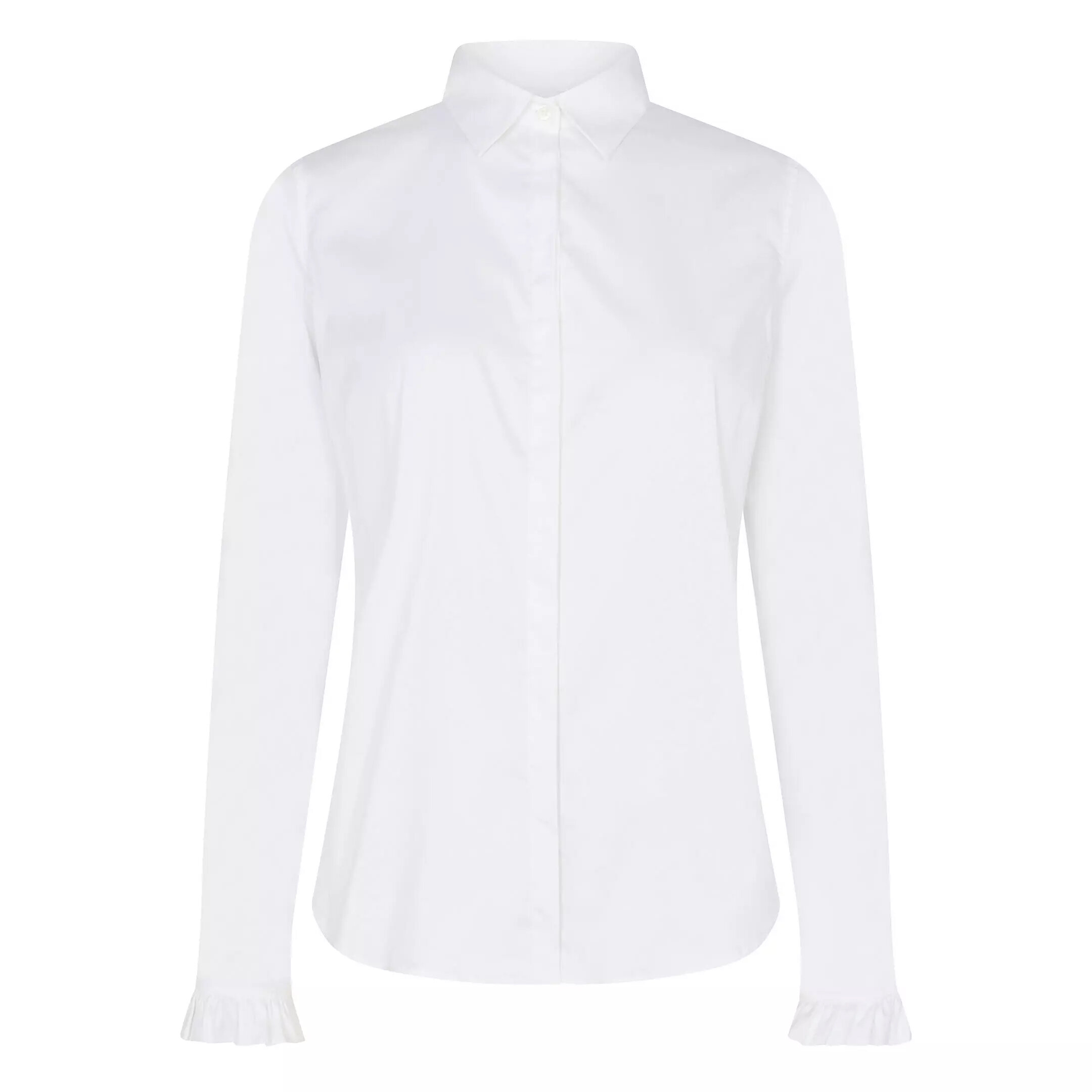 Vit skjorta i smickrande och smal passform från Mos Mosh. Tillverkad i mjukt, stretchigt tyg med en klassisk krage. Feminina volanger i ärmslut med en knapp och dold knappstängning fram.