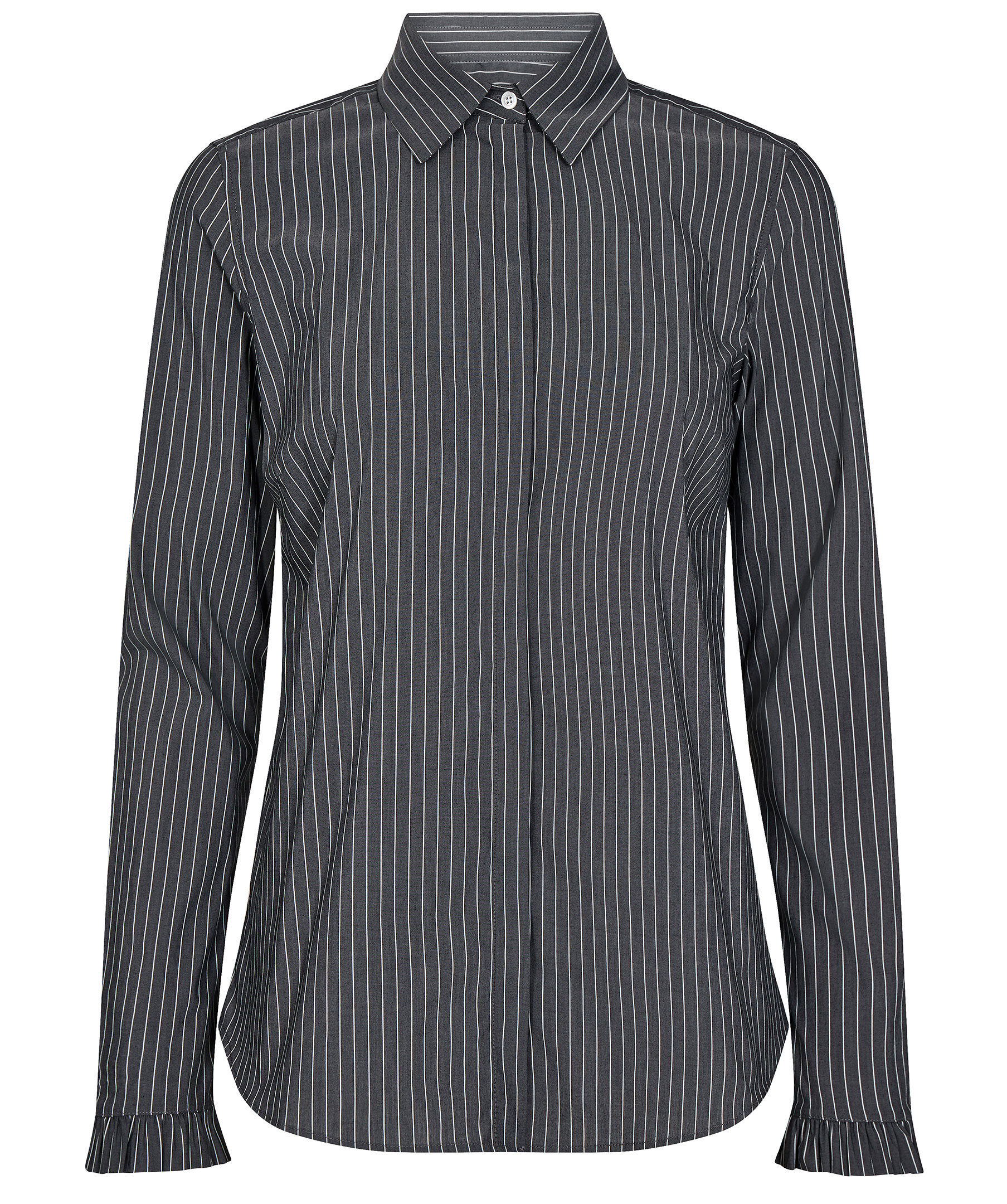 Mörkgrå skjorta i slim fit modell från Mos Mosh. Tunna vita, lodräta ränder och spetsig krage. Dold knäppning hela vägen fram och kort volang med knapp i ärmslut.
