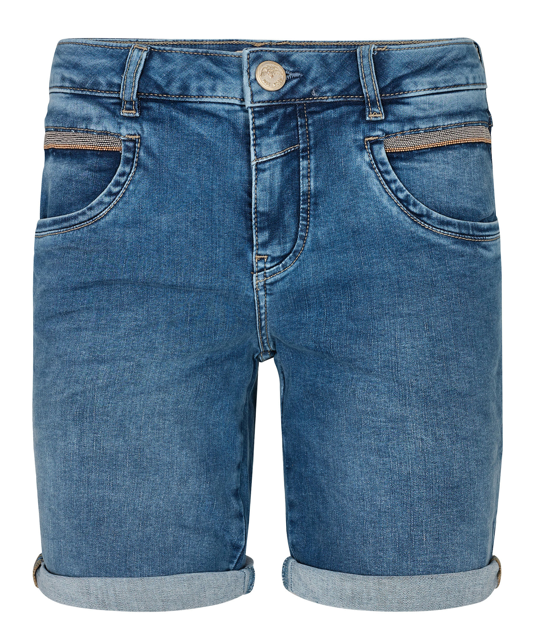 Ljusblåa jeansshorts med mellanhög midja från Mos Mosh. Tillverkade i stretchig bomullsblandning. Två framfickor och två bakfickor samt hällor för bälte i midjan. Detaljerade med pärlor på framfickorna, gylf med dold dragkedja och guldfärgad knapp. Rulla upp bensluten eller ha den nedrullade för olika looks.