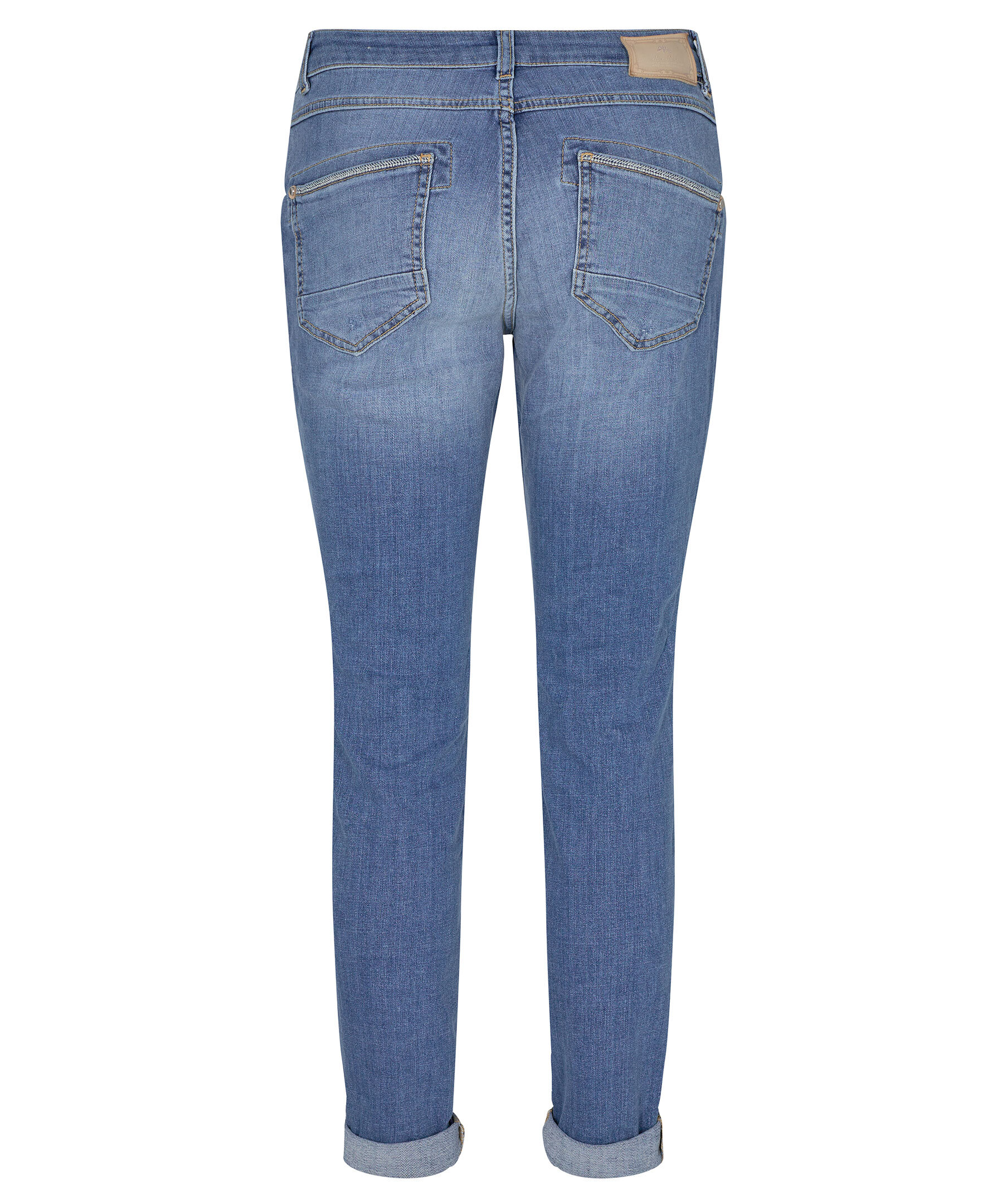 Jeans i en mellanblå tvätt från Mos Mosh. Byxorna är gjorda i en bomullsblandning och har smala ben och en mellanhög midja. Dekorerad med glittersömmar vid fram och bakfickorna.