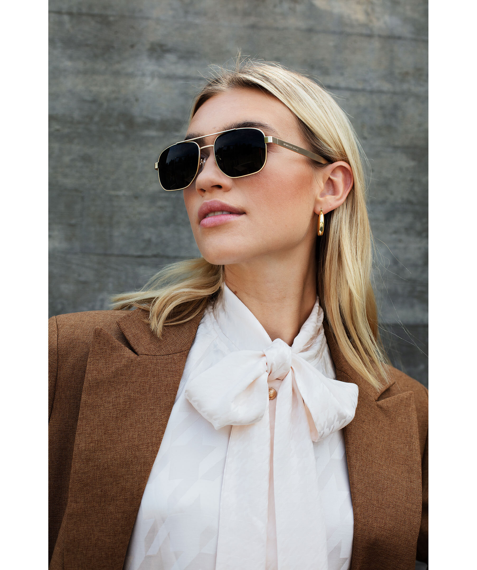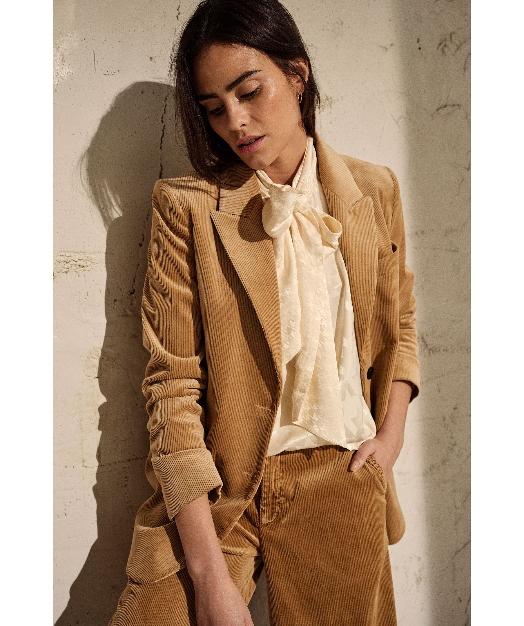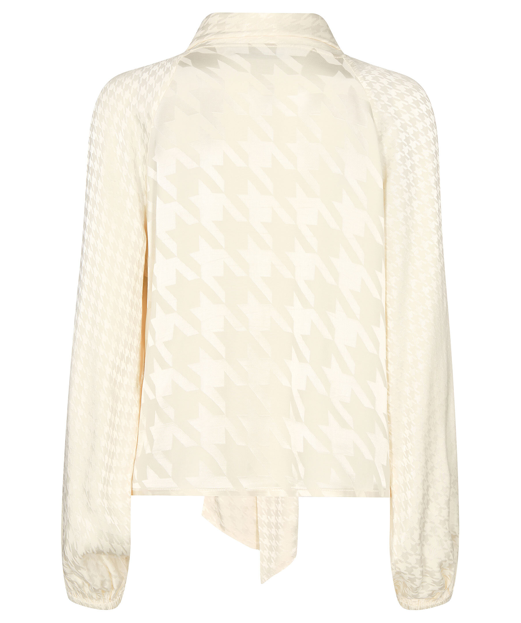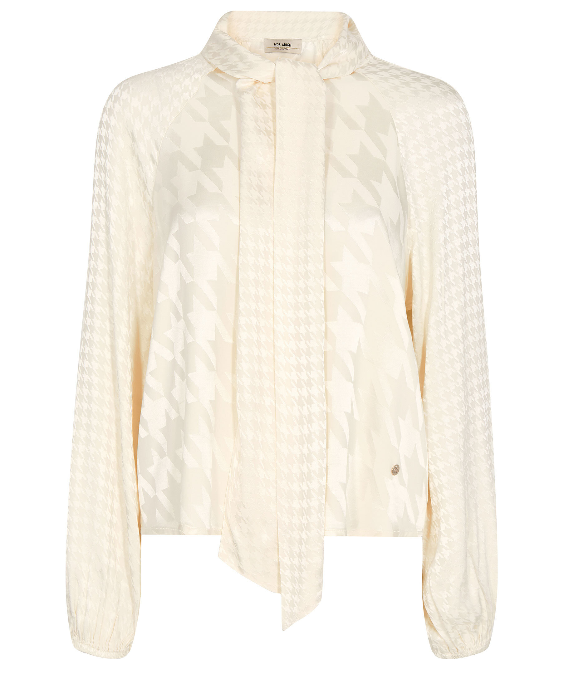 Krämvit jacquardblus med knyt-detalj från Mos Mosh. Kan knytas vid halsen som en rosett eller en enkel knut. Tillverkad av EcoVero Viscose, designad i en vanlig siluett med elastiska muddar som ger en puffärm i ärmslutet och knappstängning som är dold halvvägs.
