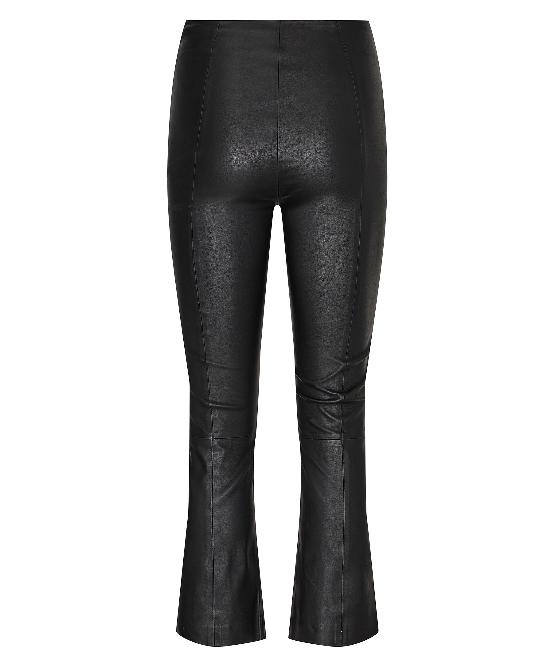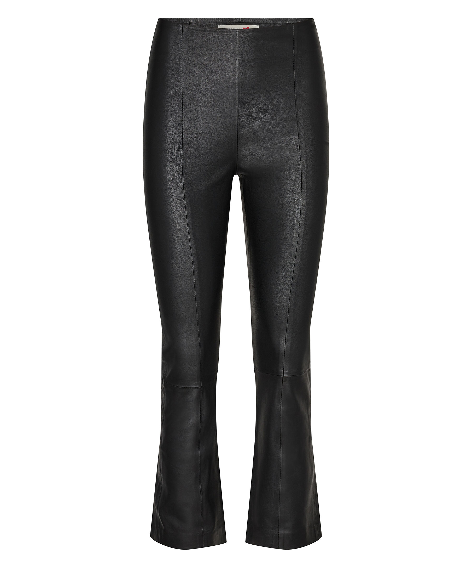 Svarta skinnbyxor tillverkade av lammläder från Mos Mosh. Passform med hög midja, smal siluett upptill och croppade i benen med en lätt utsvängning. Diskret dragkejda i sidan och tunna sömmar lodrätt mitt på byxans ben fram och bak som en fin detalj.