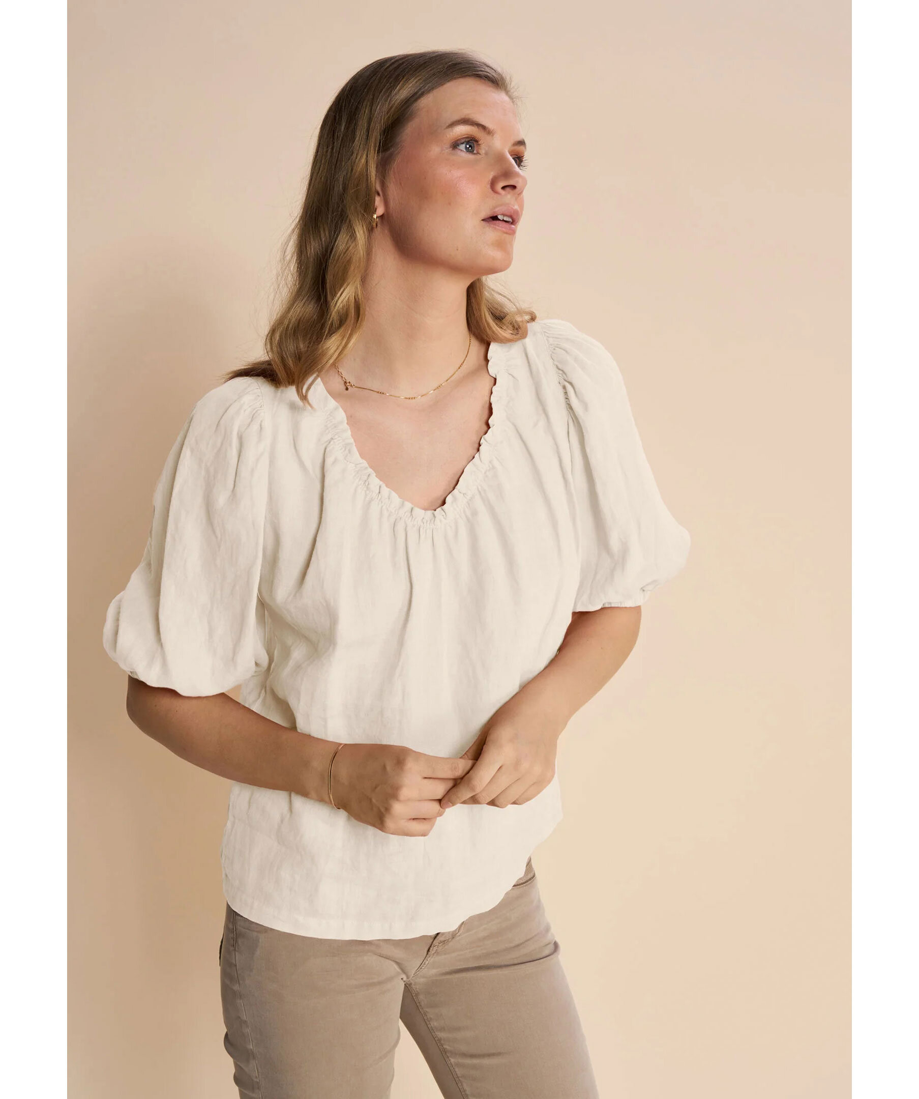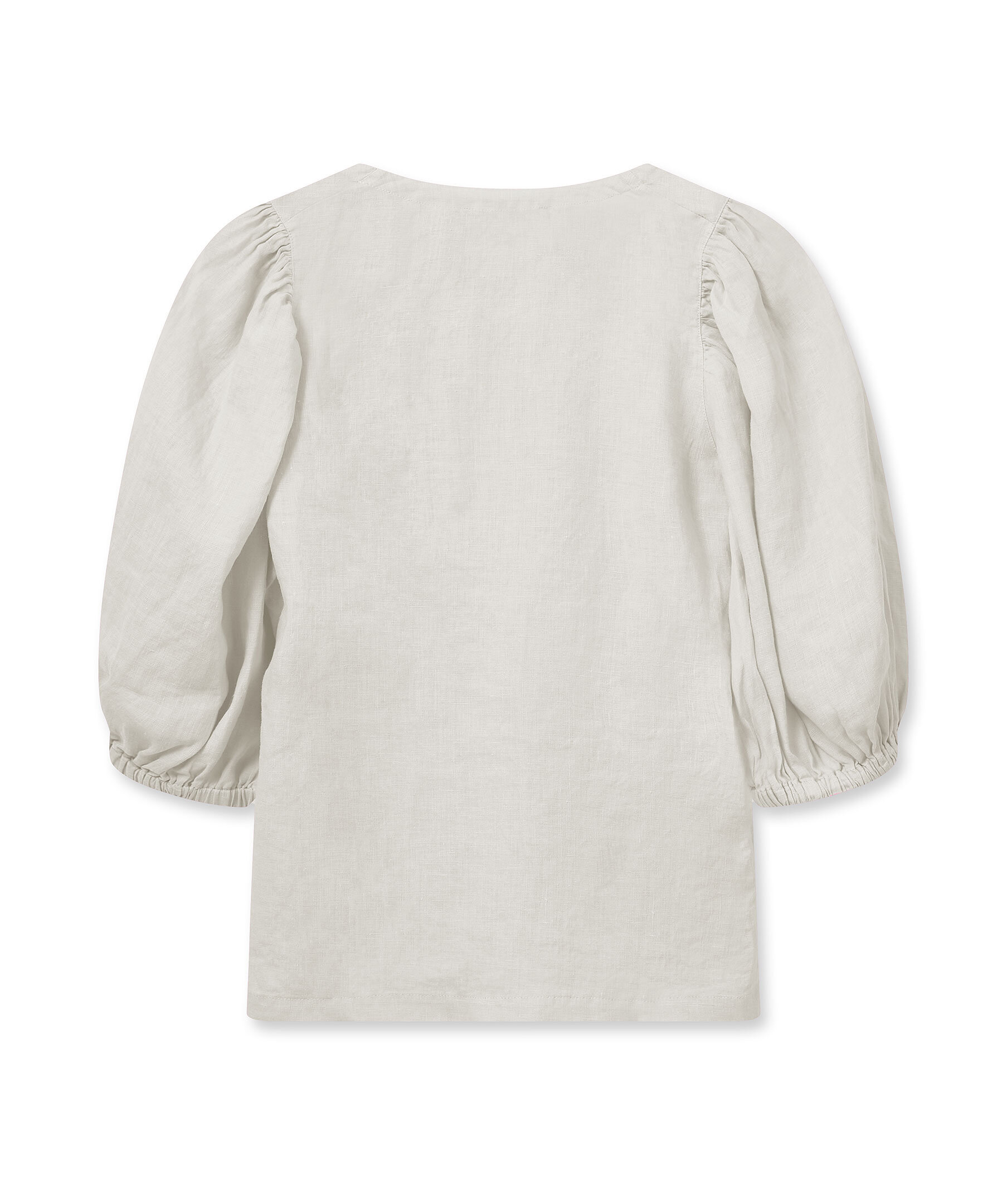 Krämvit linneblus från Mos Mosh. Lös passform med en vid v-ringning fram. Volanger pryder halsen. Elastiska ärmslut bidrar till ballongärmar. Tillverkad i linne.