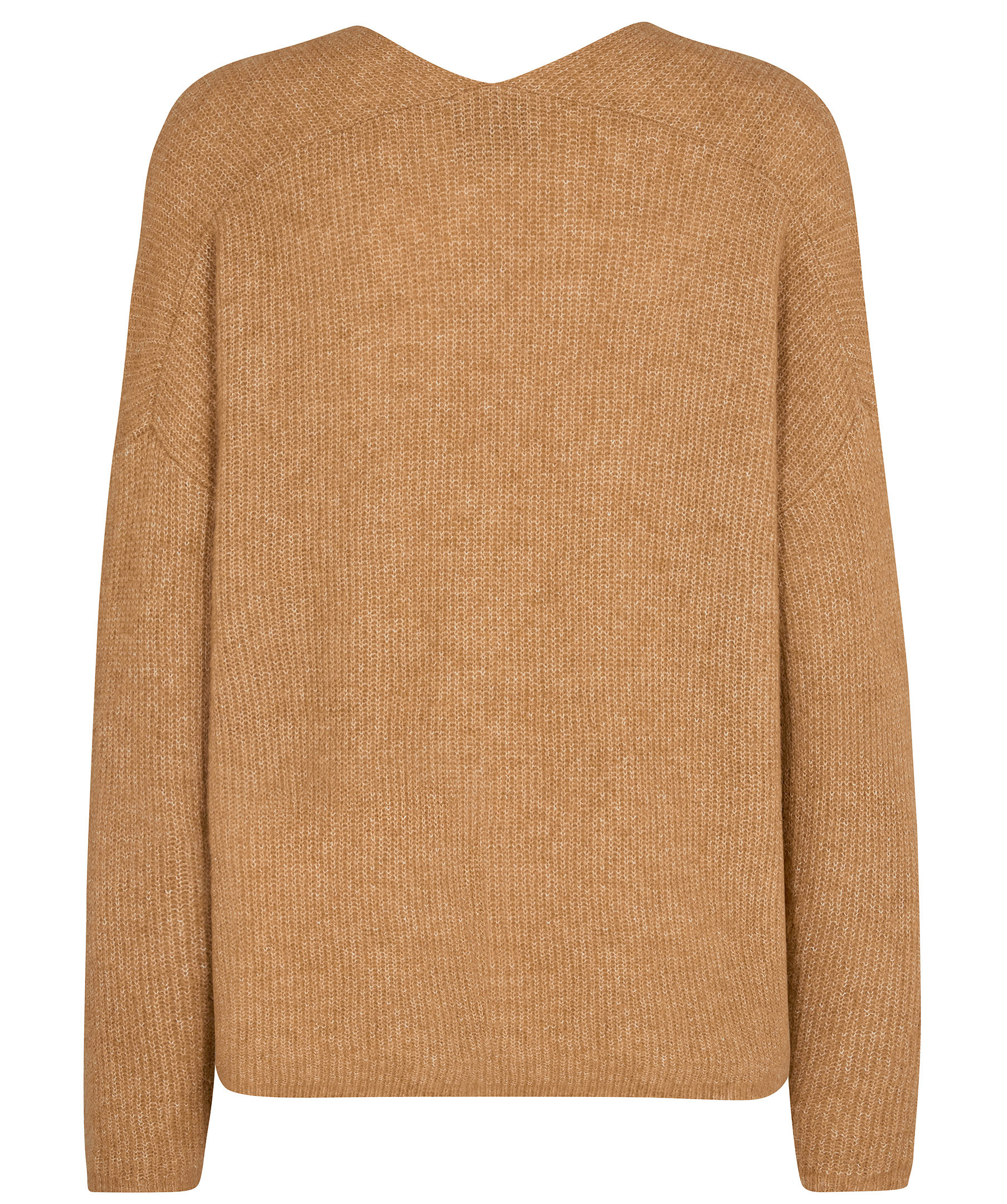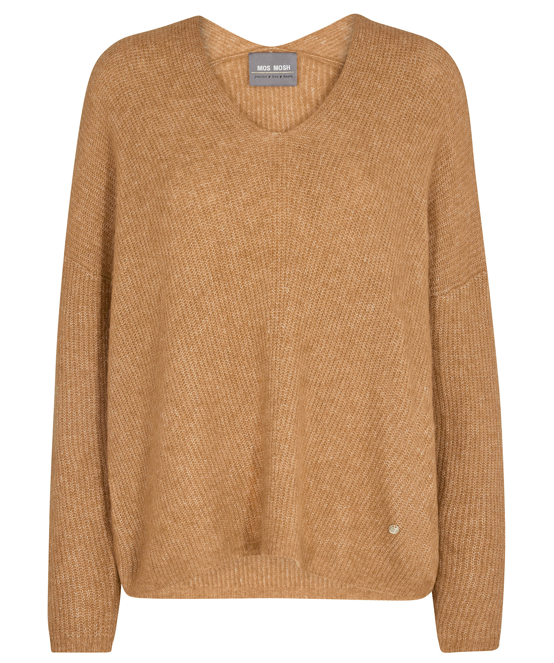 Kamelfärgad, v-ringad stickad tröja från Mos Mosh. Tillverkad av superlätt alpacka och ullblandning. Den avslappnade passformen gör den perfekt för olika tillfällen både stylad med jeans eller lager över en klänning.