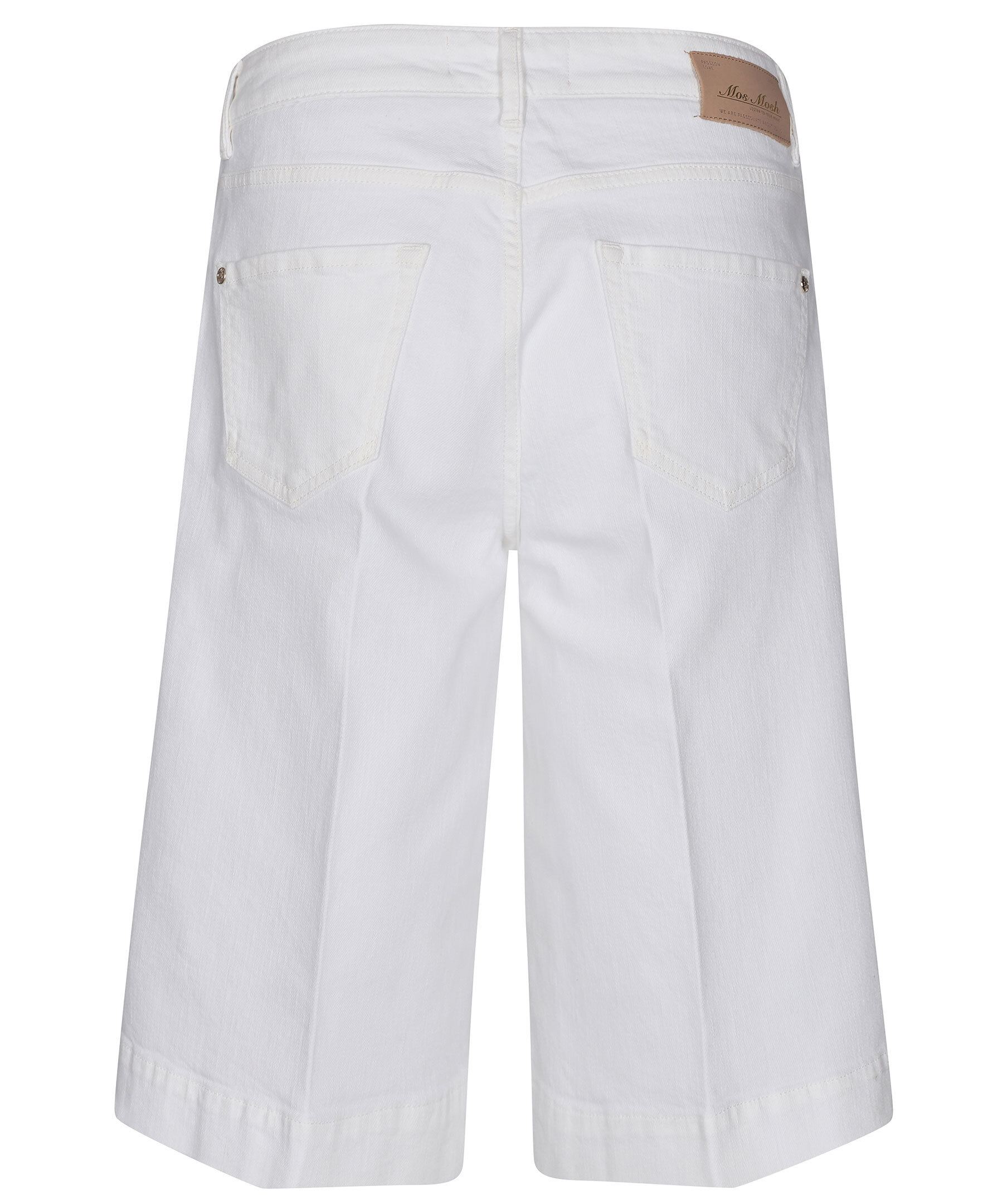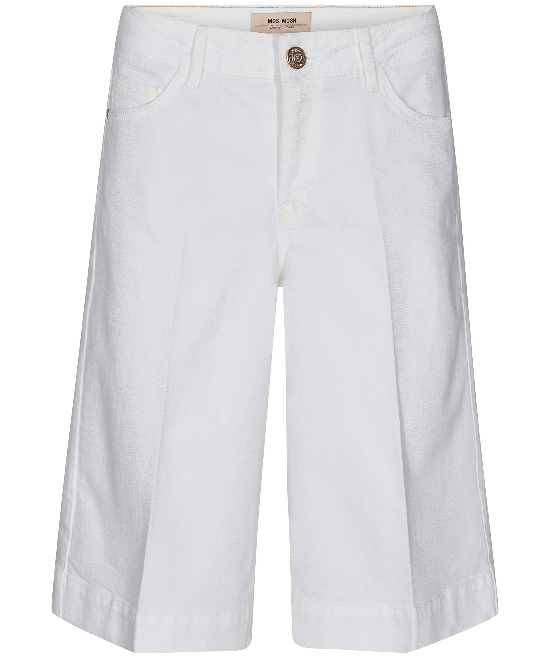 Vita, raka jeansshorts från Mos Mosh. Hög midja och långa, vida ben. Lutande fickor fram och en liten ficka innanför fickan på höger sida samt två bakfickor samt hällor för bälte i midjan. Dold gylf med guldfärgad knapp och guldfärgade nitar vid fickorna. Tillverkade i stretchig bomull. Stora i storlek, vi rekommenderar er att gå ner en storlek.