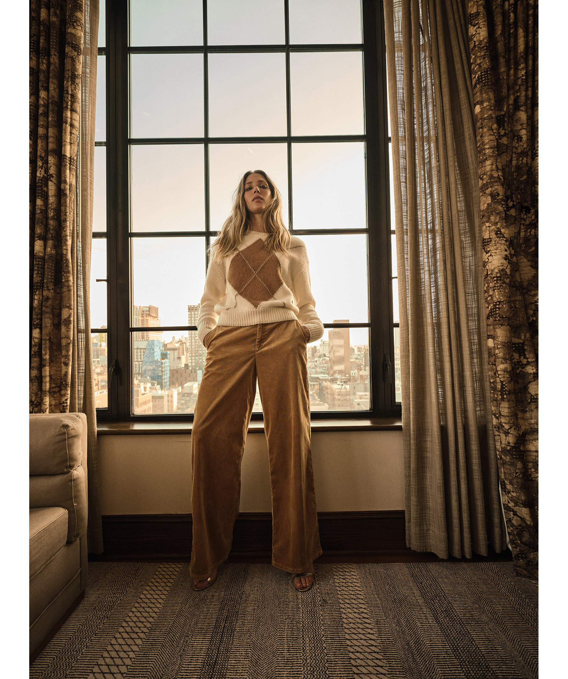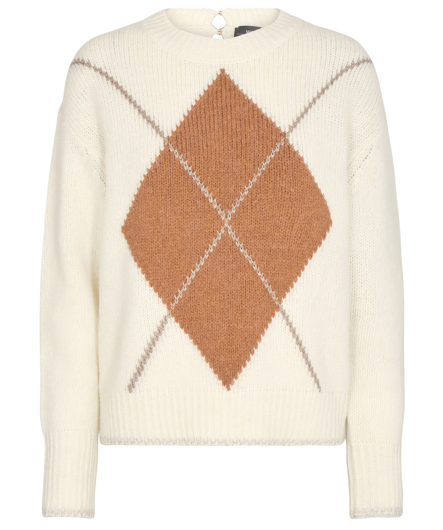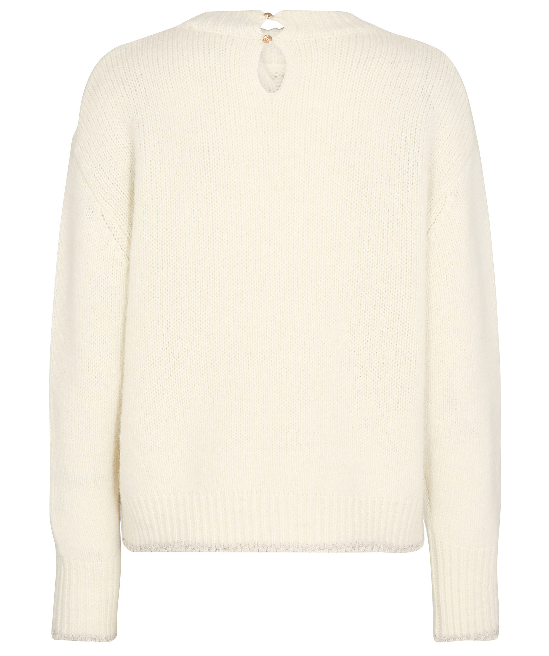 Vit, stickad tröja tillverkad av en alpacka-ullblandning från Mos Mosh. Diamantmönster fram i kamelfärg och glittriga trådar samt rundad halsringning. Ribbstickad i halsringning, ärmslut och plaggslut. Två guldfärgade knappar i nacken.