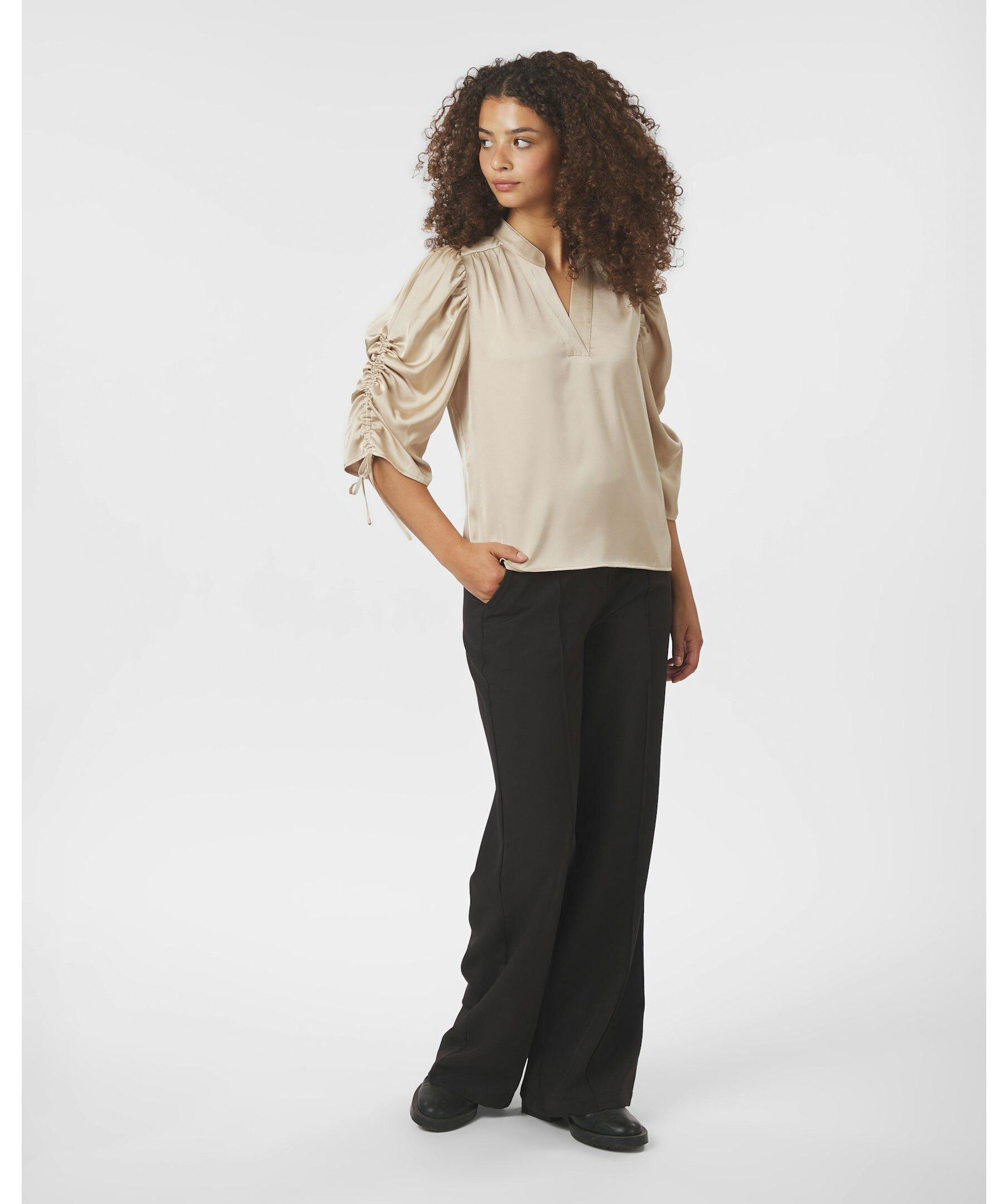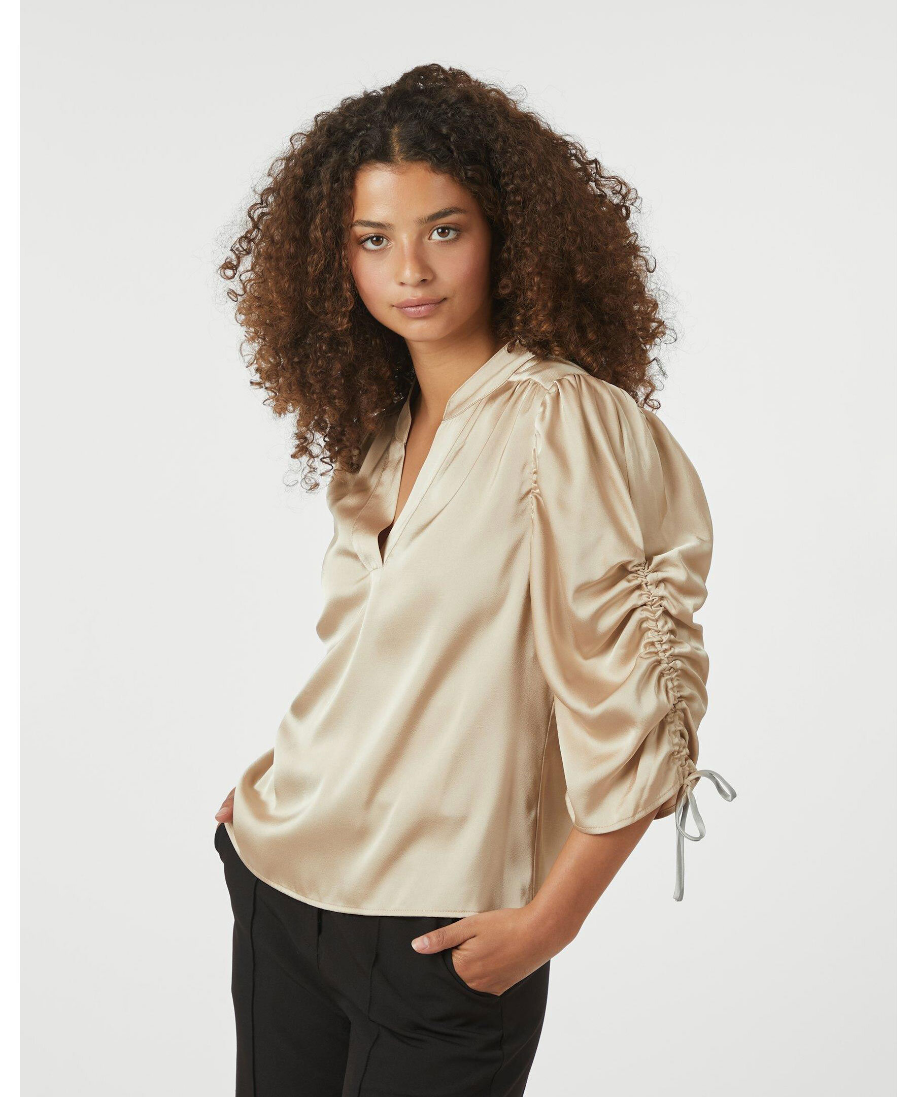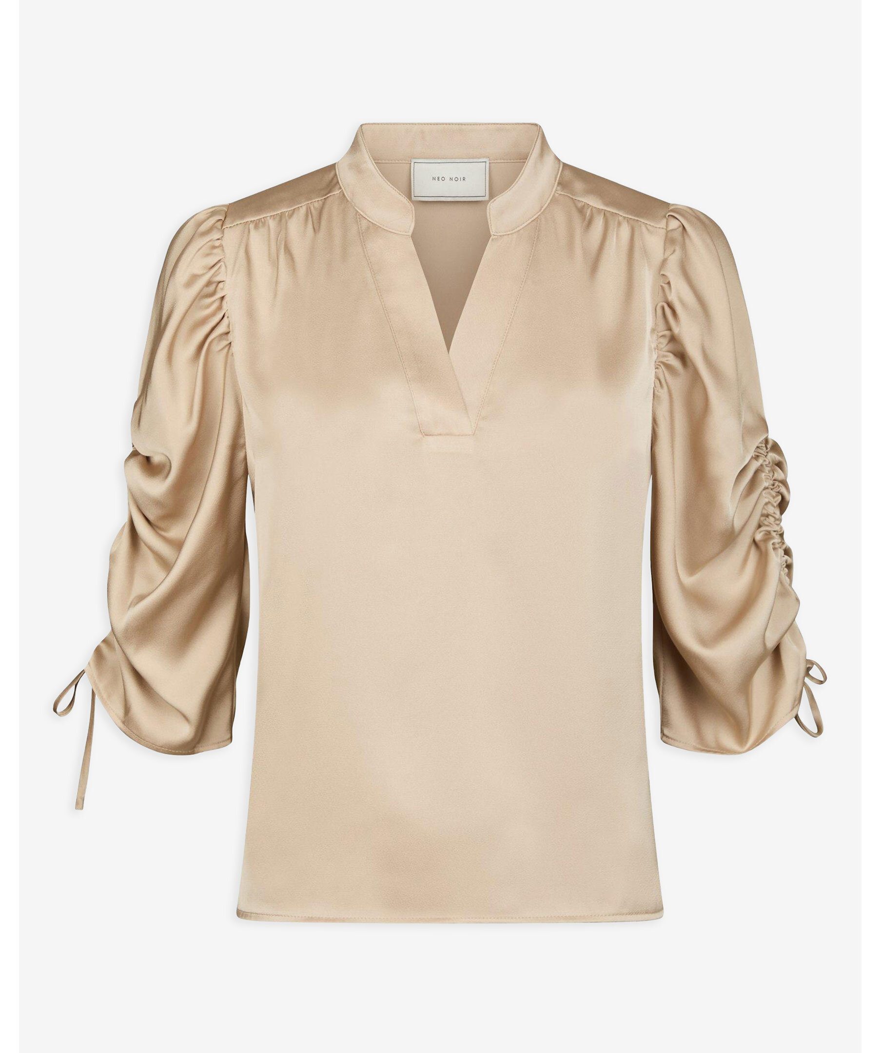 Champagnefärgad blus från Neo Noir i en fin satin kvalitet. Blusen har v-ringad halsringning och dragsnören vid ärmarna.
