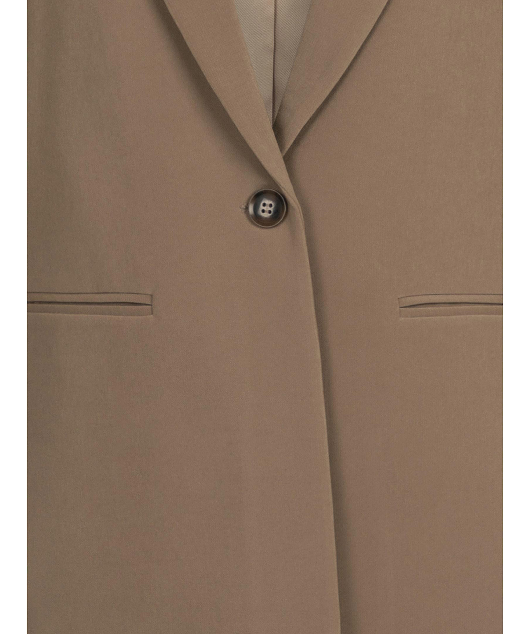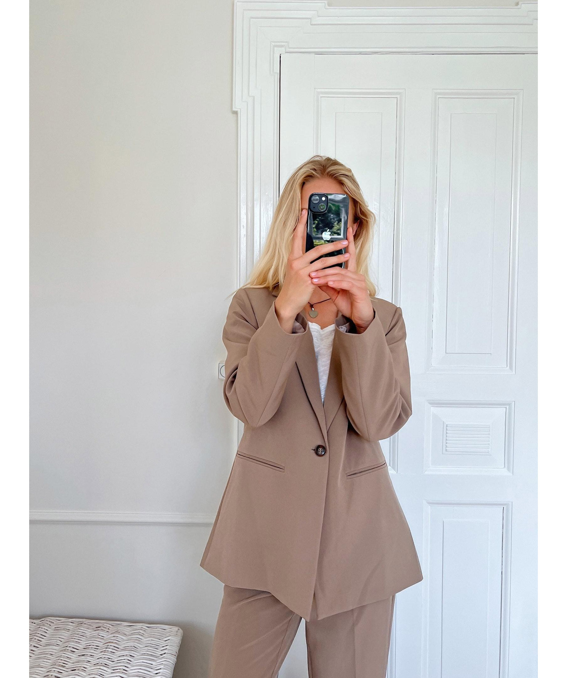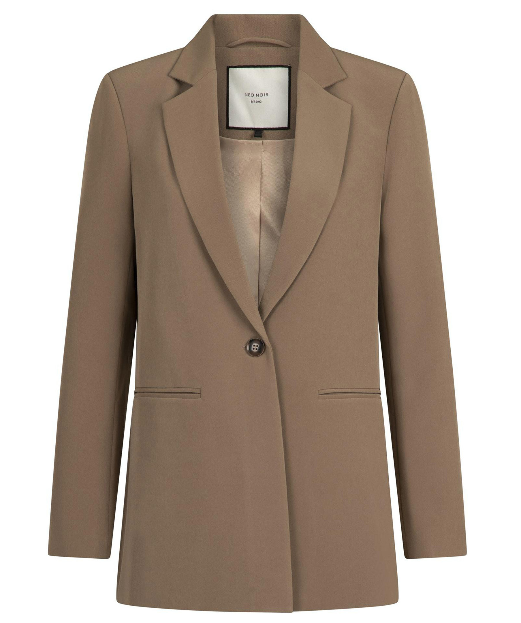 Beige blazer från Neo Noir. En knapp fram, axelvaddar och slits baktill. Modellen är 176 cm lång och bär storlek 36.