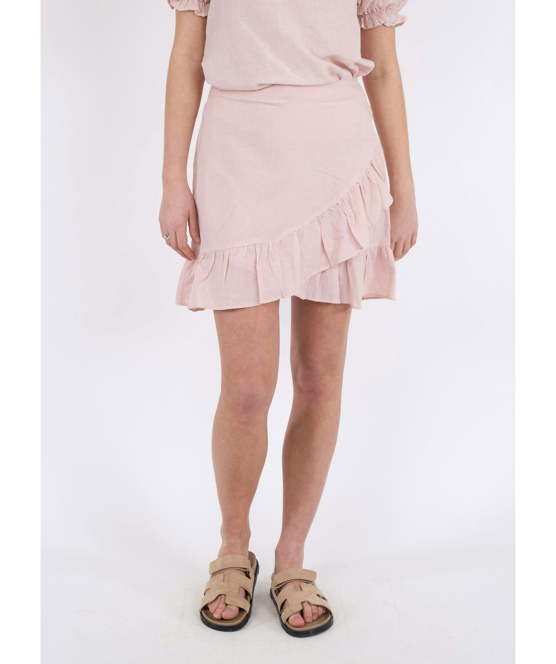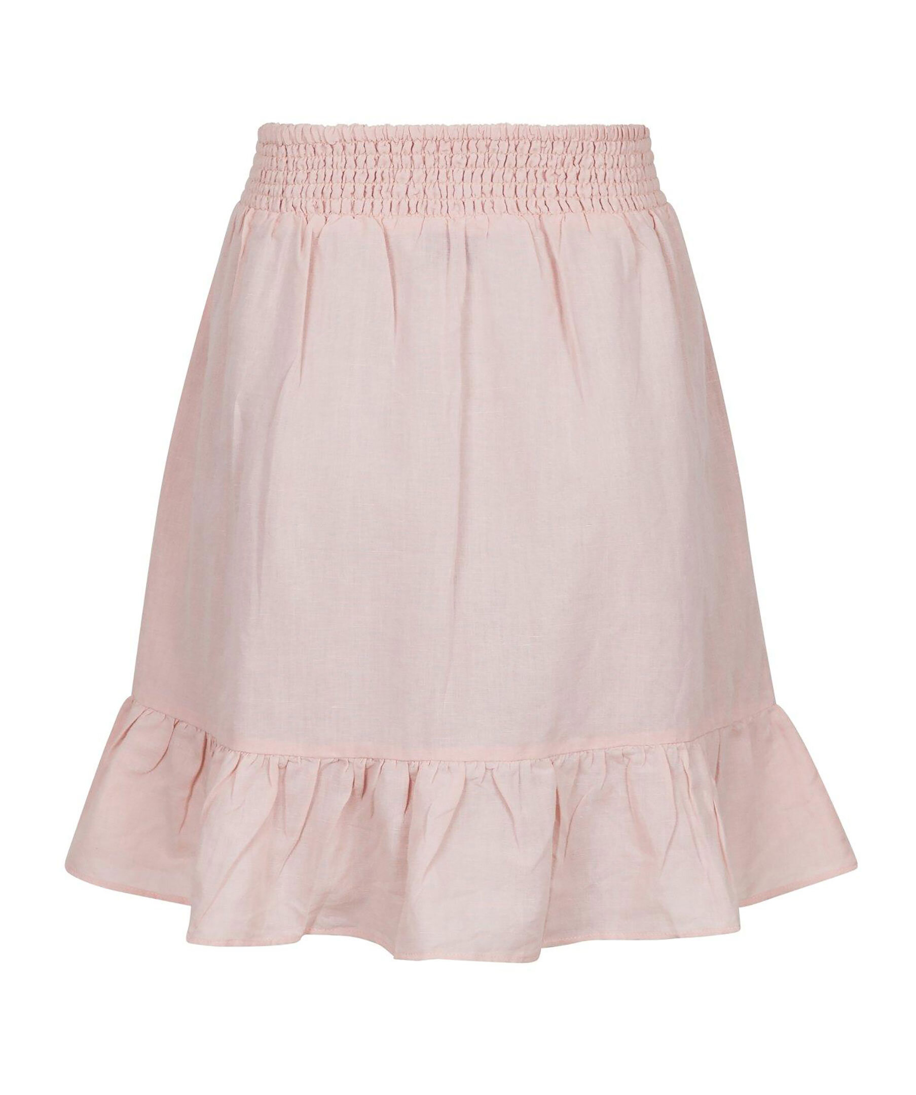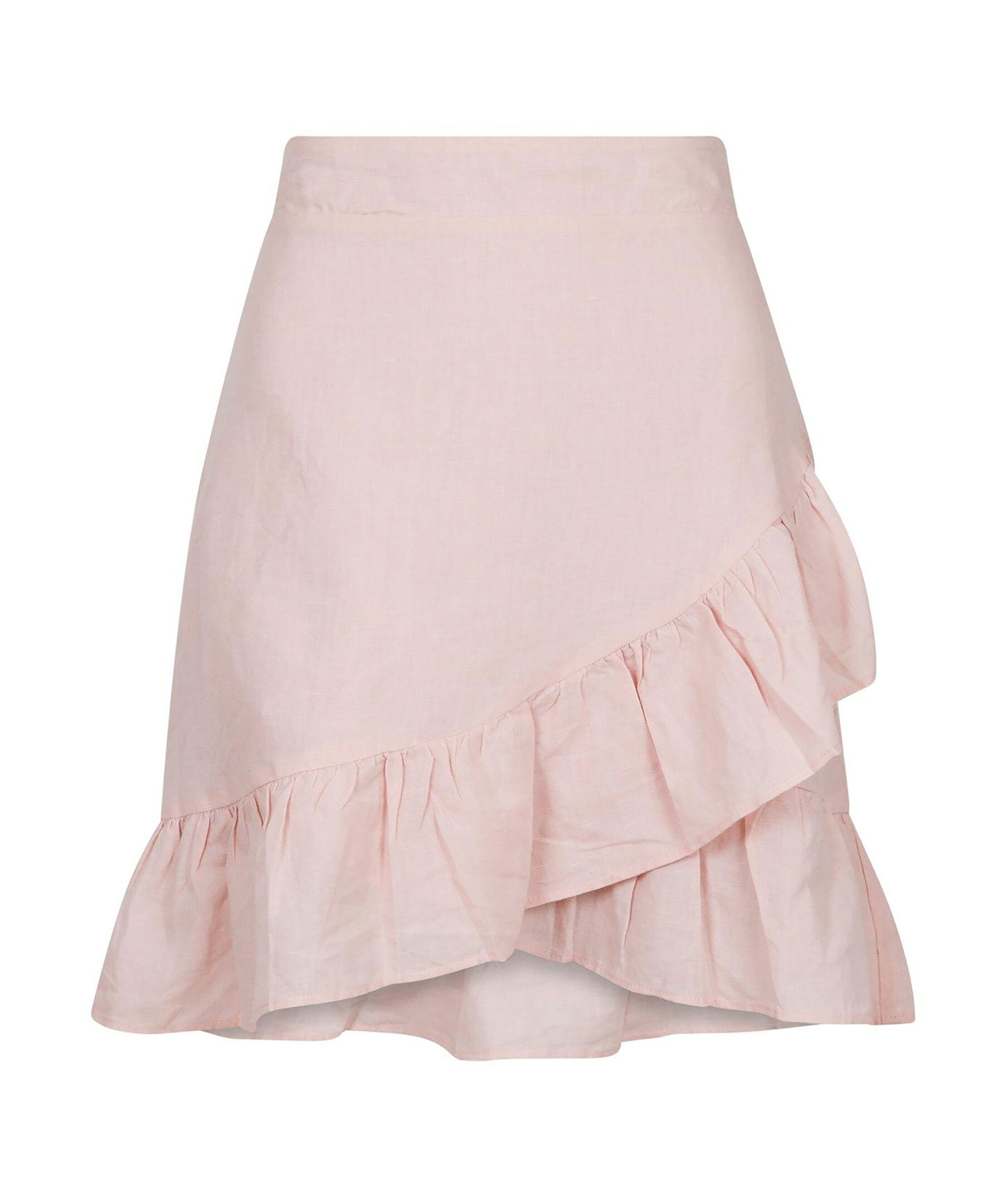 Ljusrosa kjol från Neo Noir. Kjolen slutar mitt på låren och har volangfåll och ett midjeband med smock baktill. Tillverkad i en linnemix.