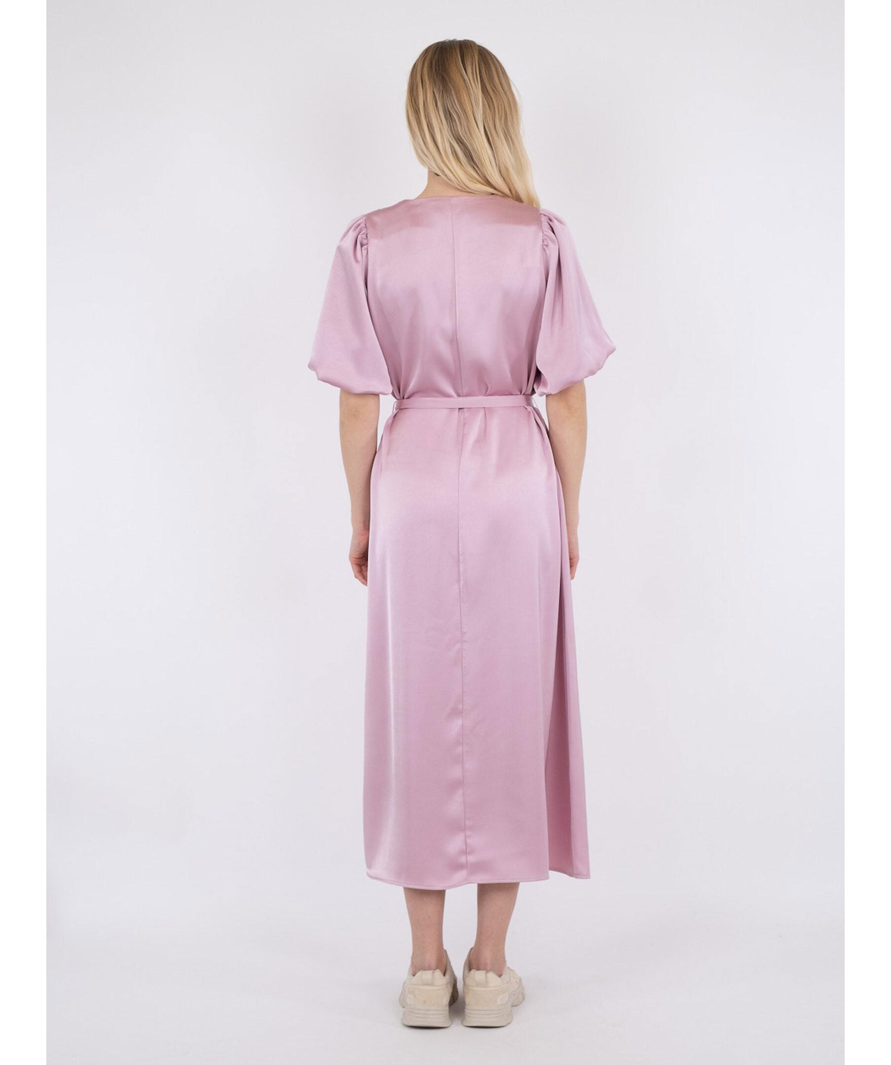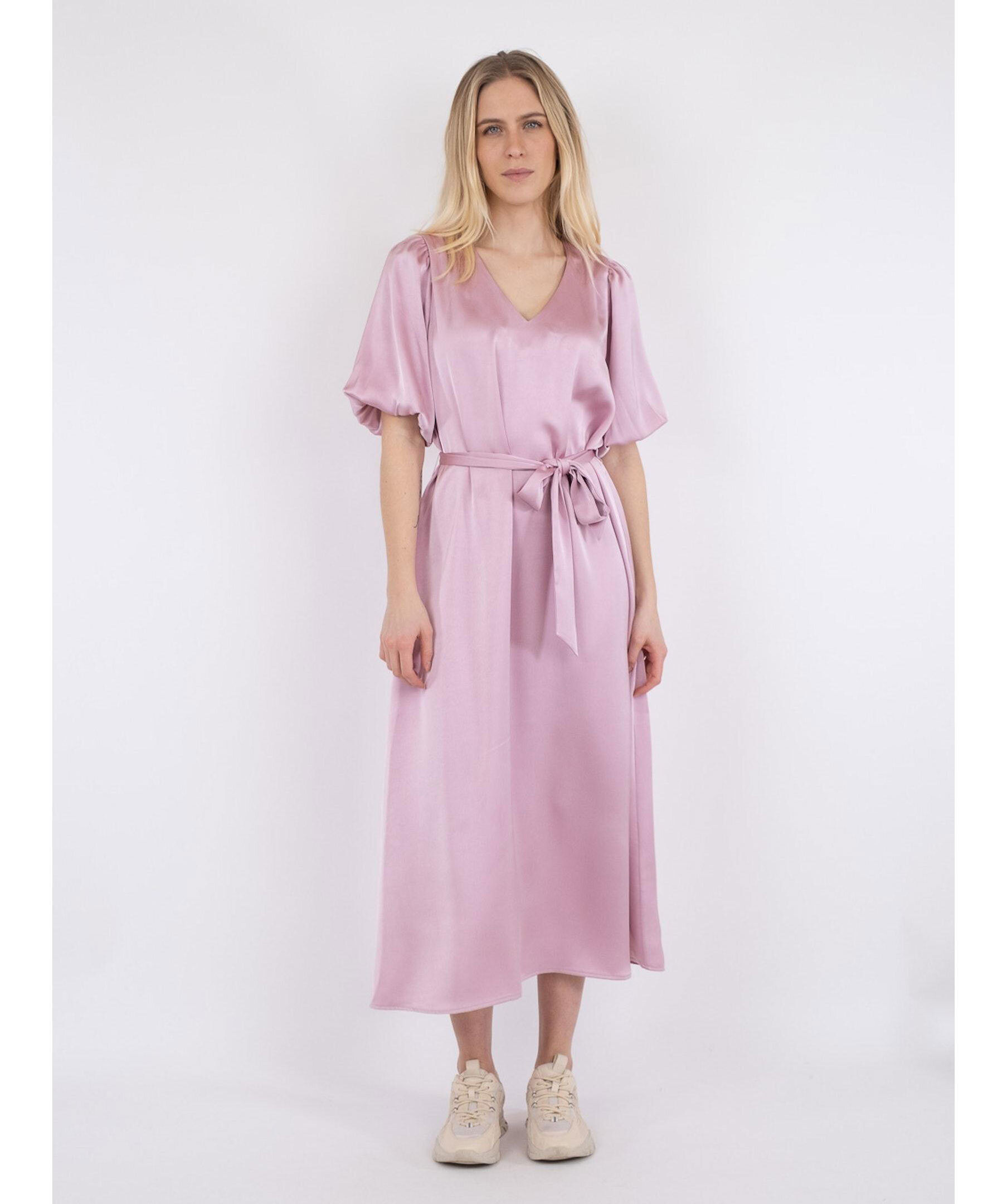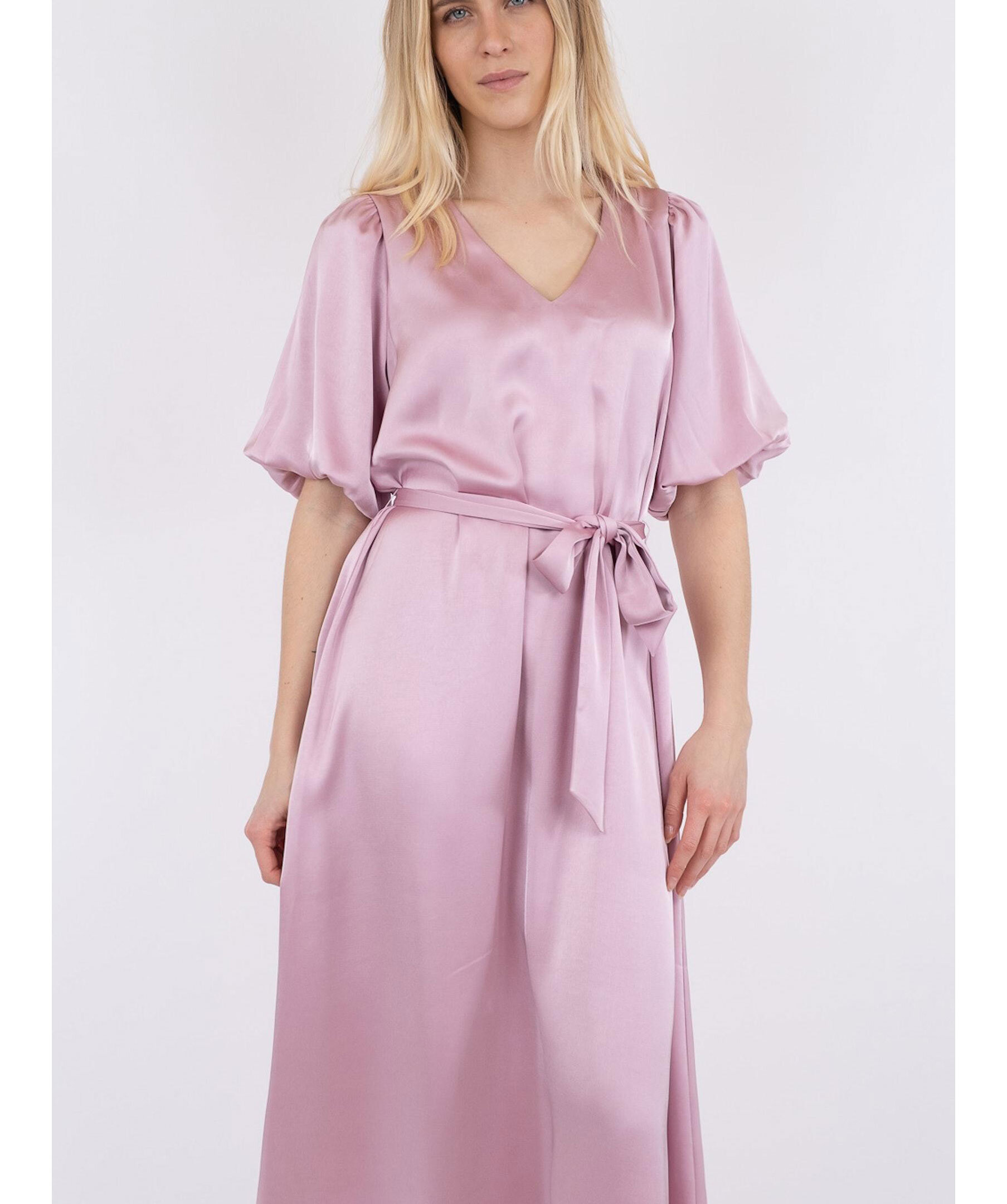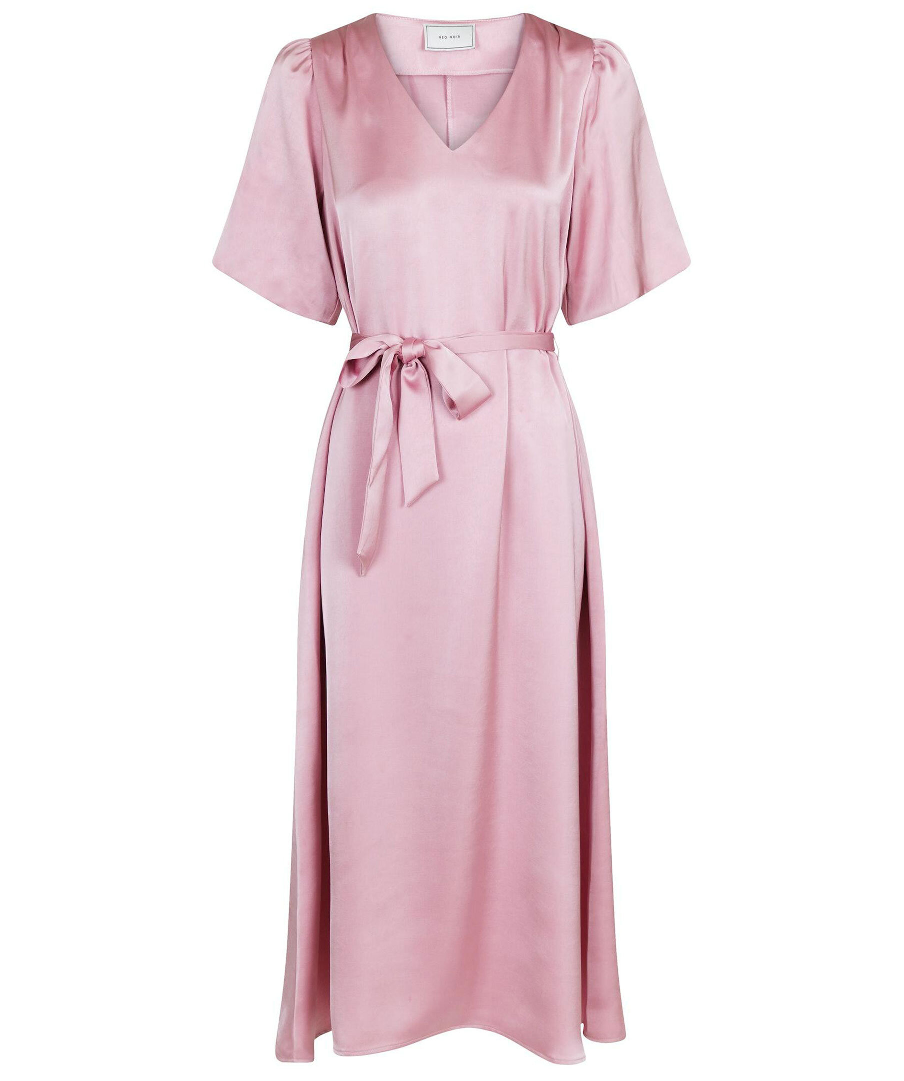 Ljusrosa klänning från Neo Noir. V-ringad. Löstagbart dekorativt band i midjan. Korta ballongärmar med små axelvaddar. Klänningen slutar mitt på vaden.
