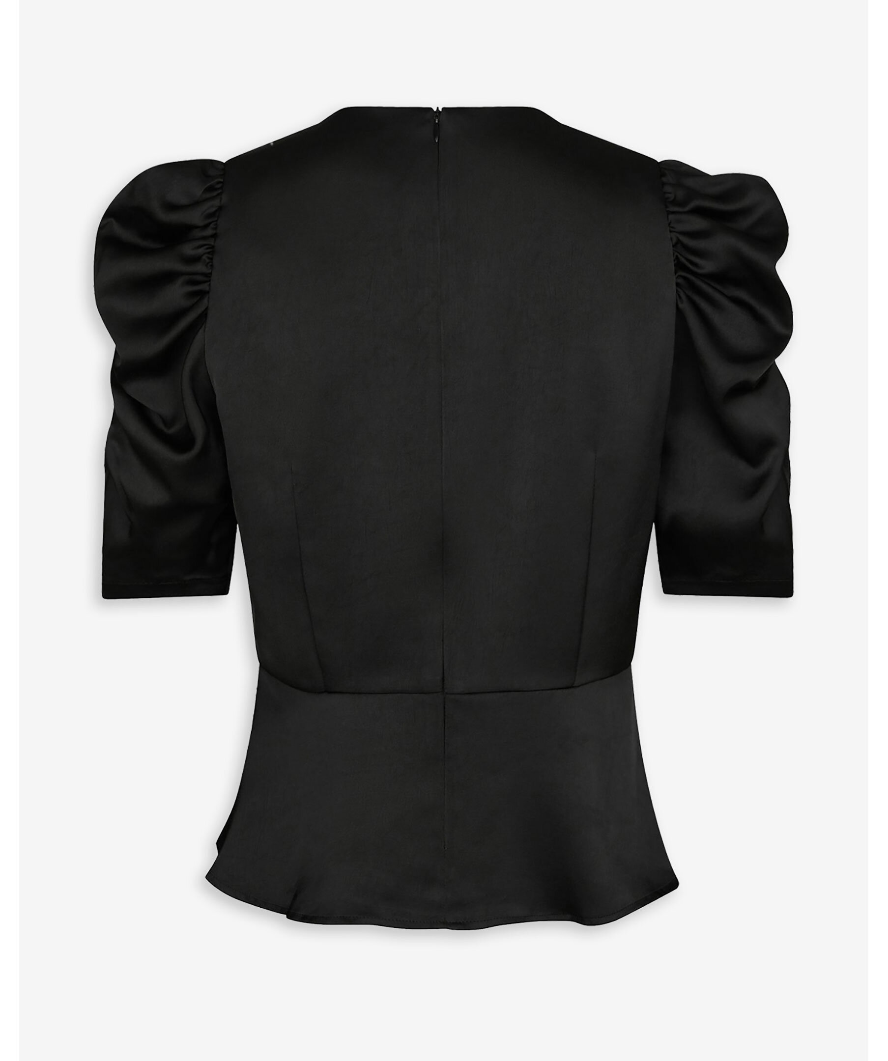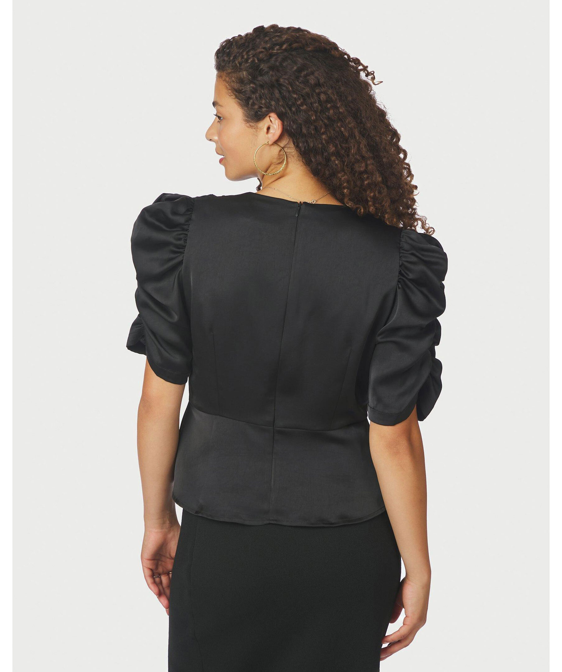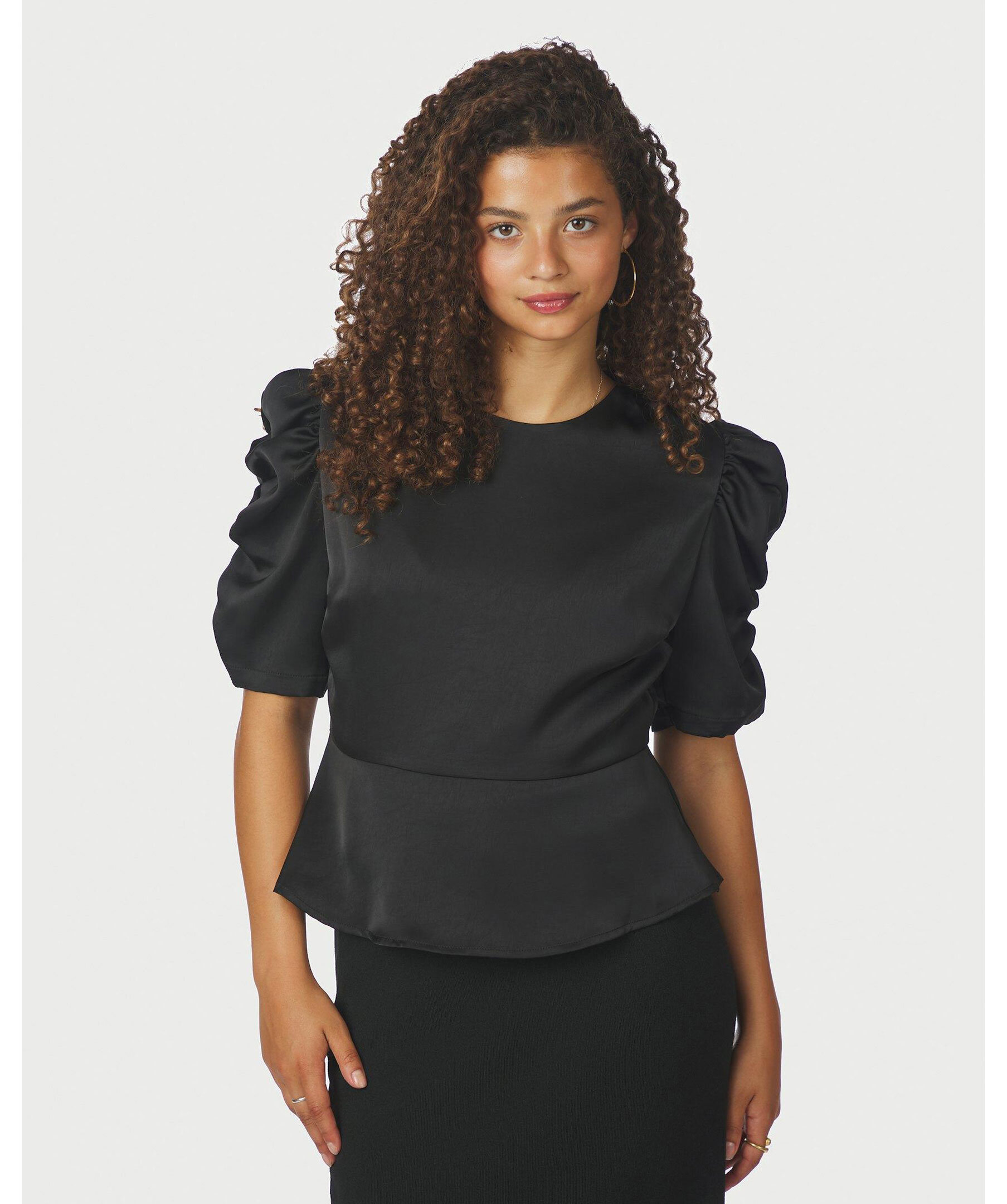 Svart satinblus med puffärmar från Neo Noir. Blusen har korta ärmar och peplumkant.