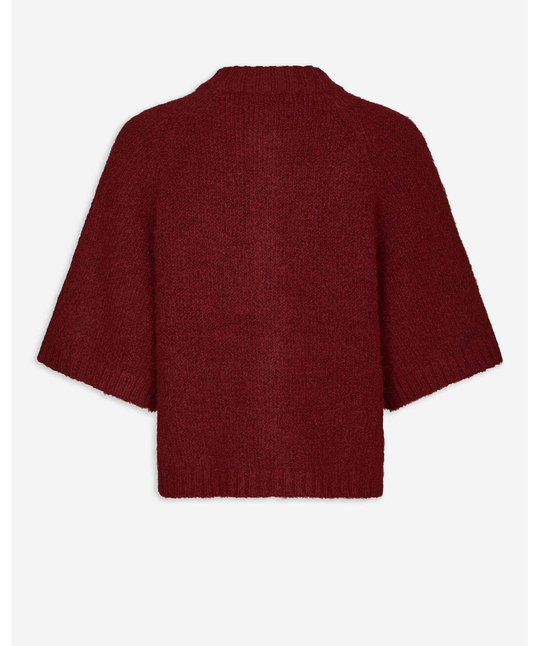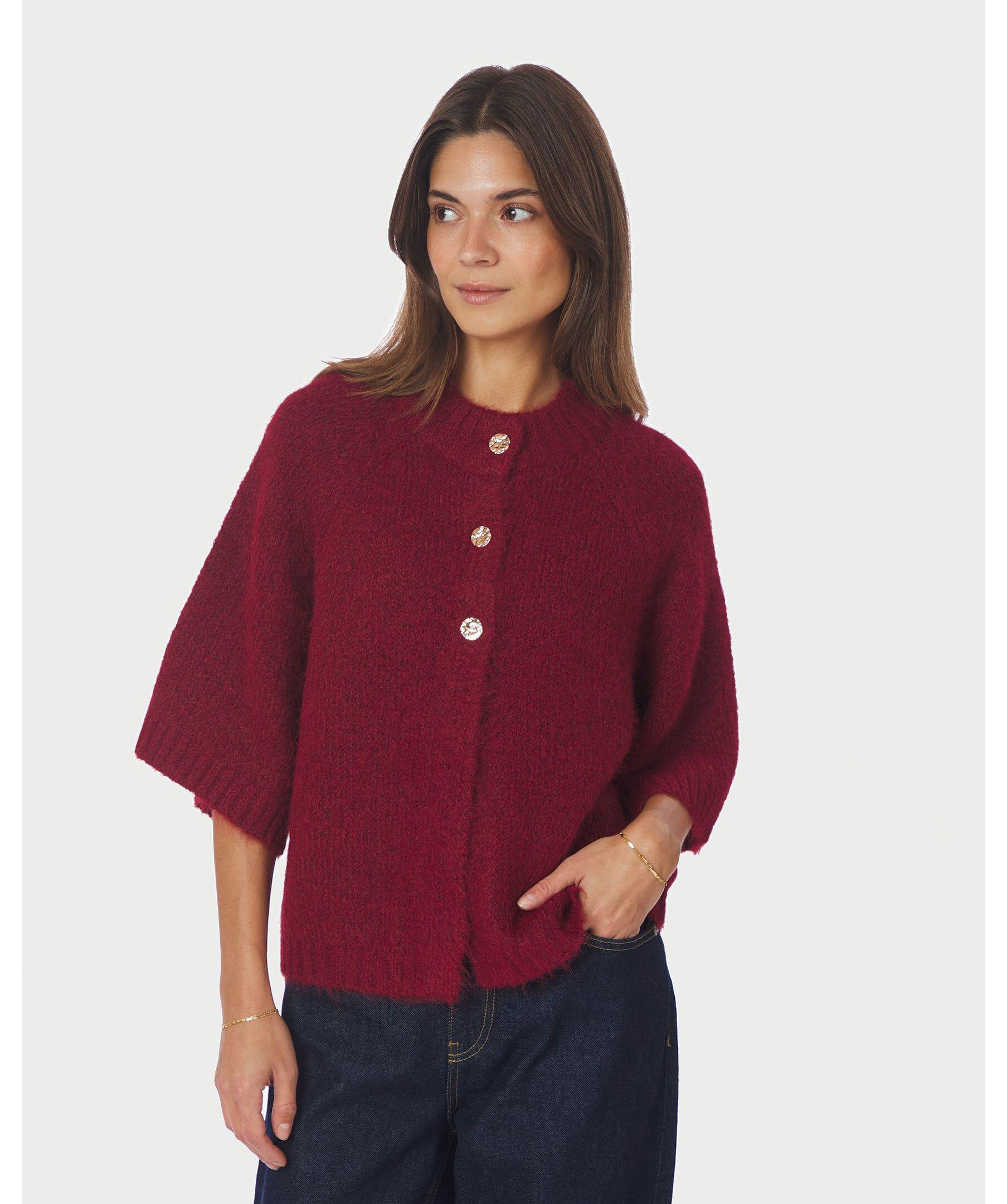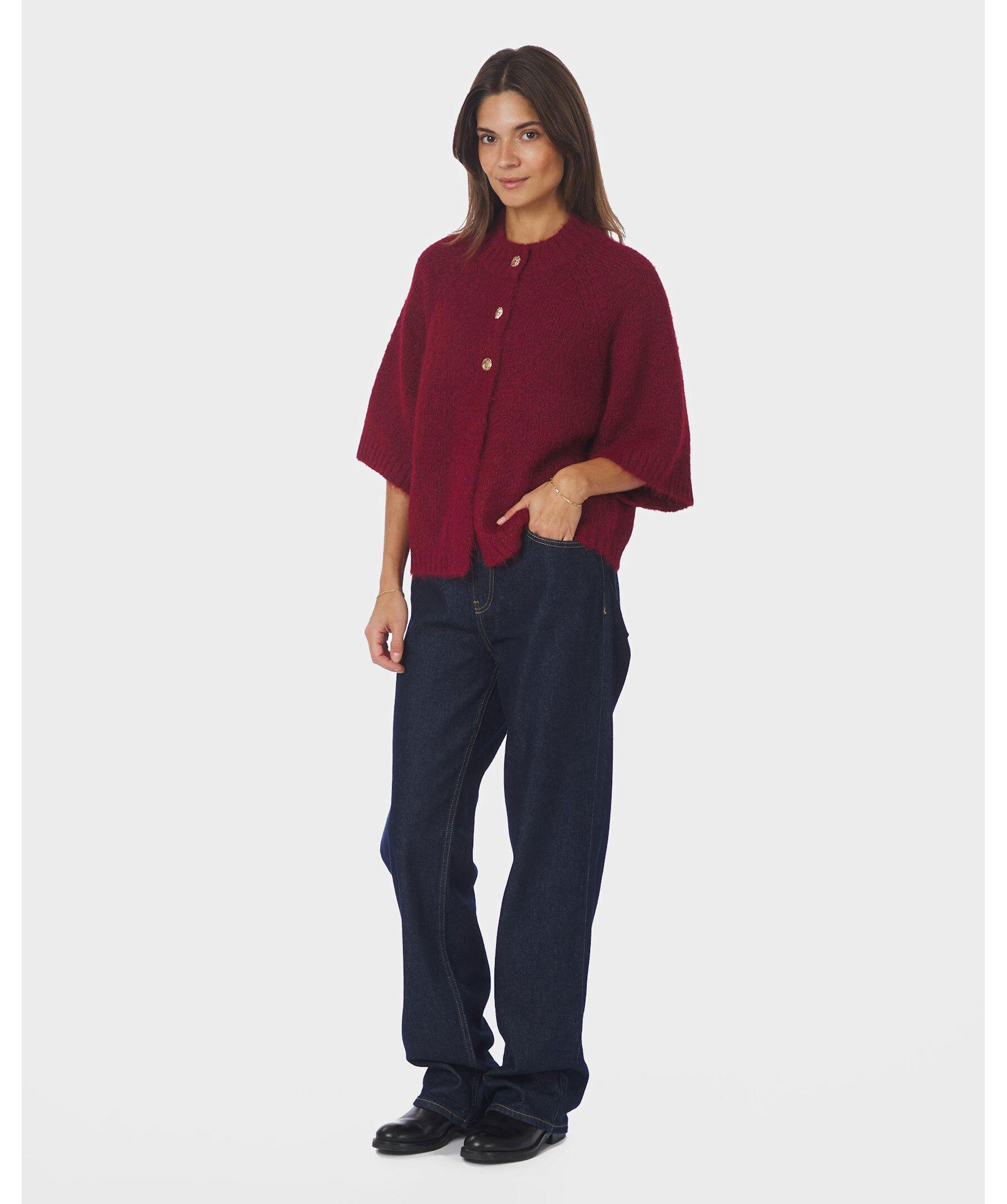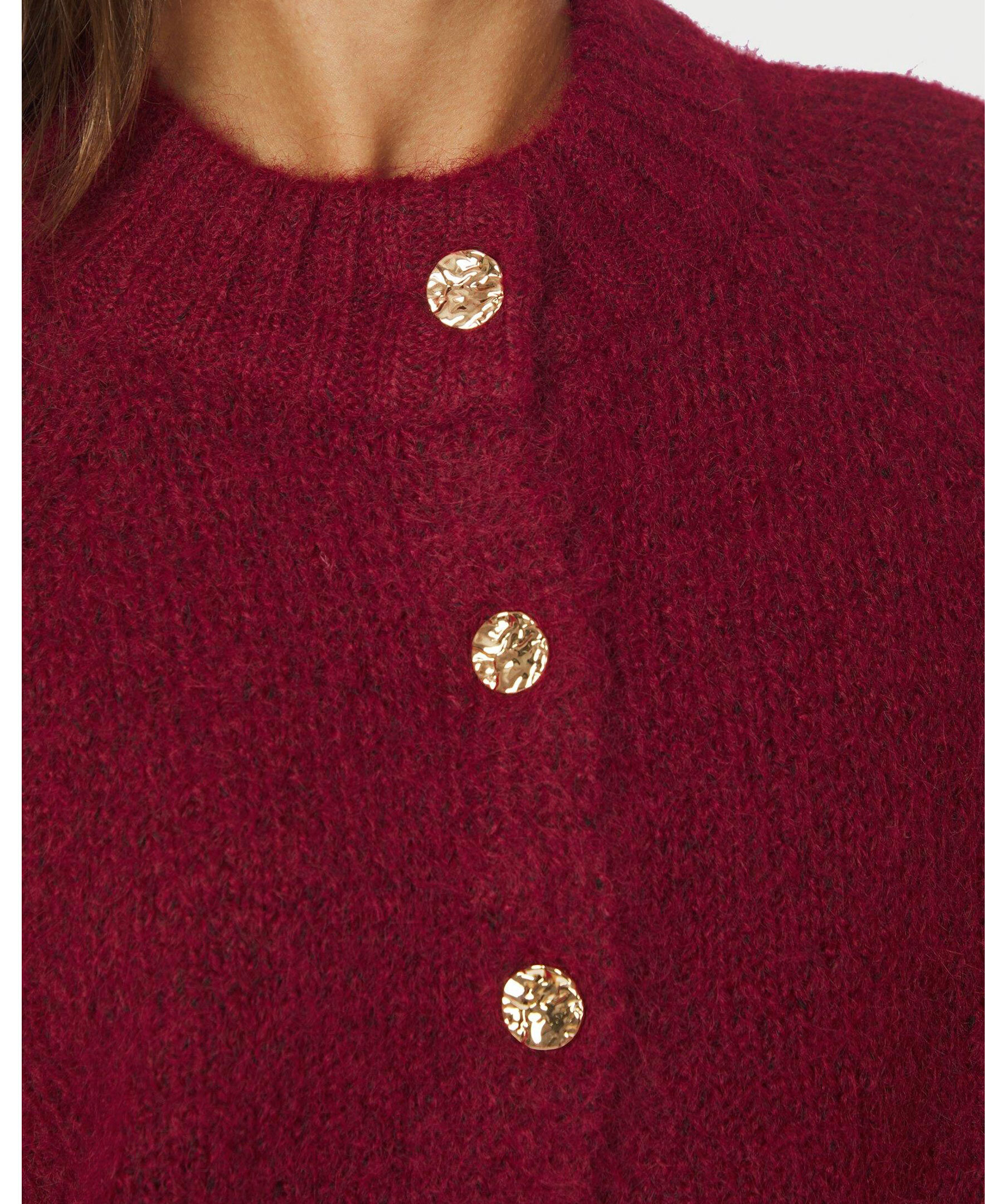 Vinröd cardigan från Neo Noir. Stickad i en mjuk, beige melerad kvalitet som ger ett varmt och ombonat intryck. Den har en boxig, något kortare passform med vida ärmar och tre dekorativa knappar framtill som ger en elegant touch. Ett perfekt lagerplagg för kyligare dagar, lika fin över en klänning som till jeans.