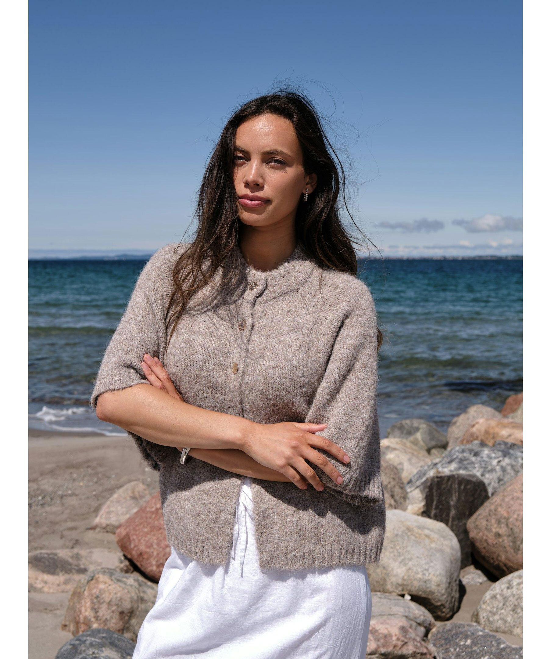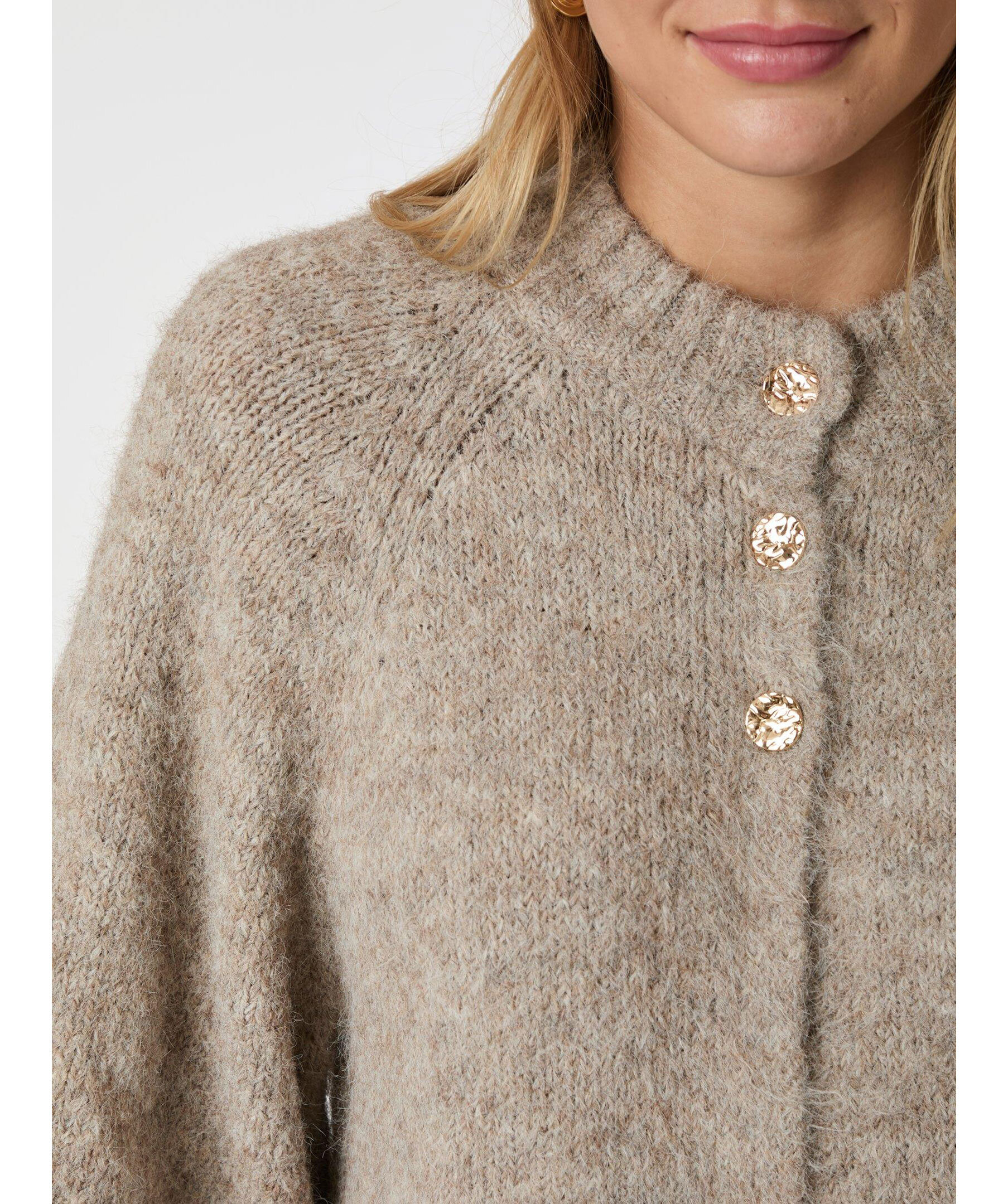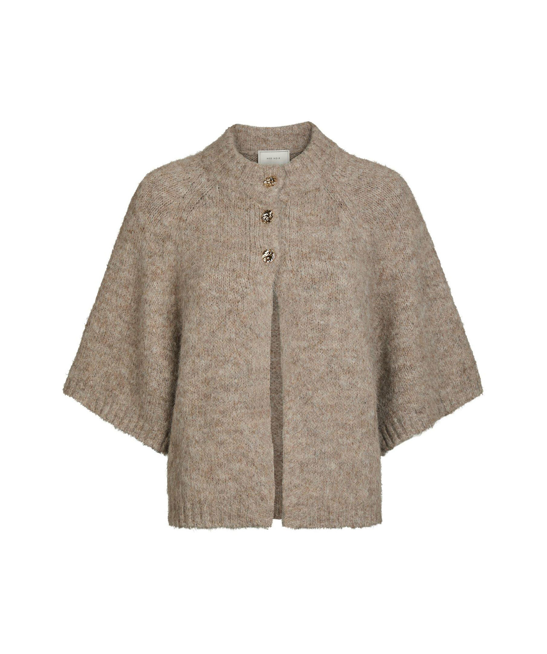 Beige cardigan från Neo Noir. Stickad i en mjuk, beige melerad kvalitet som ger ett varmt och ombonat intryck. Den har en boxig, något kortare passform med vida ärmar och tre dekorativa knappar framtill som ger en elegant touch. Ett perfekt lagerplagg för kyligare dagar, lika fin över en klänning som till jeans.
