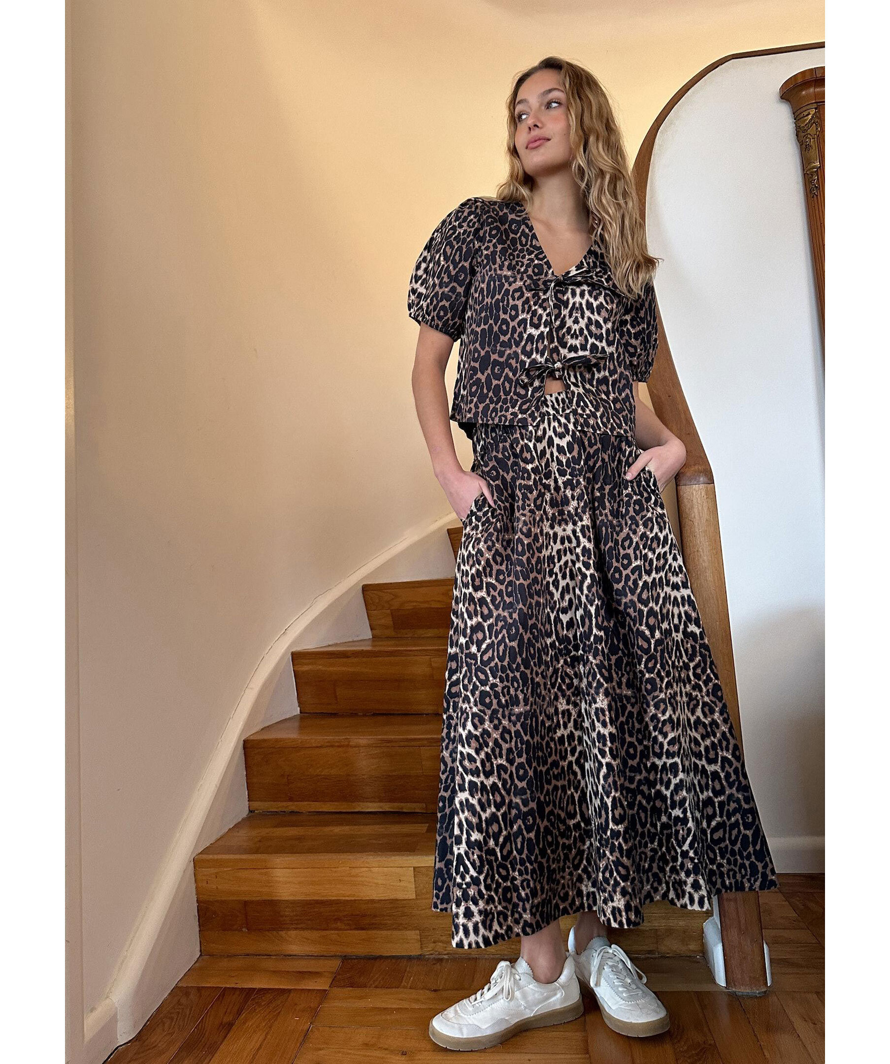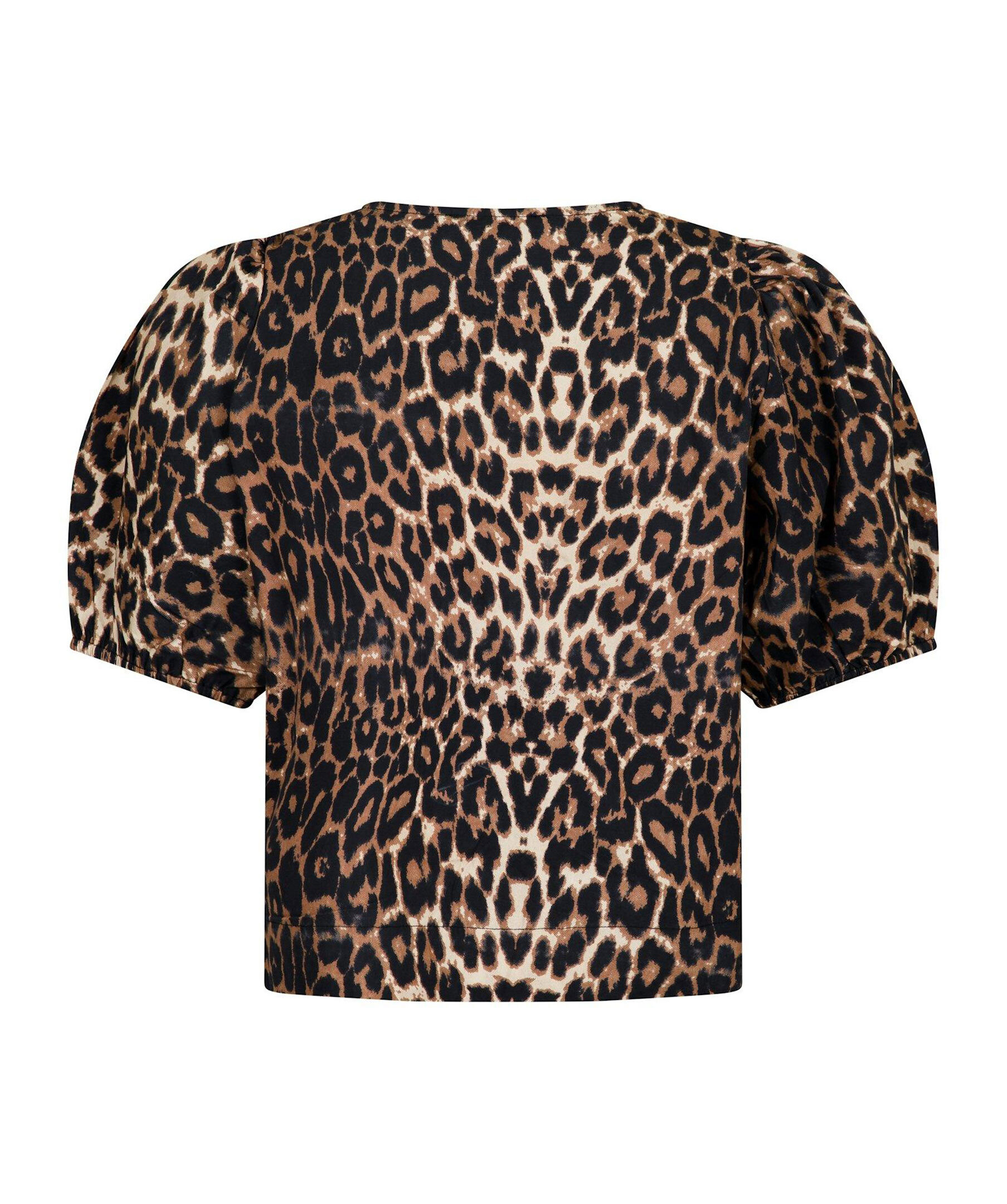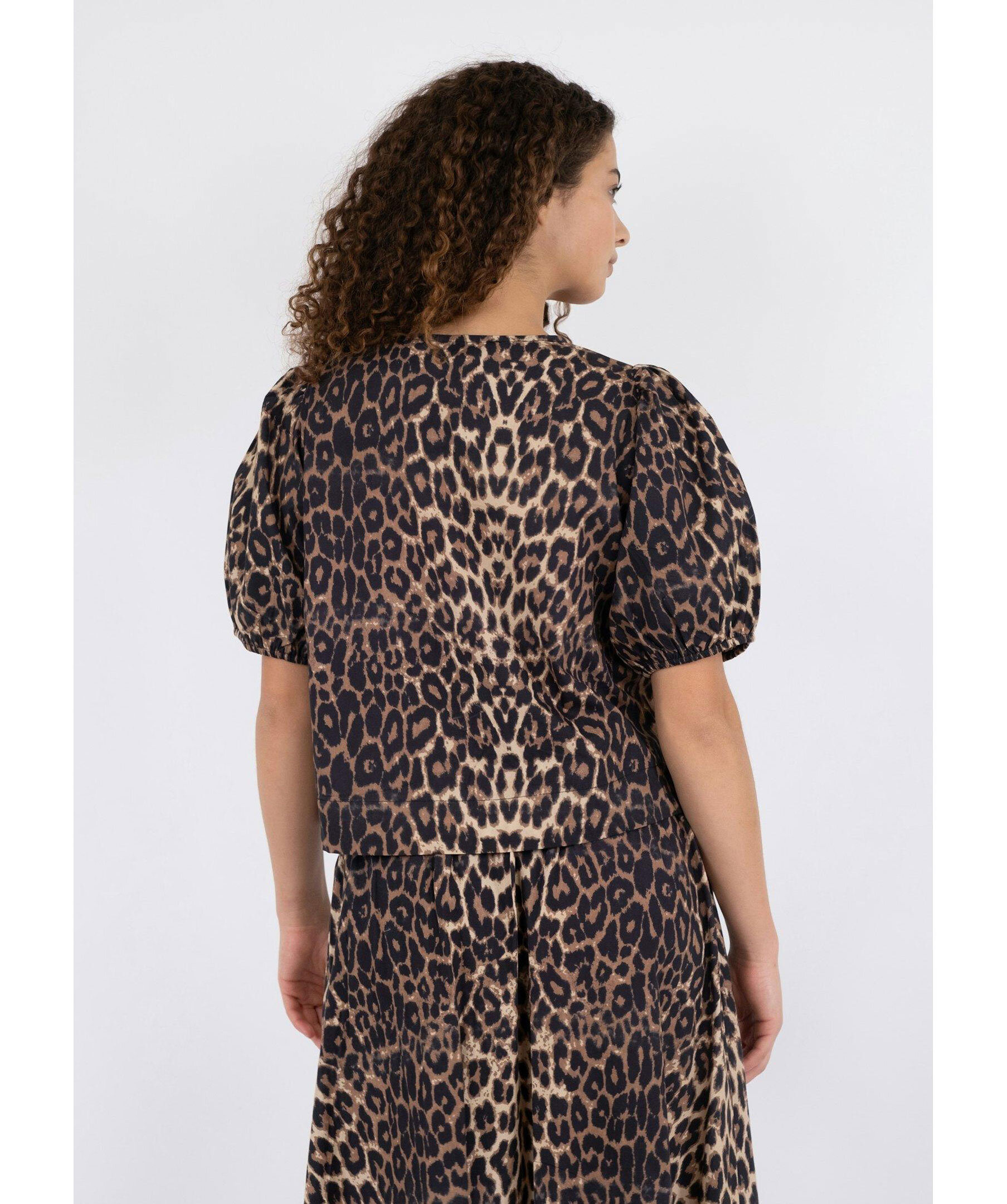 Leopardmönstrad blus från Neo Noir. Blusen har korta, elastiska puffärmar och knytband framtill. Tillverkad i krispig poplinkvalitet.