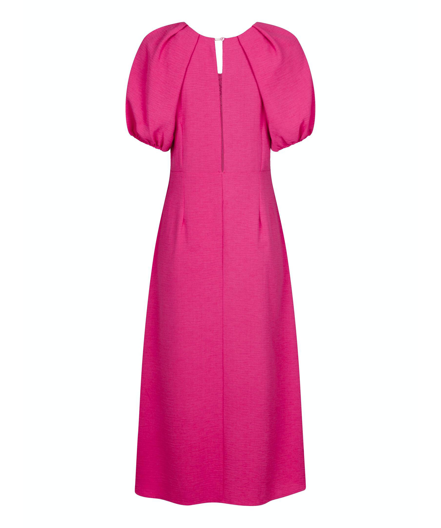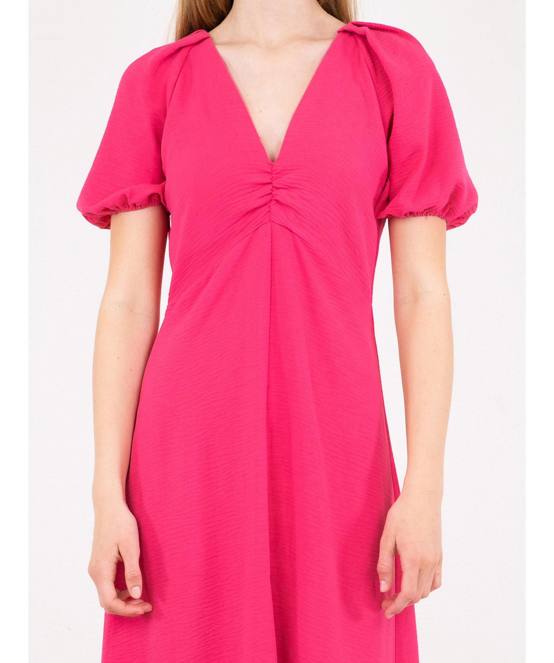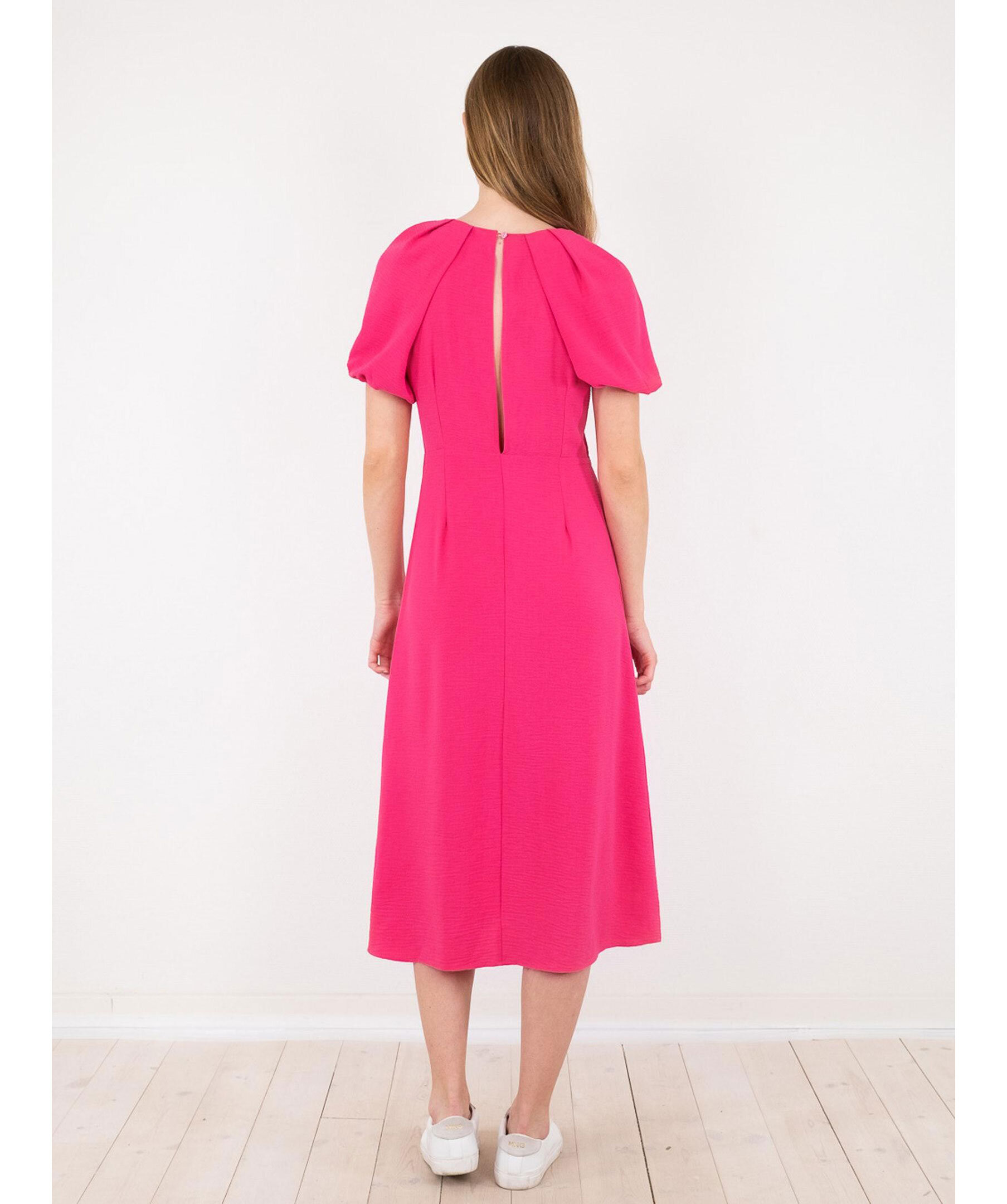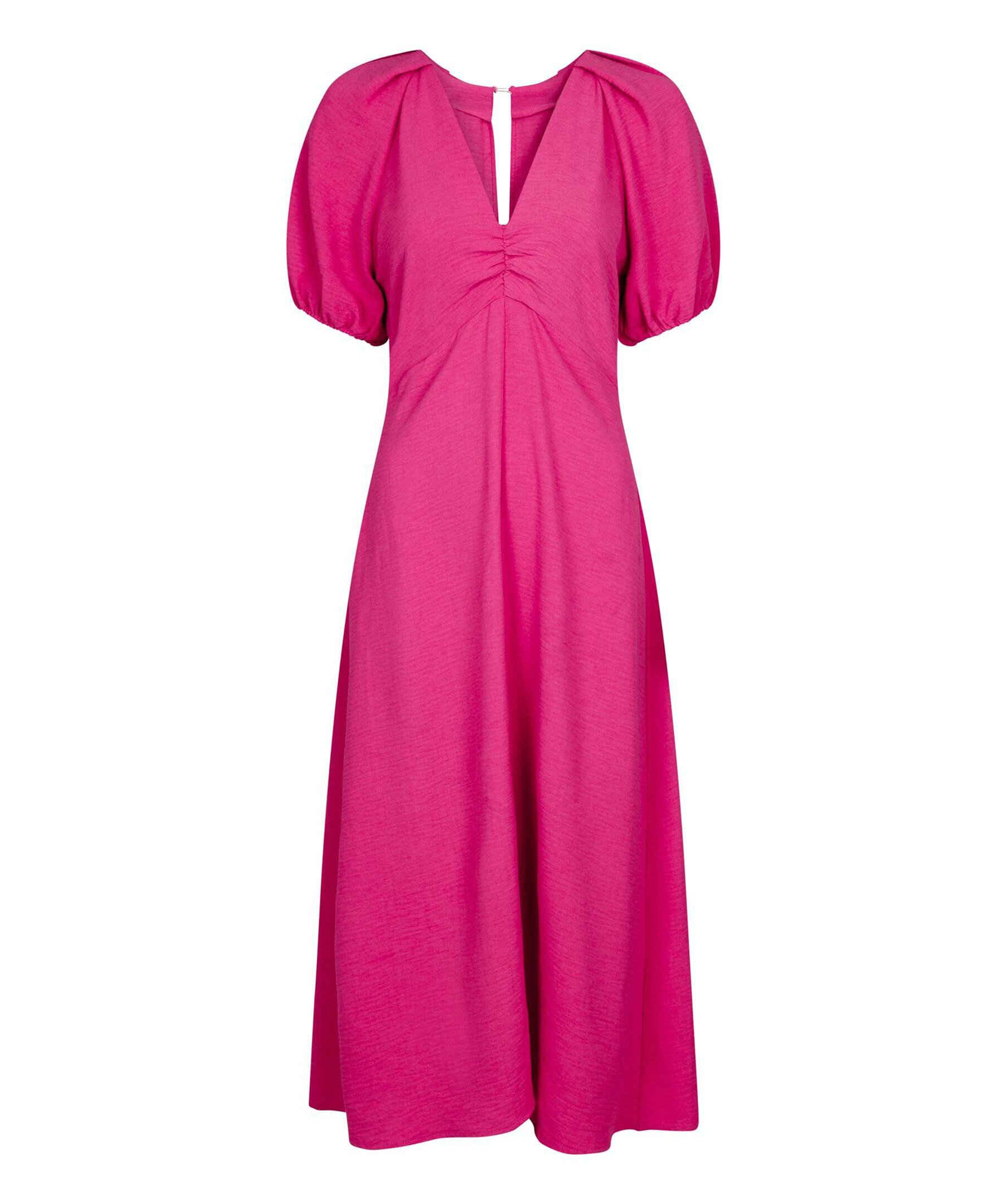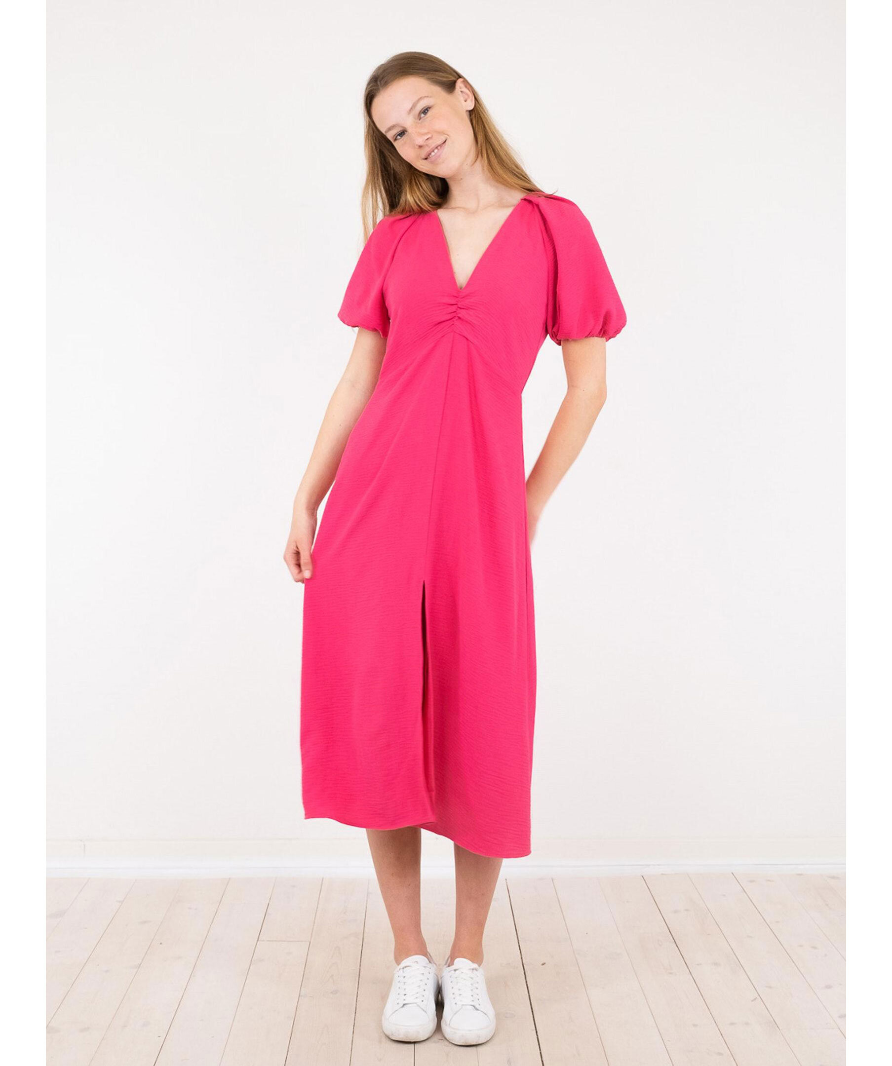 Ceriserosa midi-klänning från Neo Noir. Klänningen har korta puffärmar och en v-ringad urringning. Slits framtill. Dold dragkedja och knappar baktill.