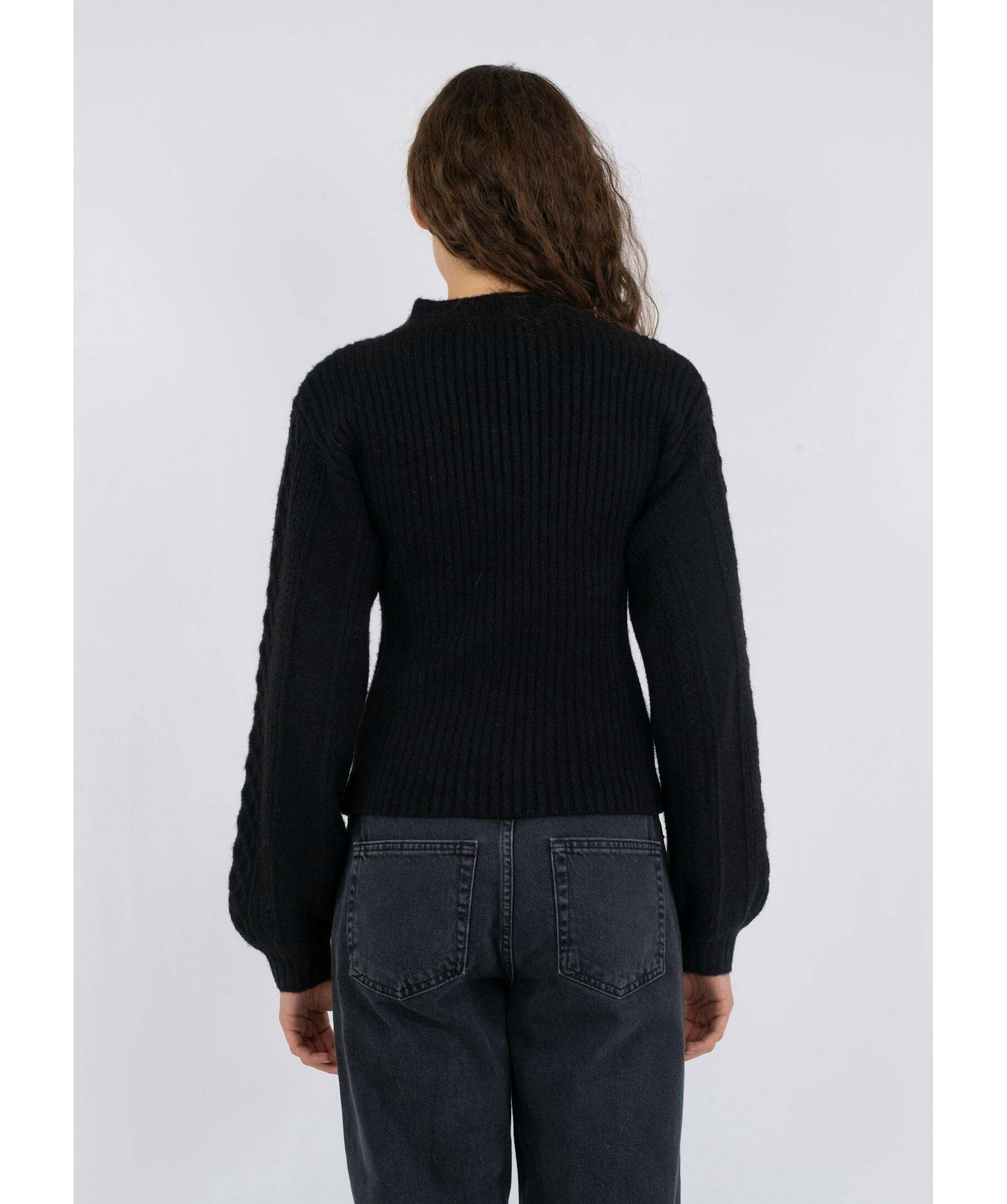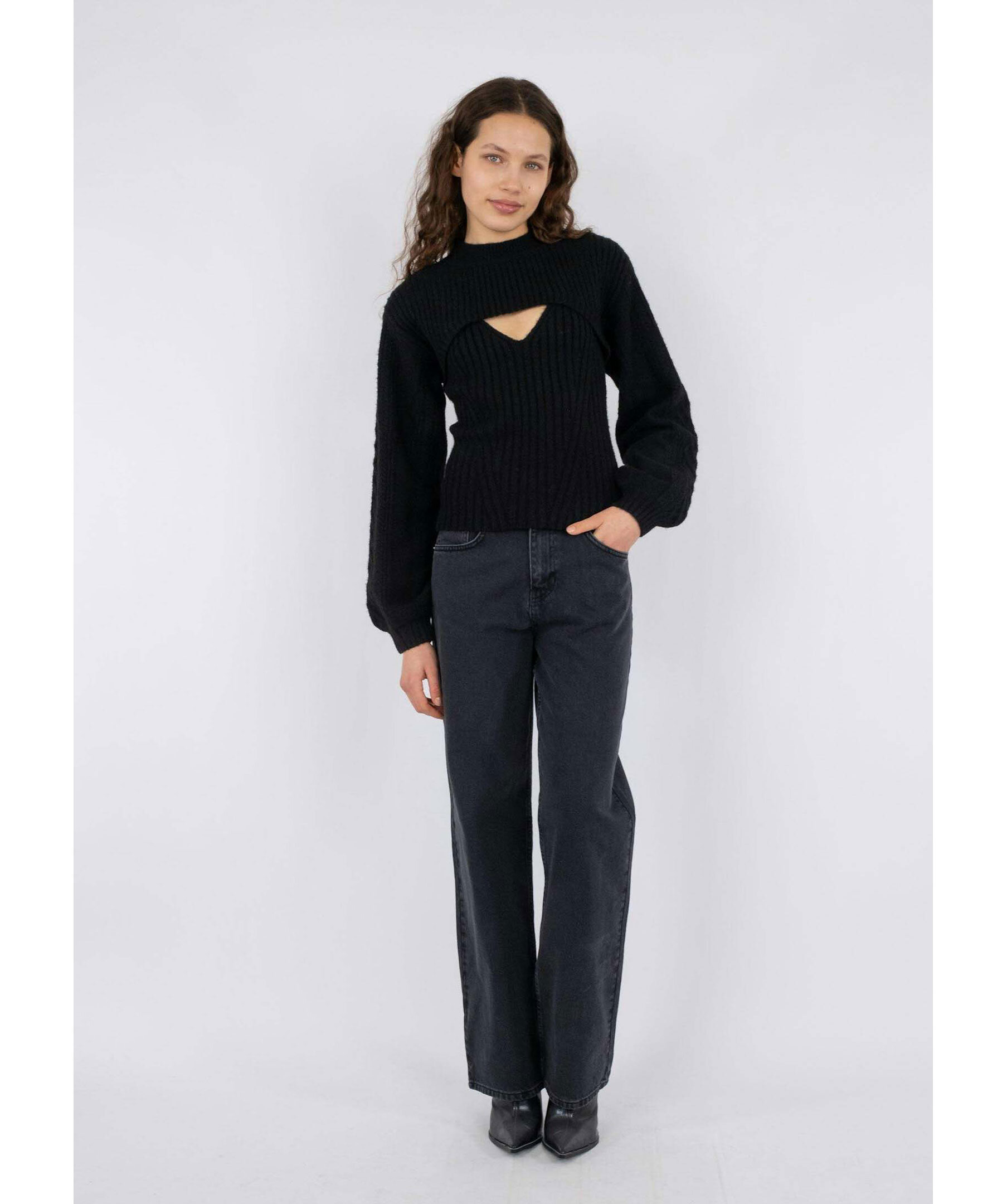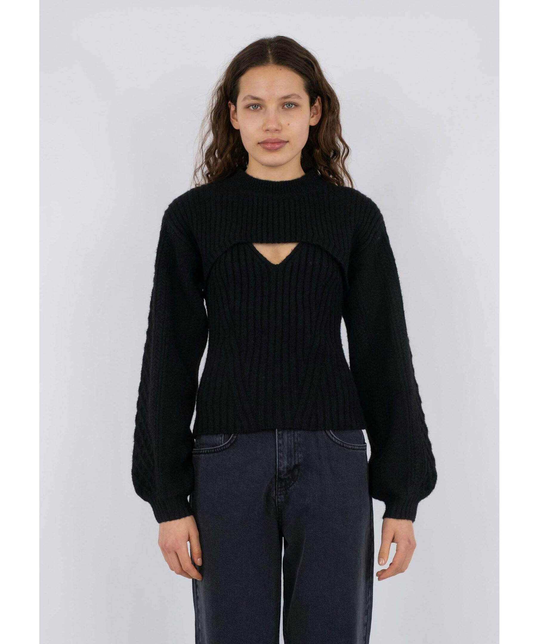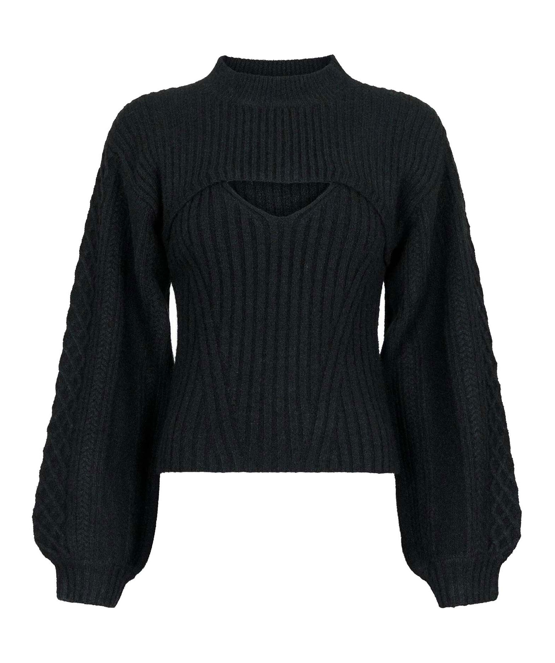 Svart, stickad tröja med boleroeffekt och utskärningsdetaljer på bröstet från Neo Noir. Tröjan har kabeldetaljer, breda muddar och en figursydd kropp. Tillverkad i en polyester- och ullblandning.