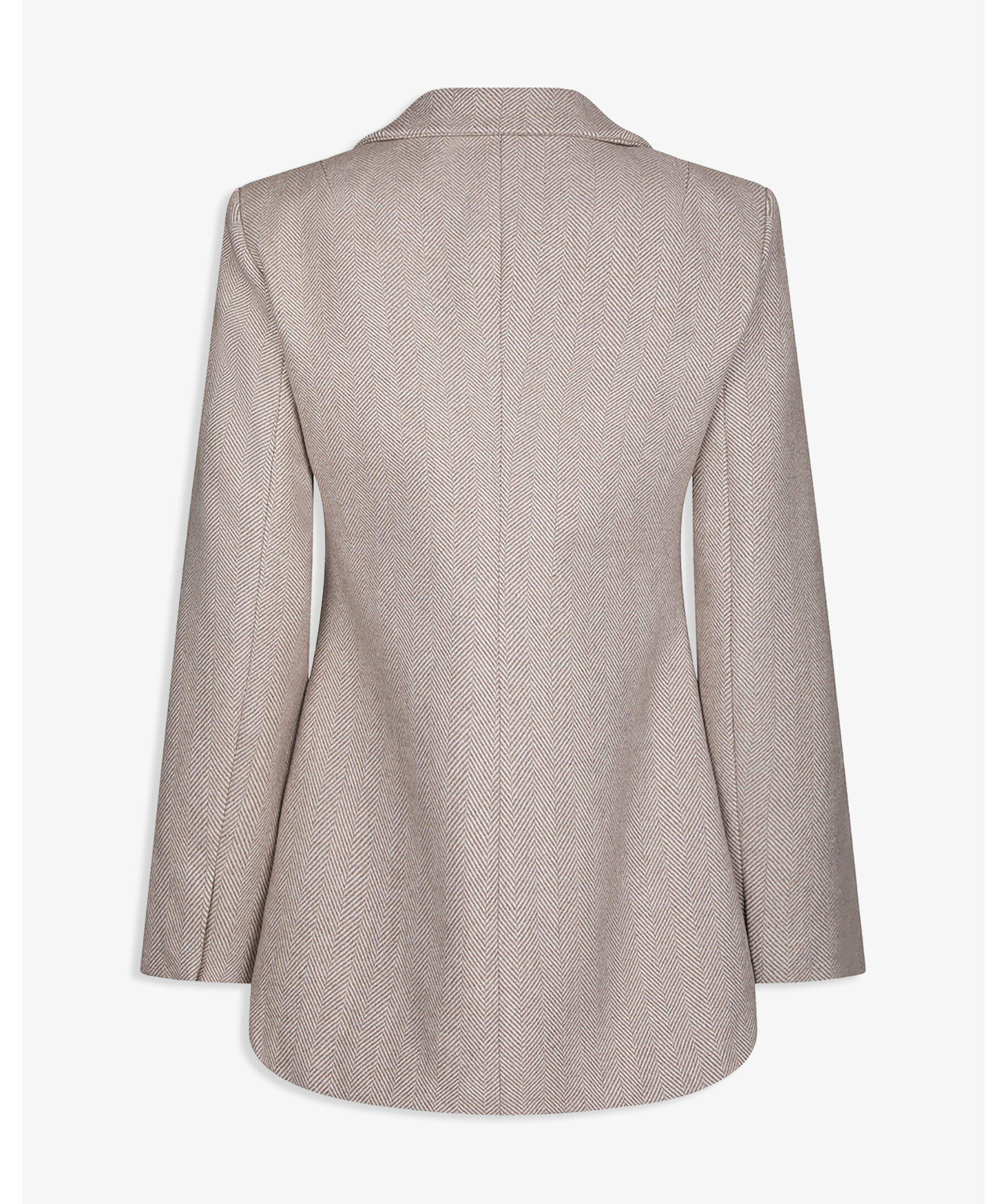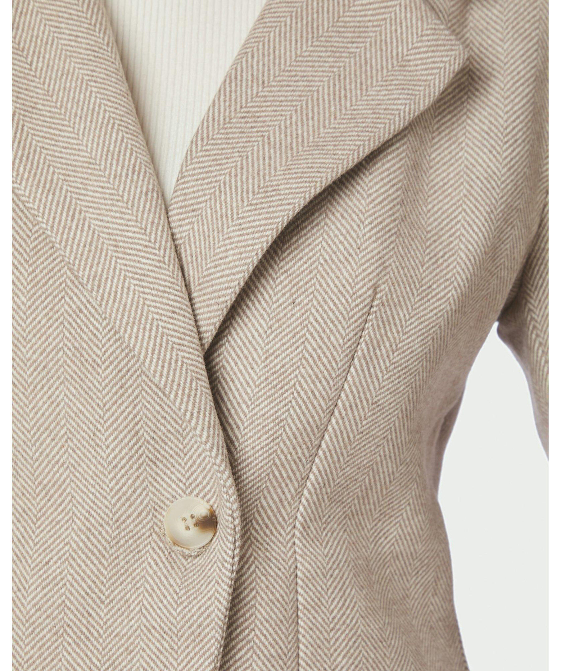 Skräddarsydd blazer med axelvaddar, smal midja och sned stängning. Blazern kommer i en fin herringbone-kvalitet. Modellen är 176 cm lång och bär storlek 36.