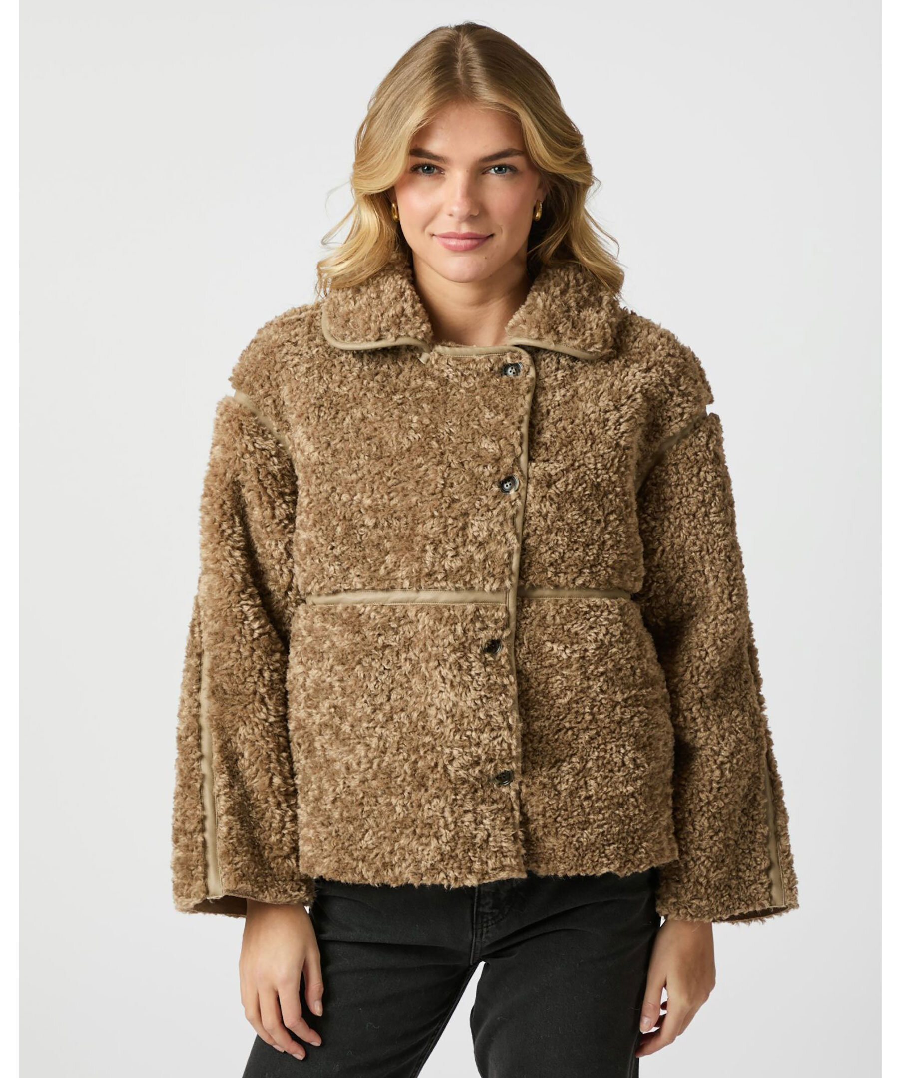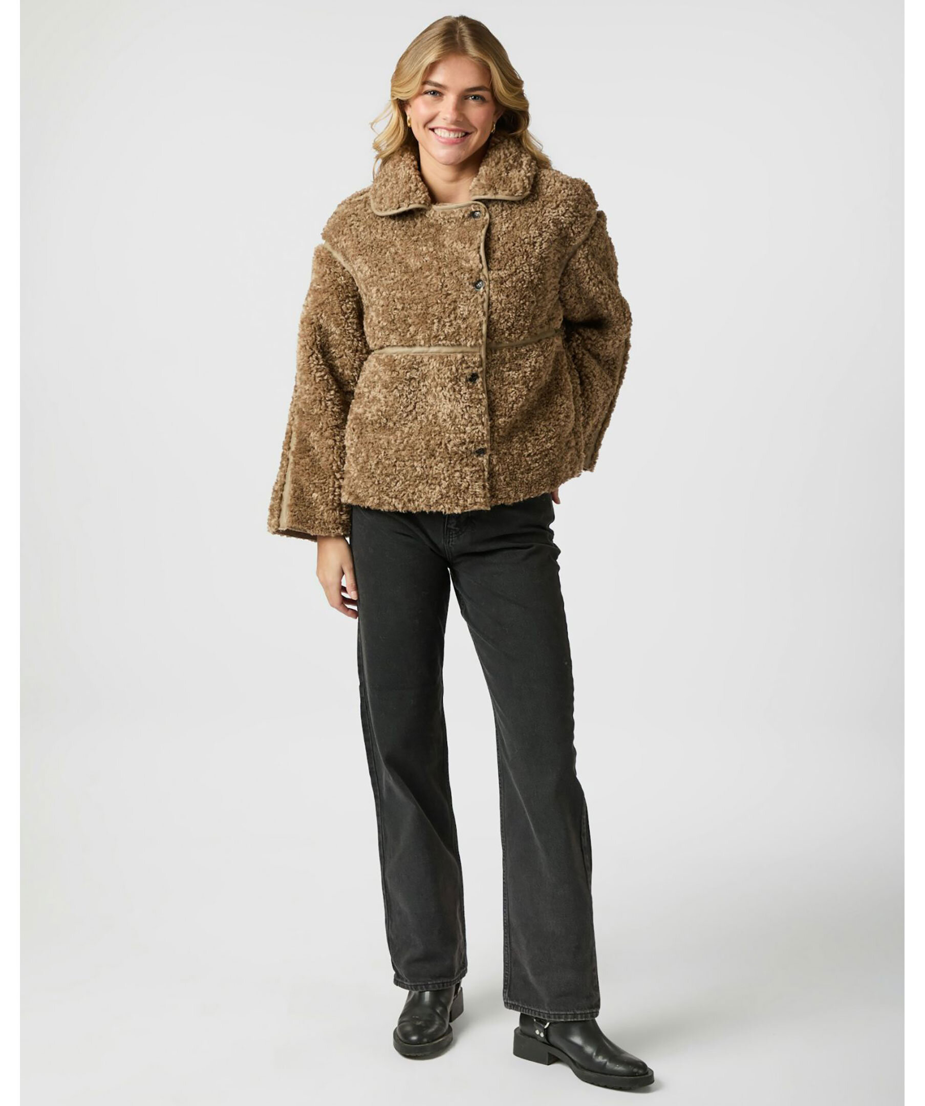Castor Faux Fur Jacket från Neo Noir är en kort, fluffig jacka i taupefärgad konstpäls. Den har en liten krage, fuskpskinnsdetaljer och knappar framtill. En stilren jacka som passar perfekt för höstens city‑looks.