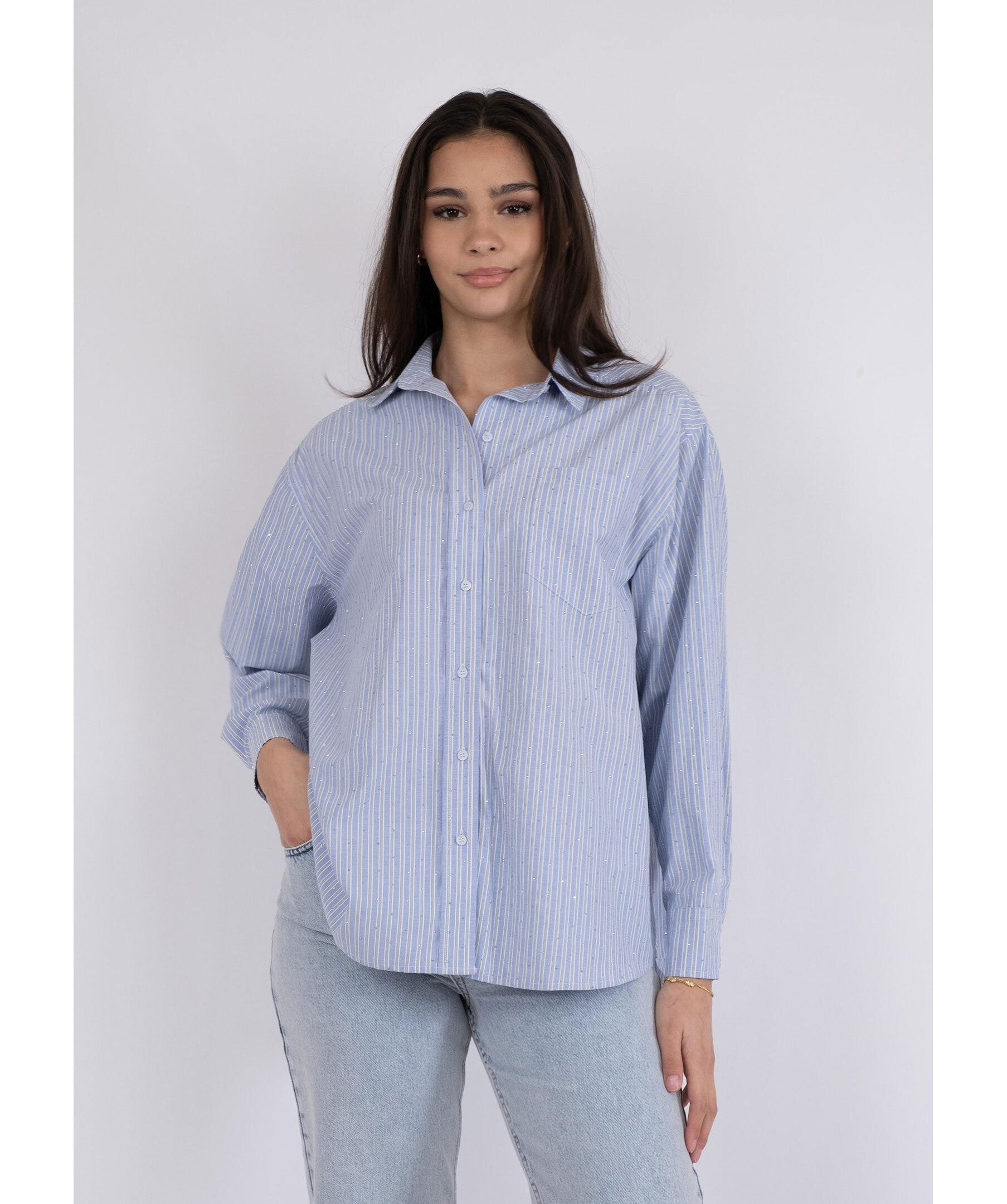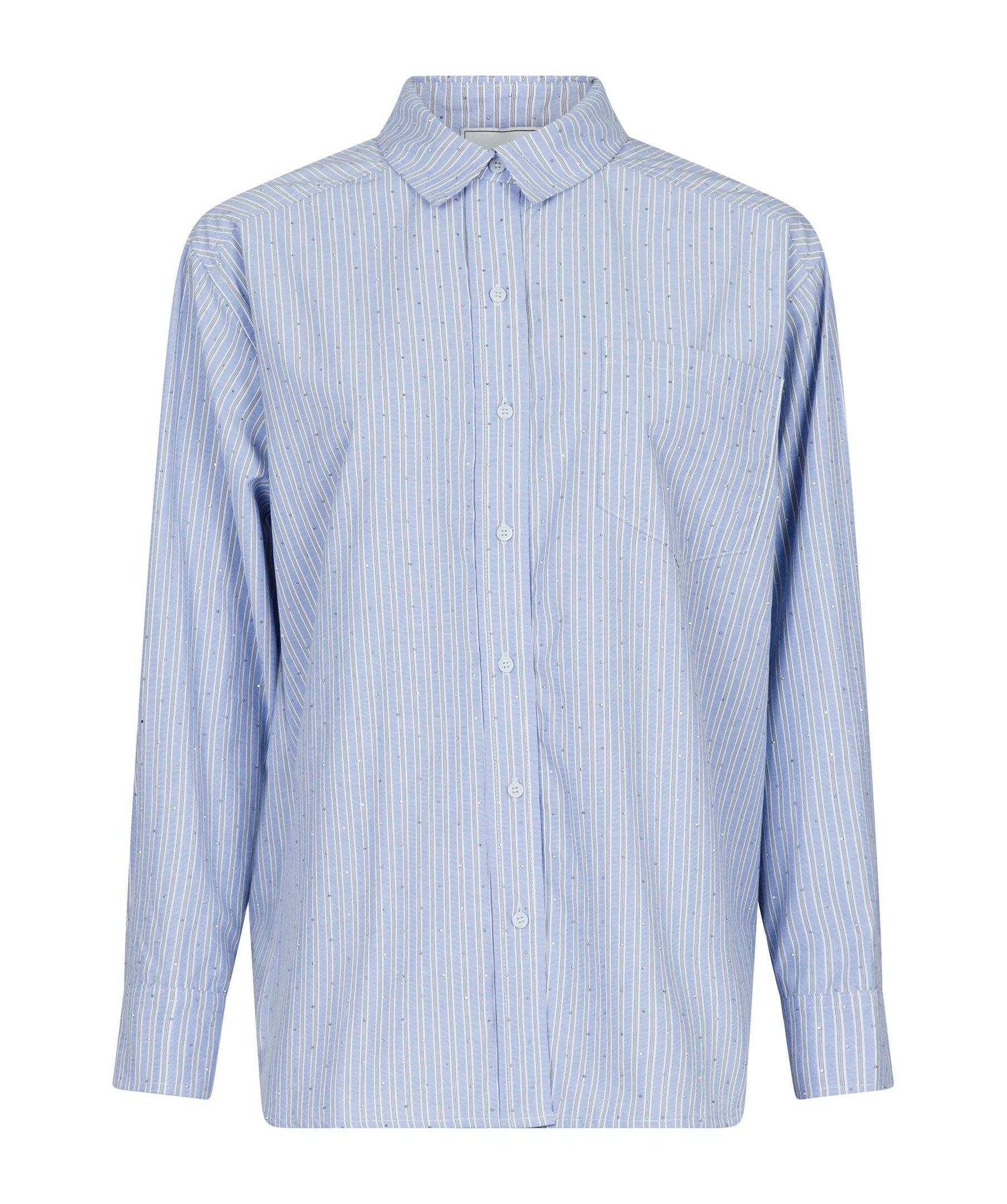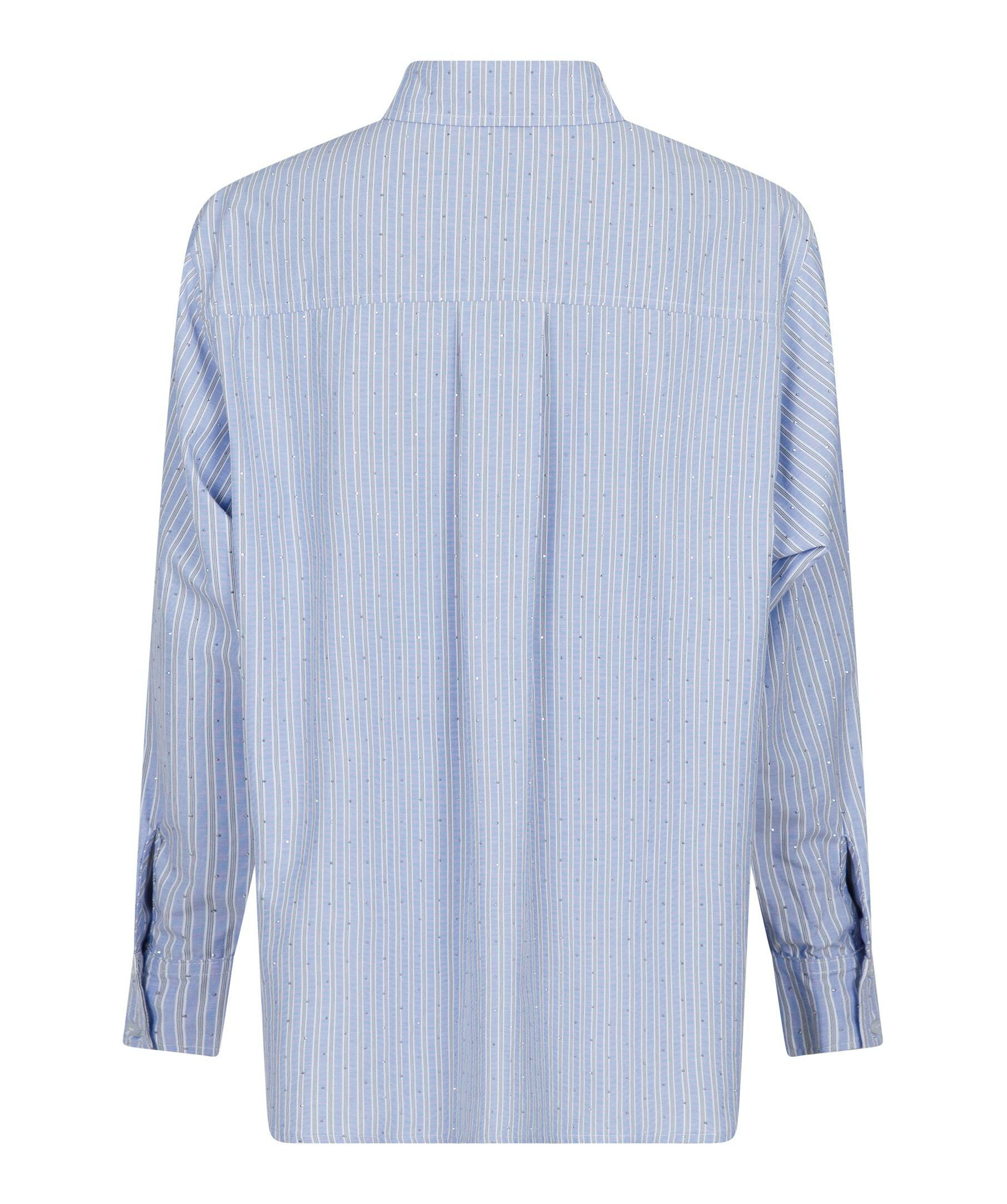 Blå, randig skjorta från Neo Noir. Tillverkad i en poplinkvalitet med små glitterstenar. Button-down krage framtill med en bröstficka. Oversized passform.