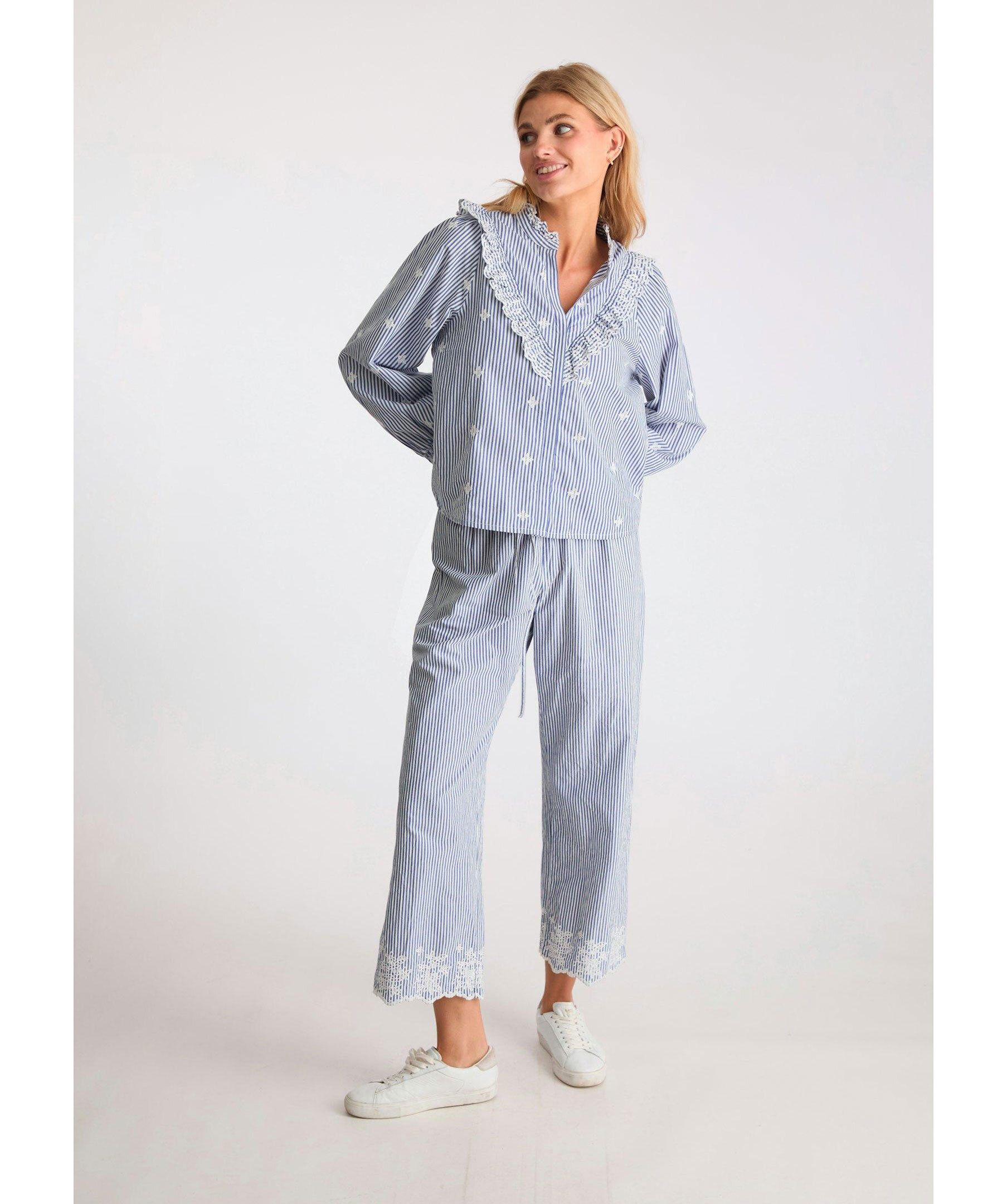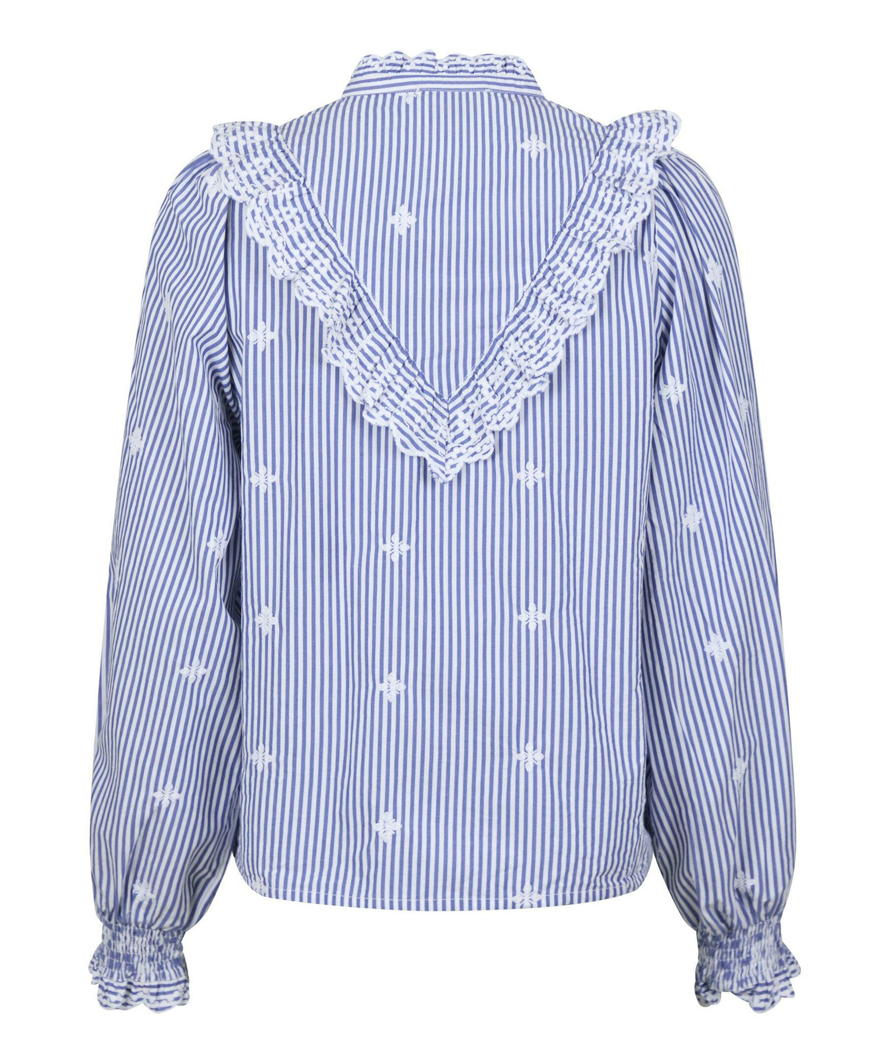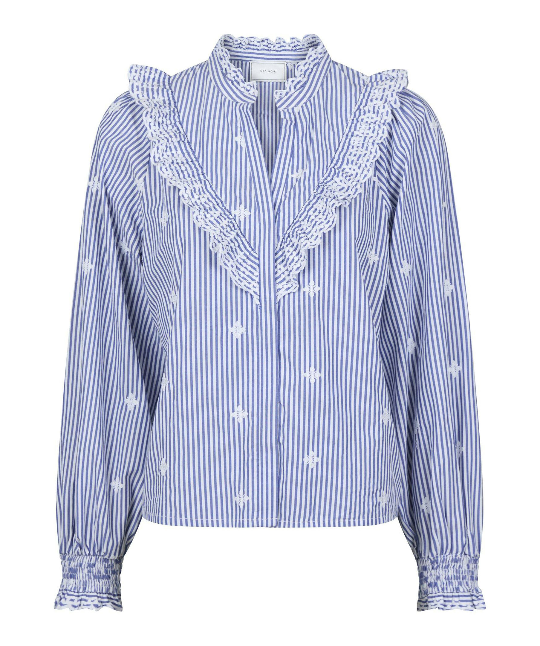 Blå och vit randig skjortblus med broderidetaljer från Neo Noir. Blusen har ballongärmar med elastiska muddar, dolda knappar framtill med volangdetalj vid hals, bröst och ärmslut. Tillverkad i bomull.