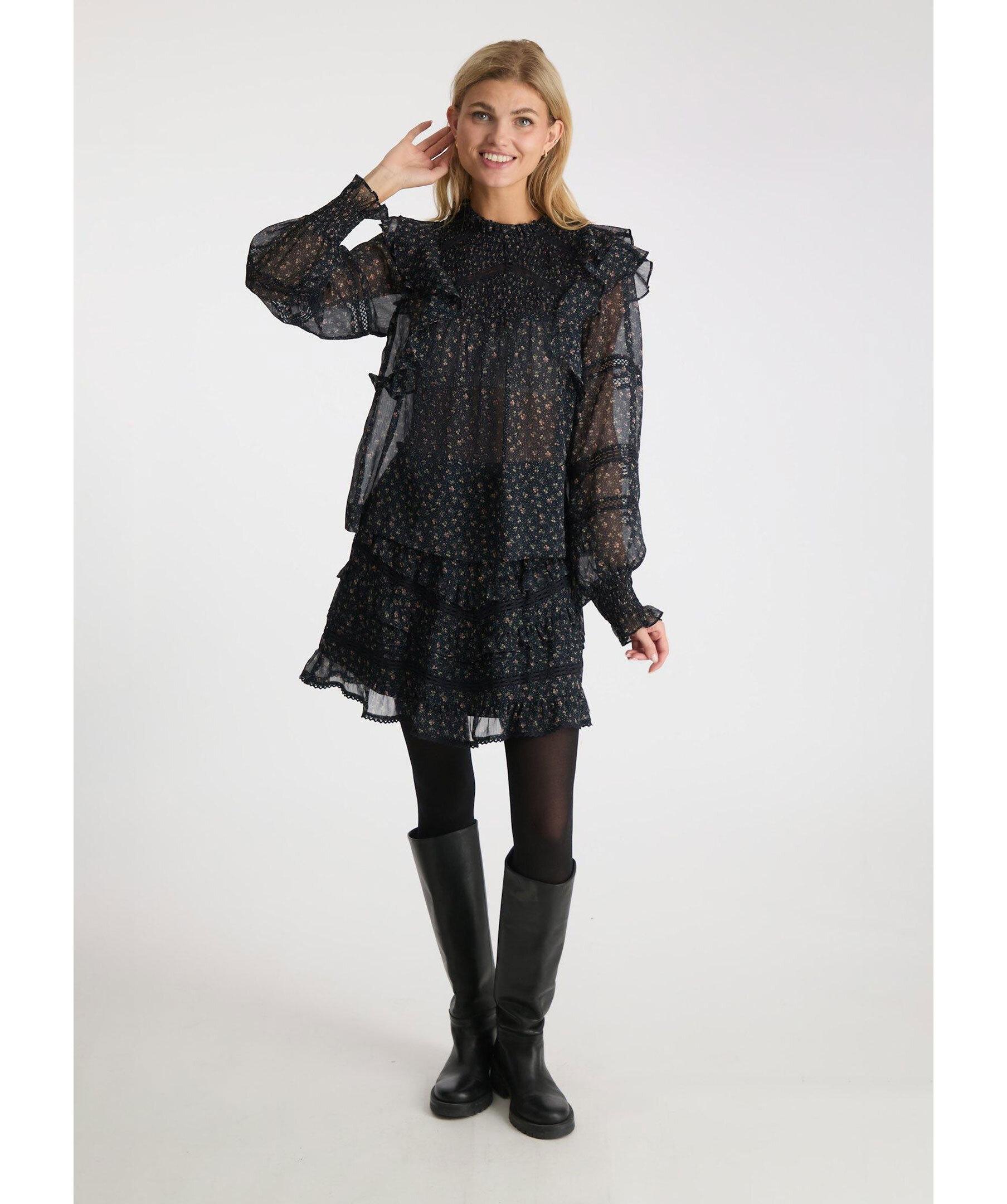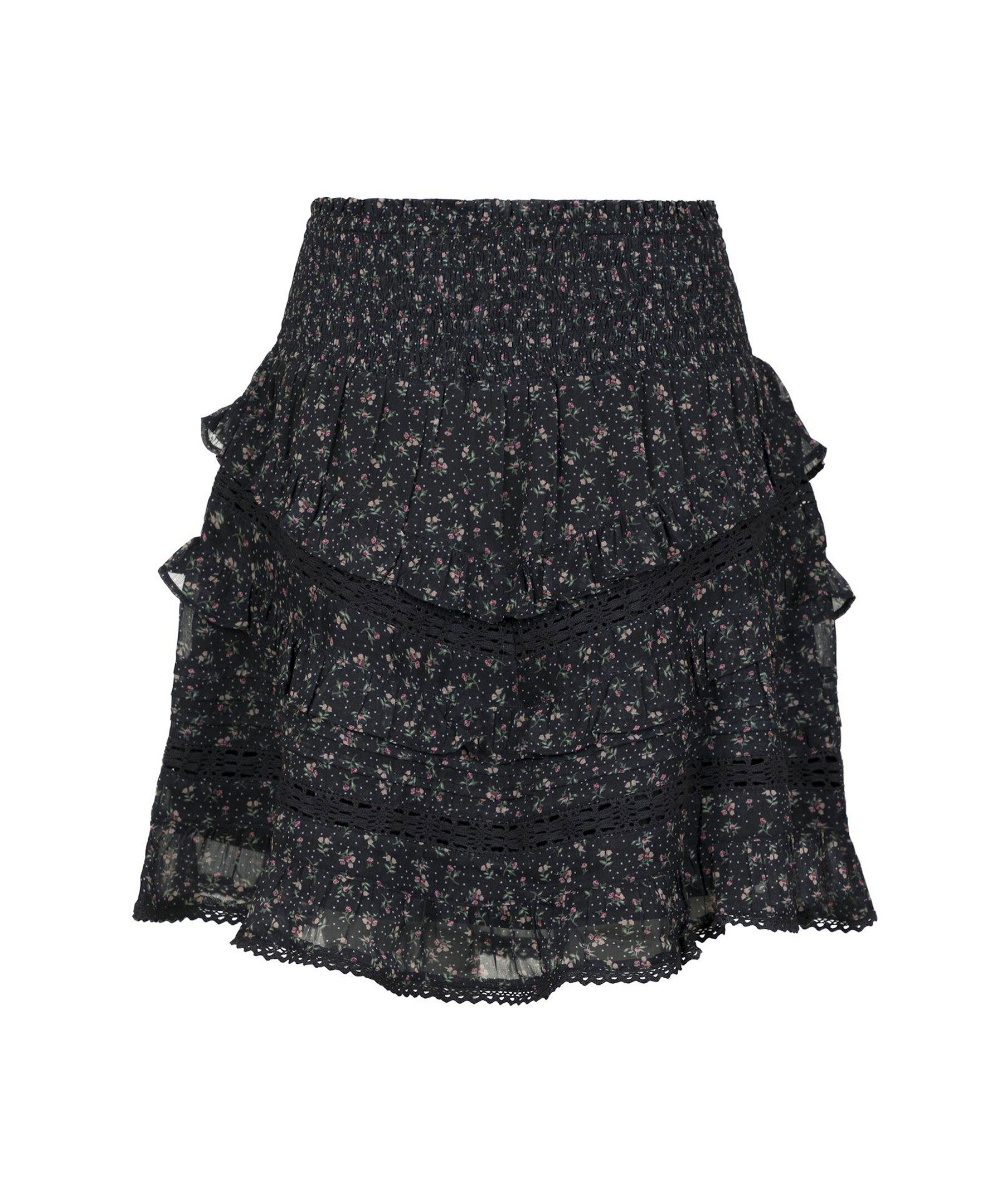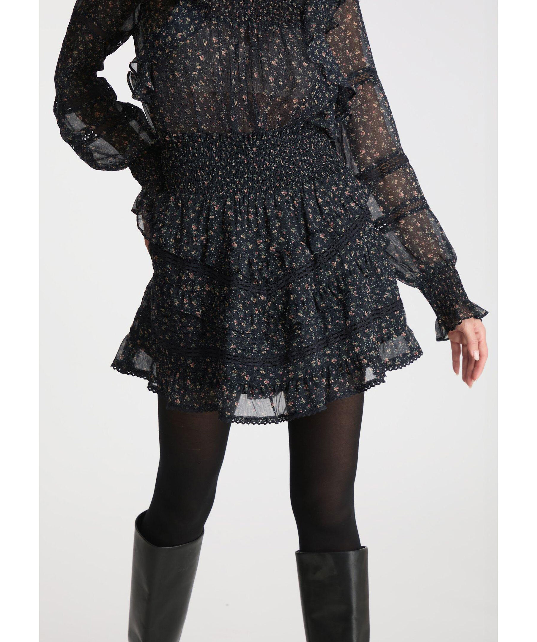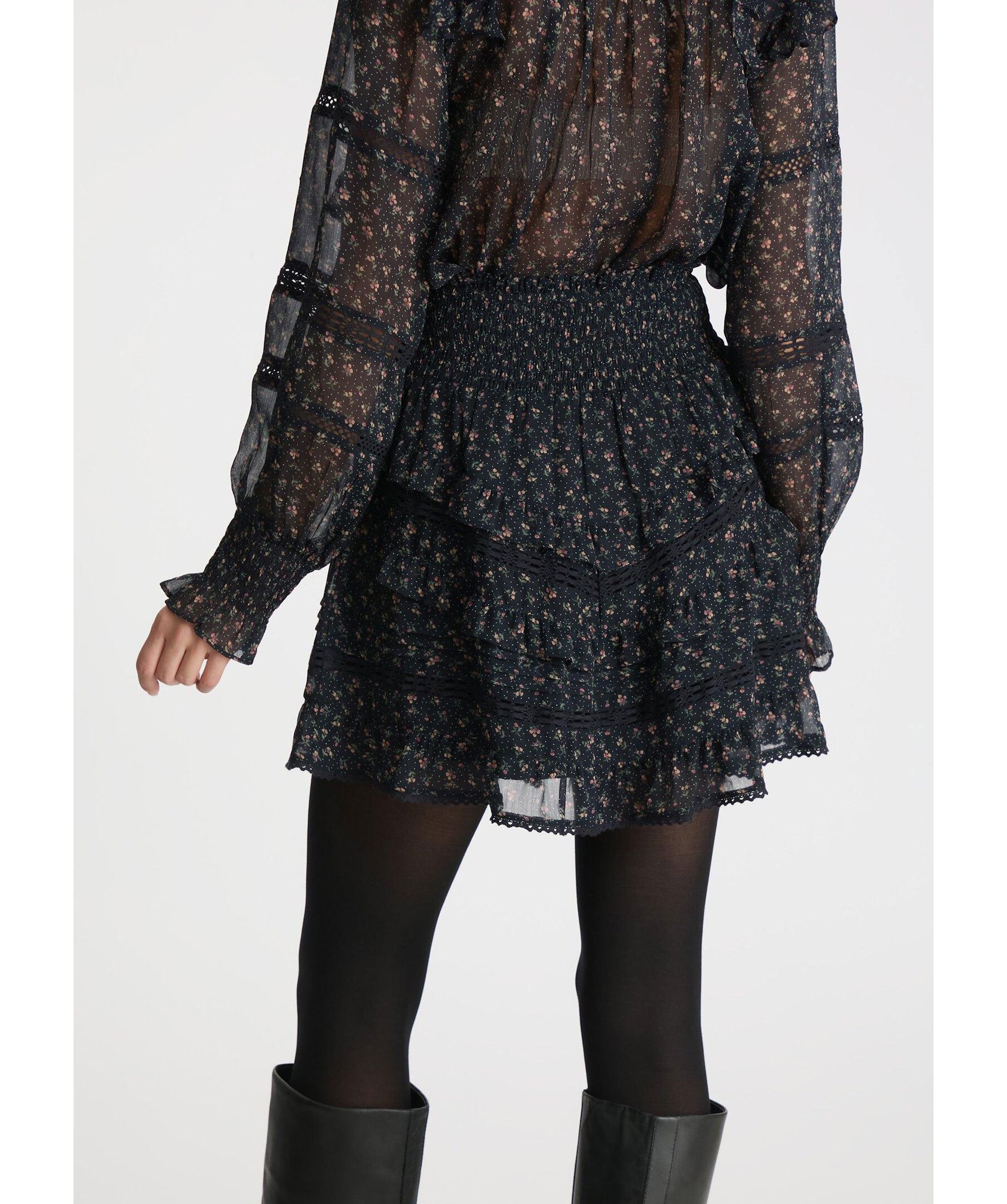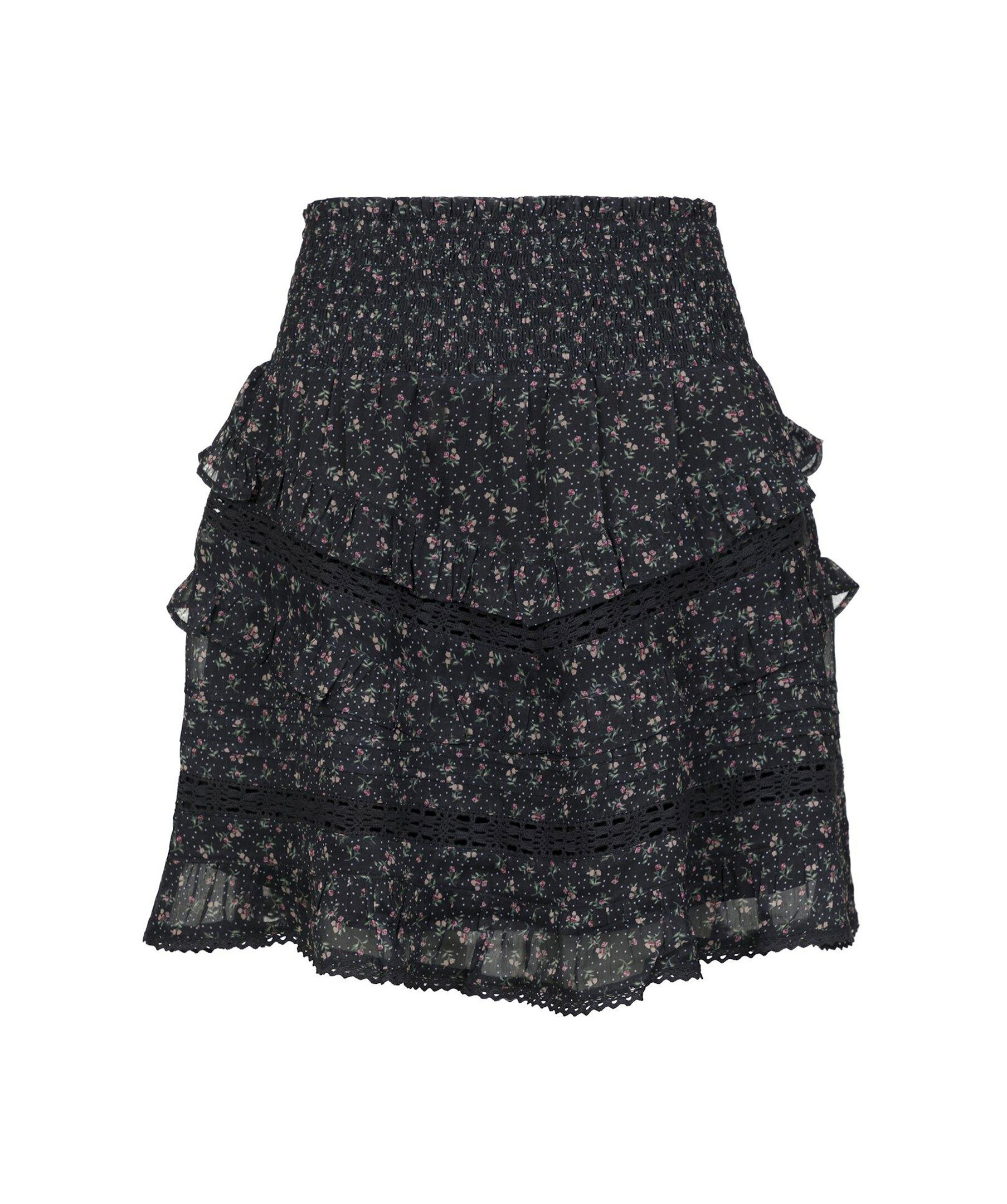 Svart minikjol med blommönster från Neo Noir. Kjolen har elastisk midja, veck och små volanger. Tillverkad i polyester.