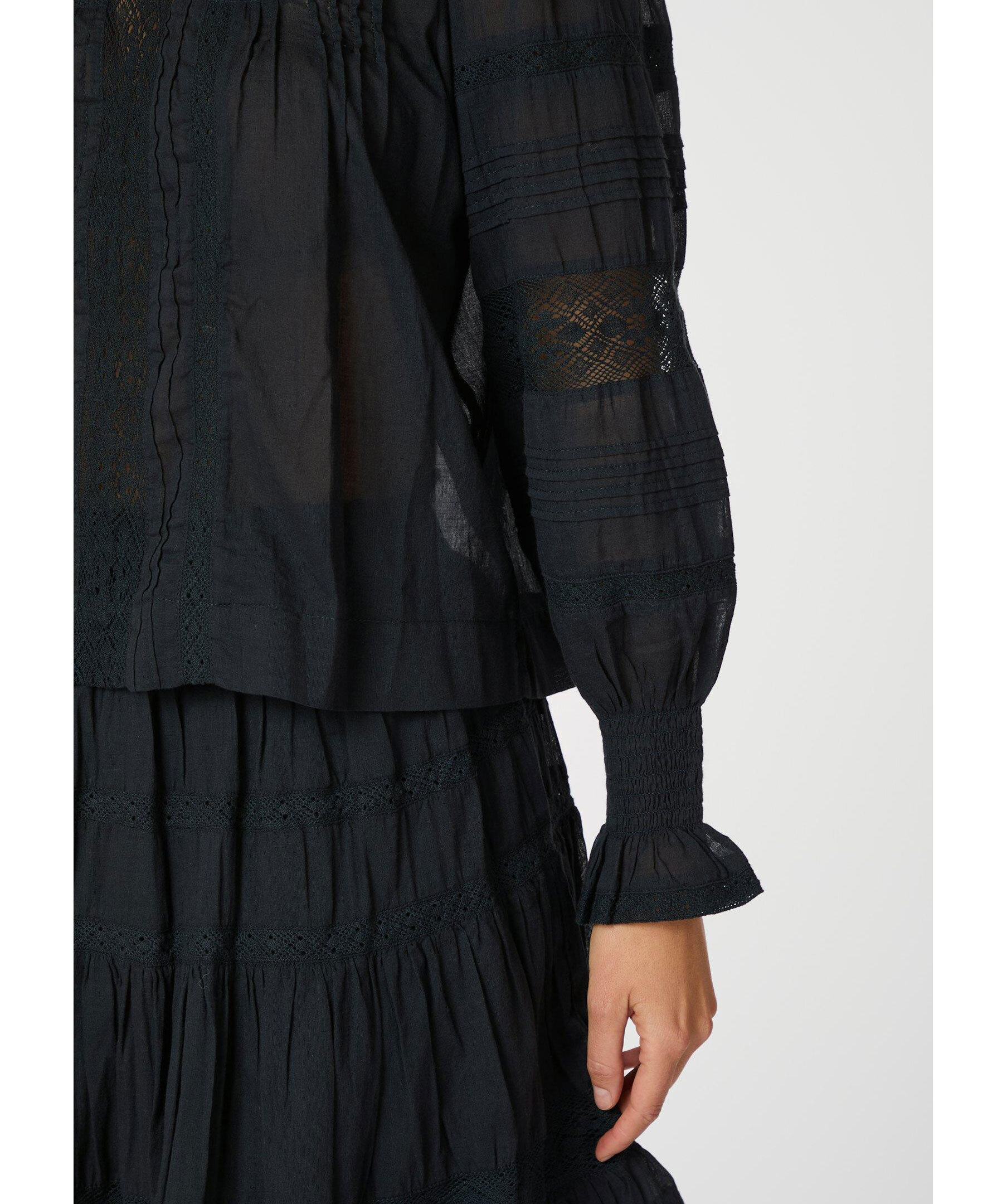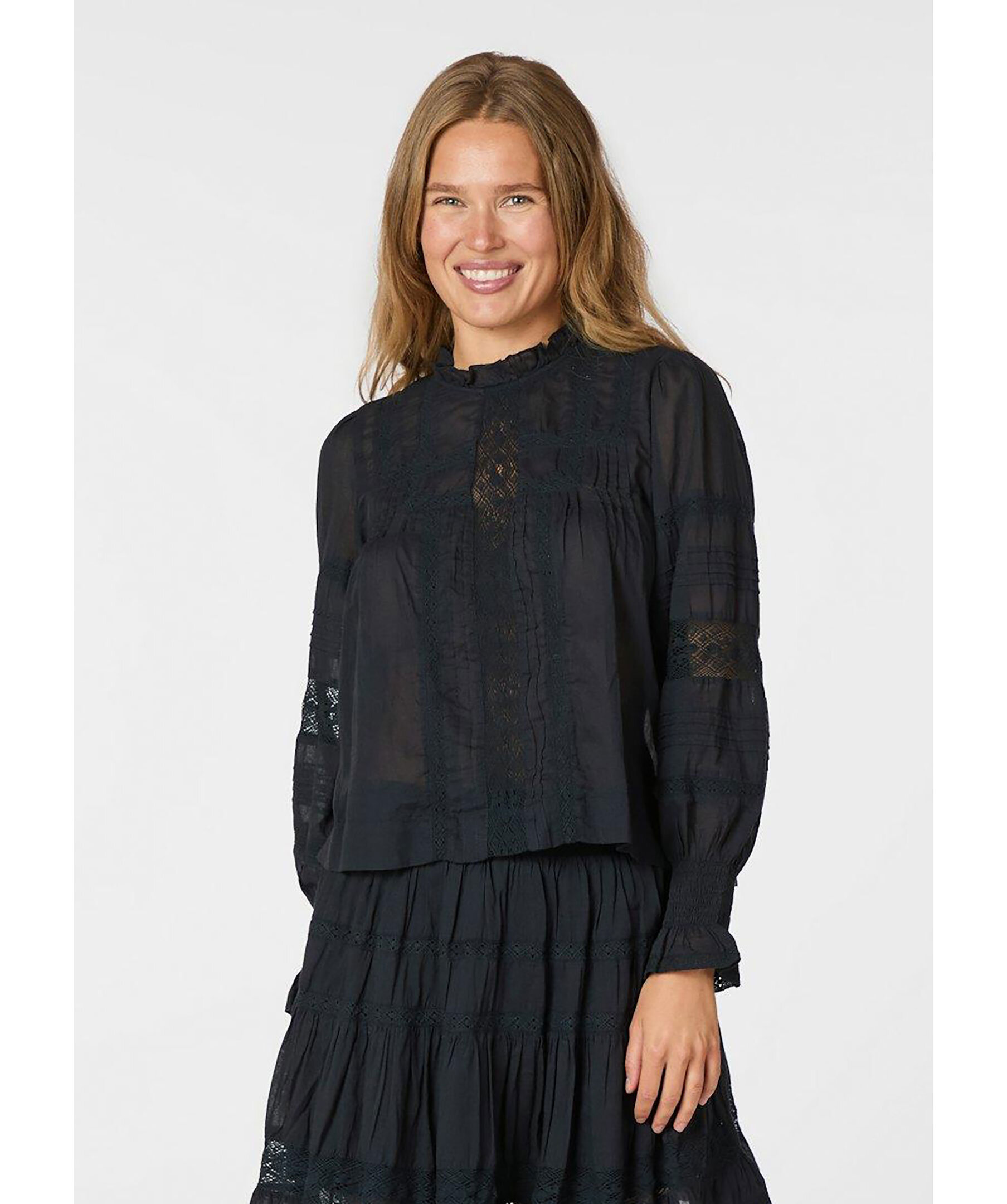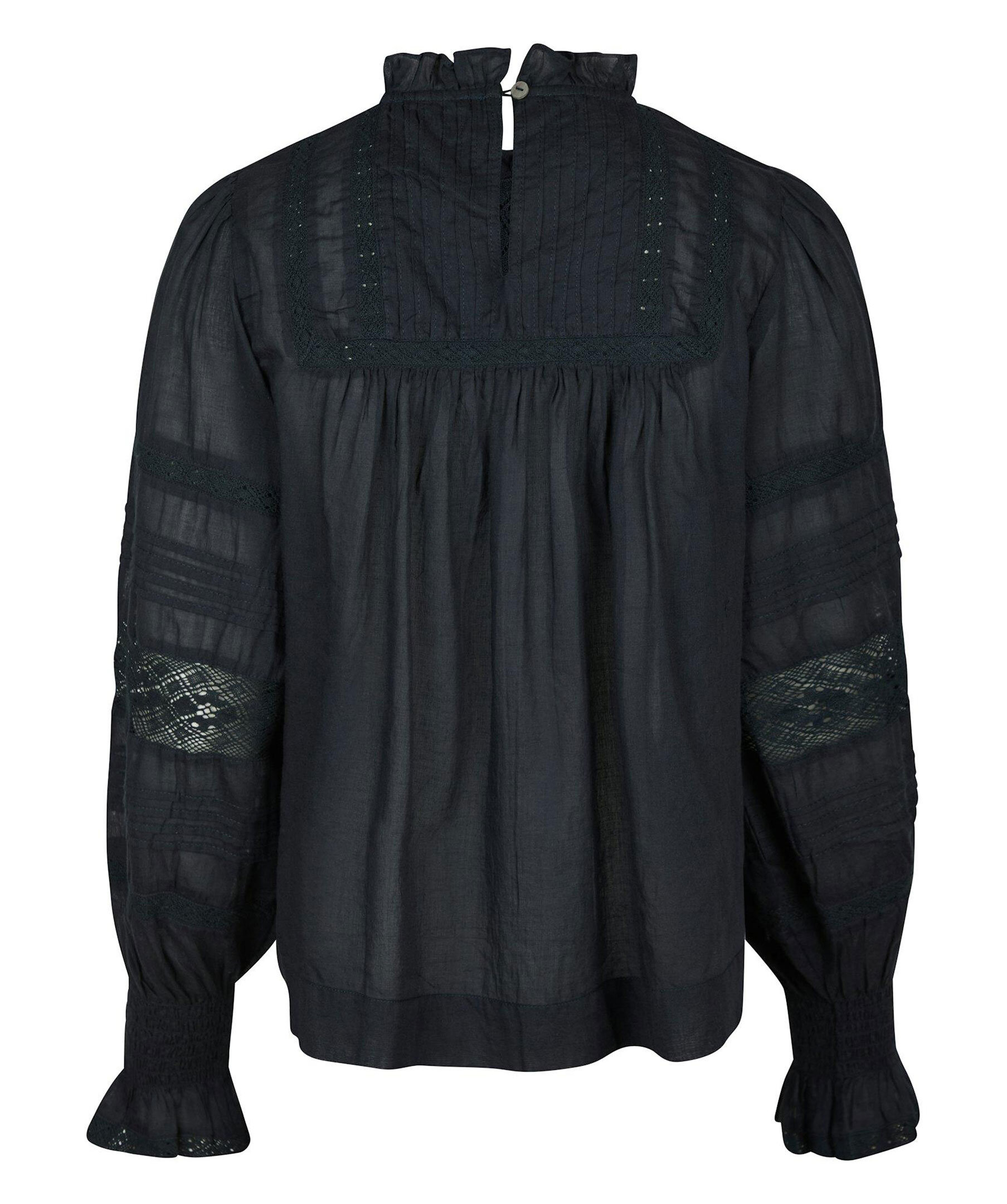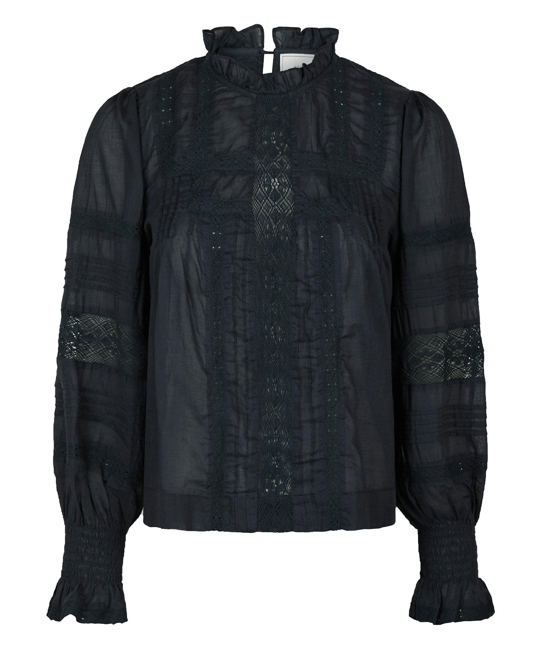 Mörkblå blus från Neo Noir. Blusen har en något högre krage, dekorativa banddetaljer samt smock vid ärmslut. Tillverkad i bomull.