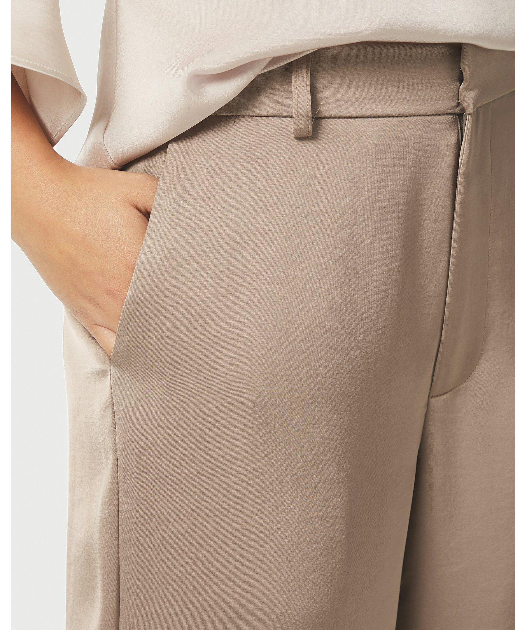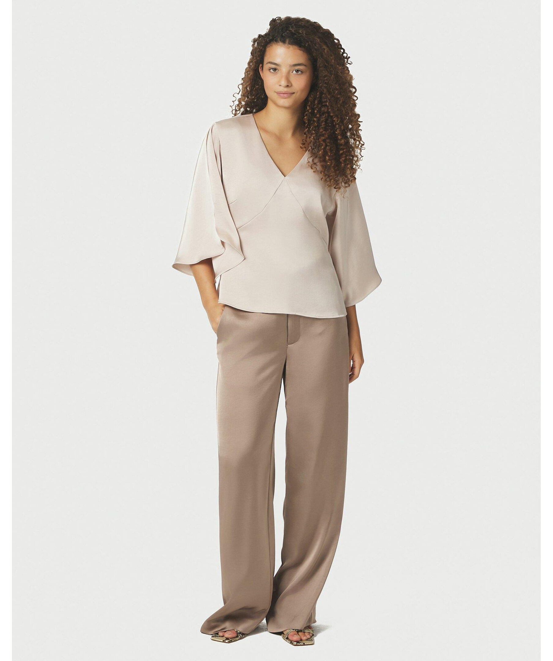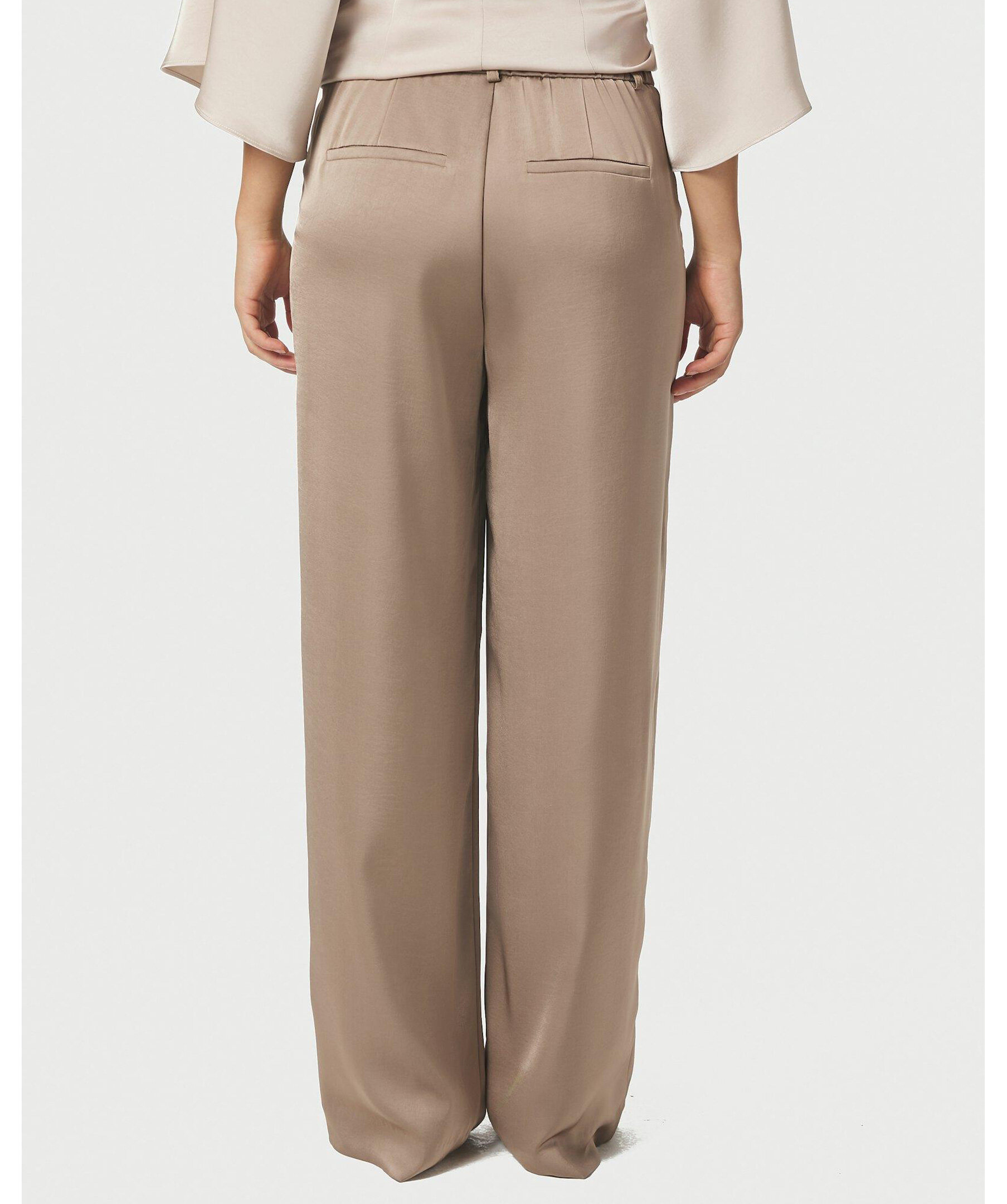 Byxor med vida ben och hög midja. Kommer i en fin tung satängkvalitet. Modellen är 176 cm lång och bär storlek 36.
