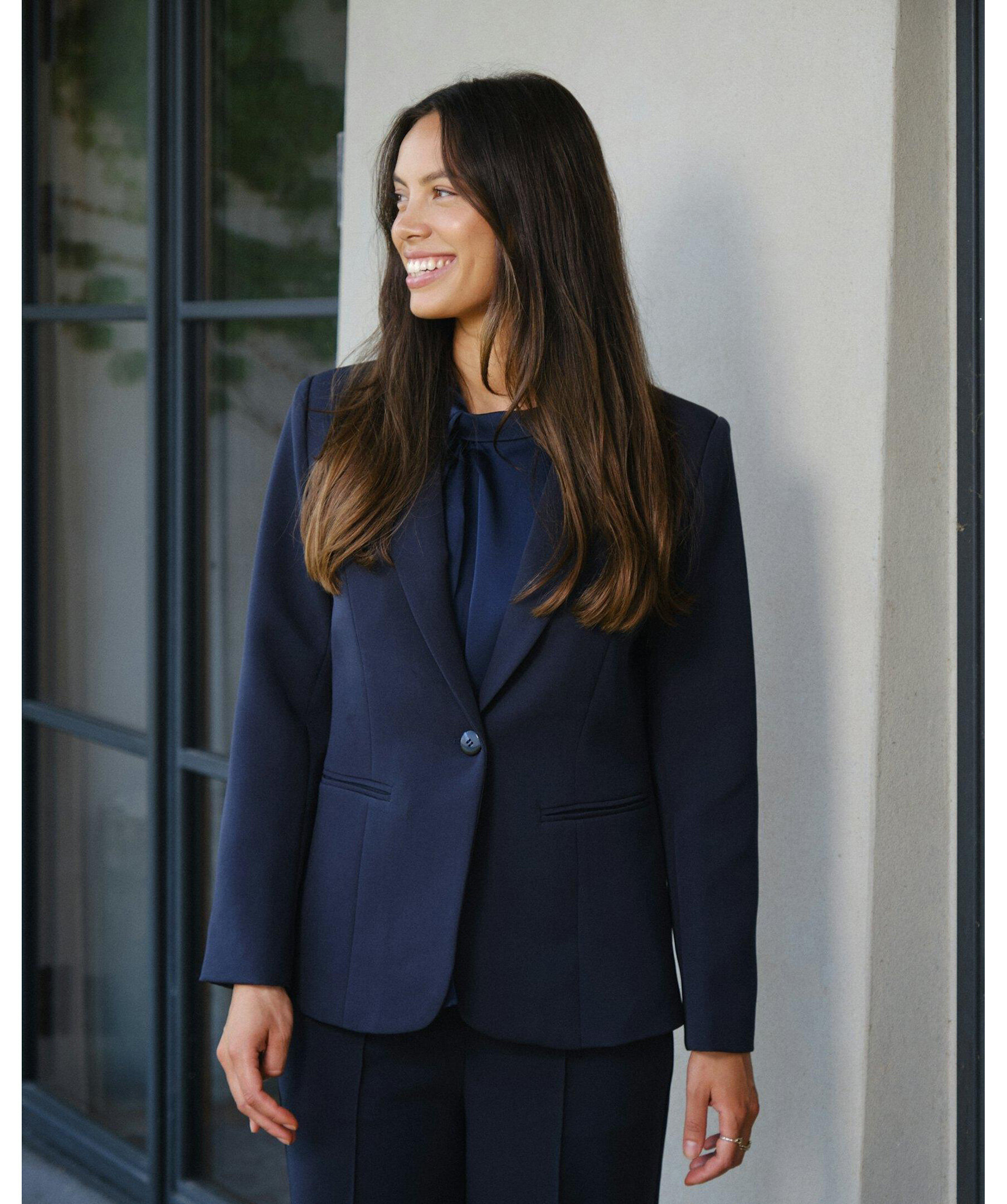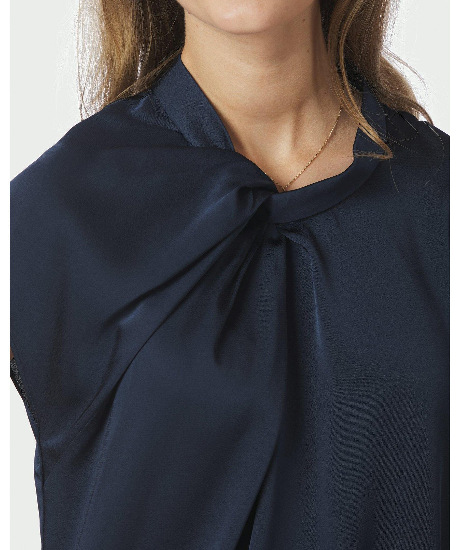 Mörkblå satinblus från Neo Noir. Hög krage med knytdetalj med drapering. Knäppning baktill. Avslappnad passform. Tillverkad i polyester.