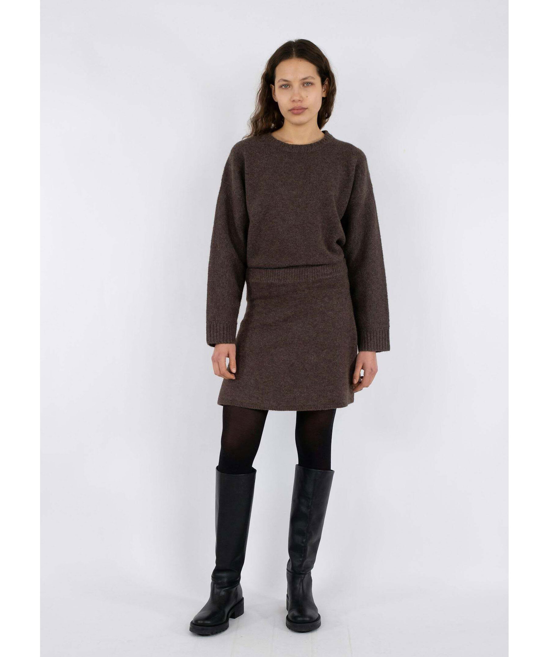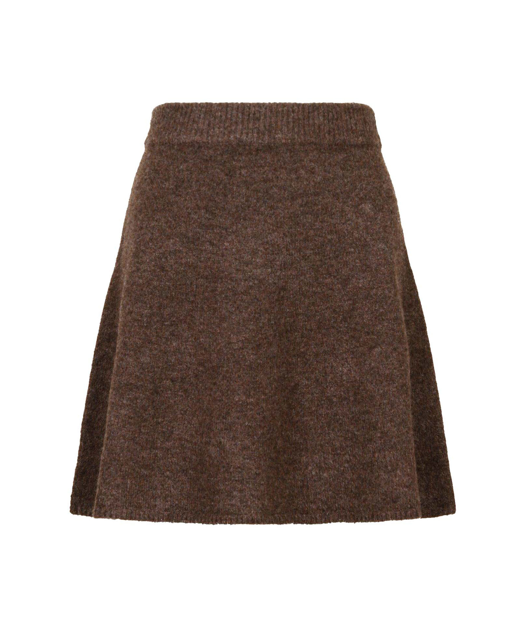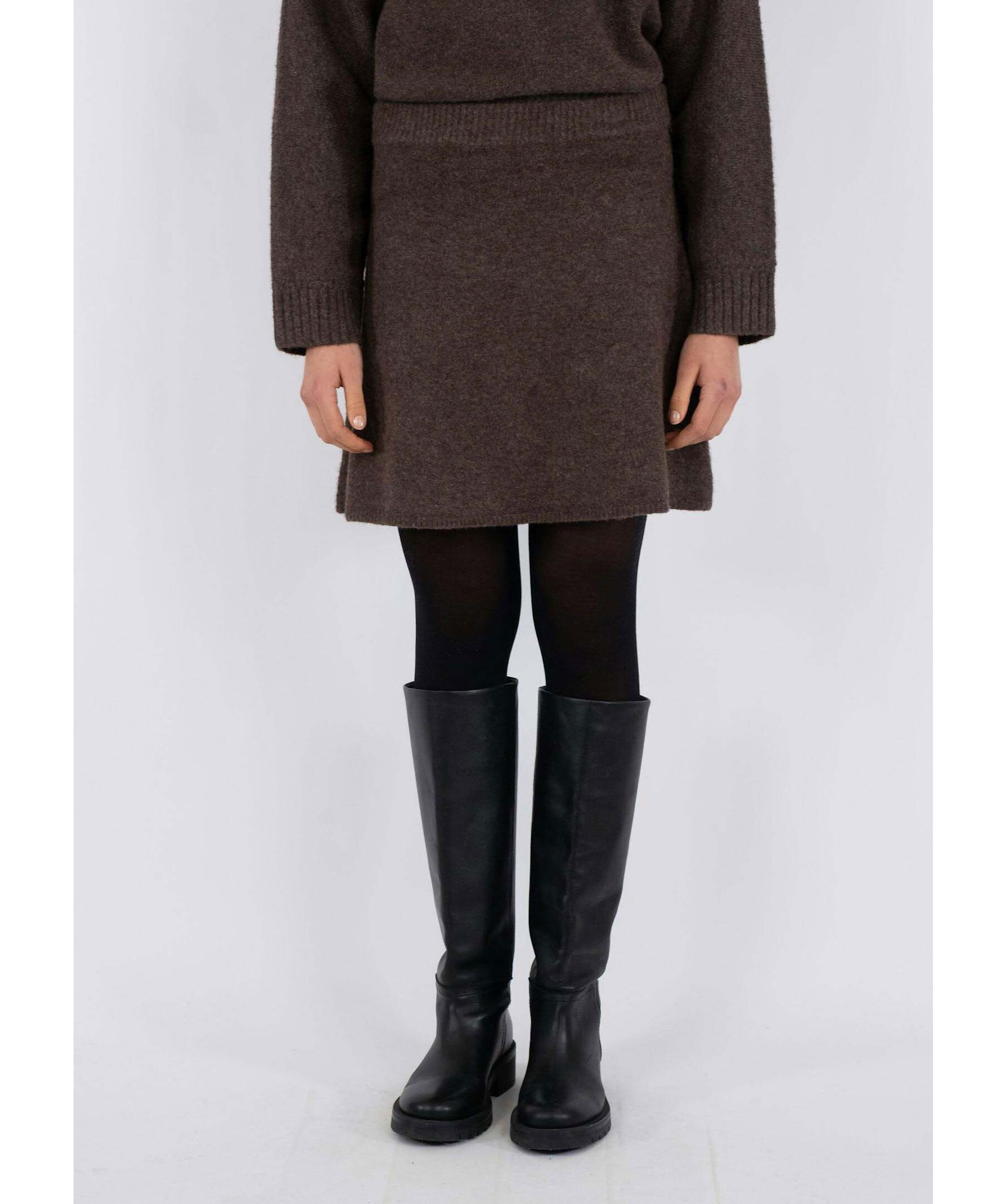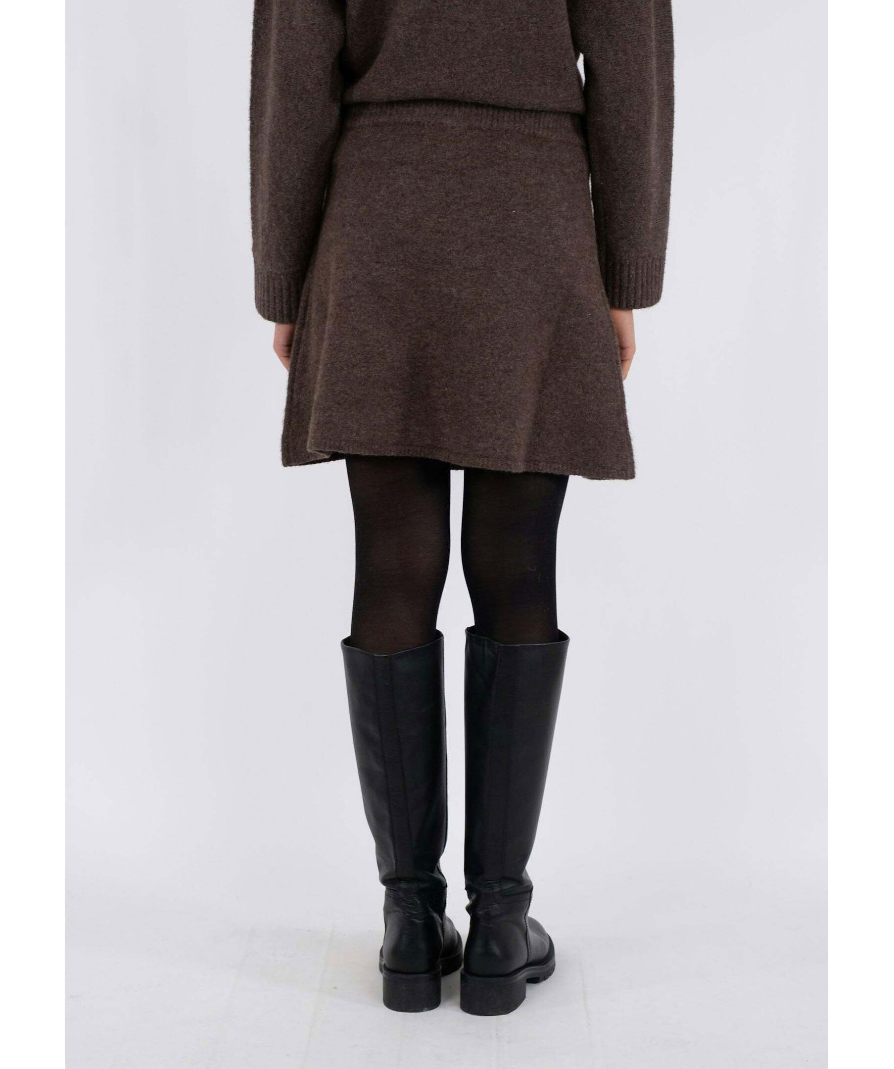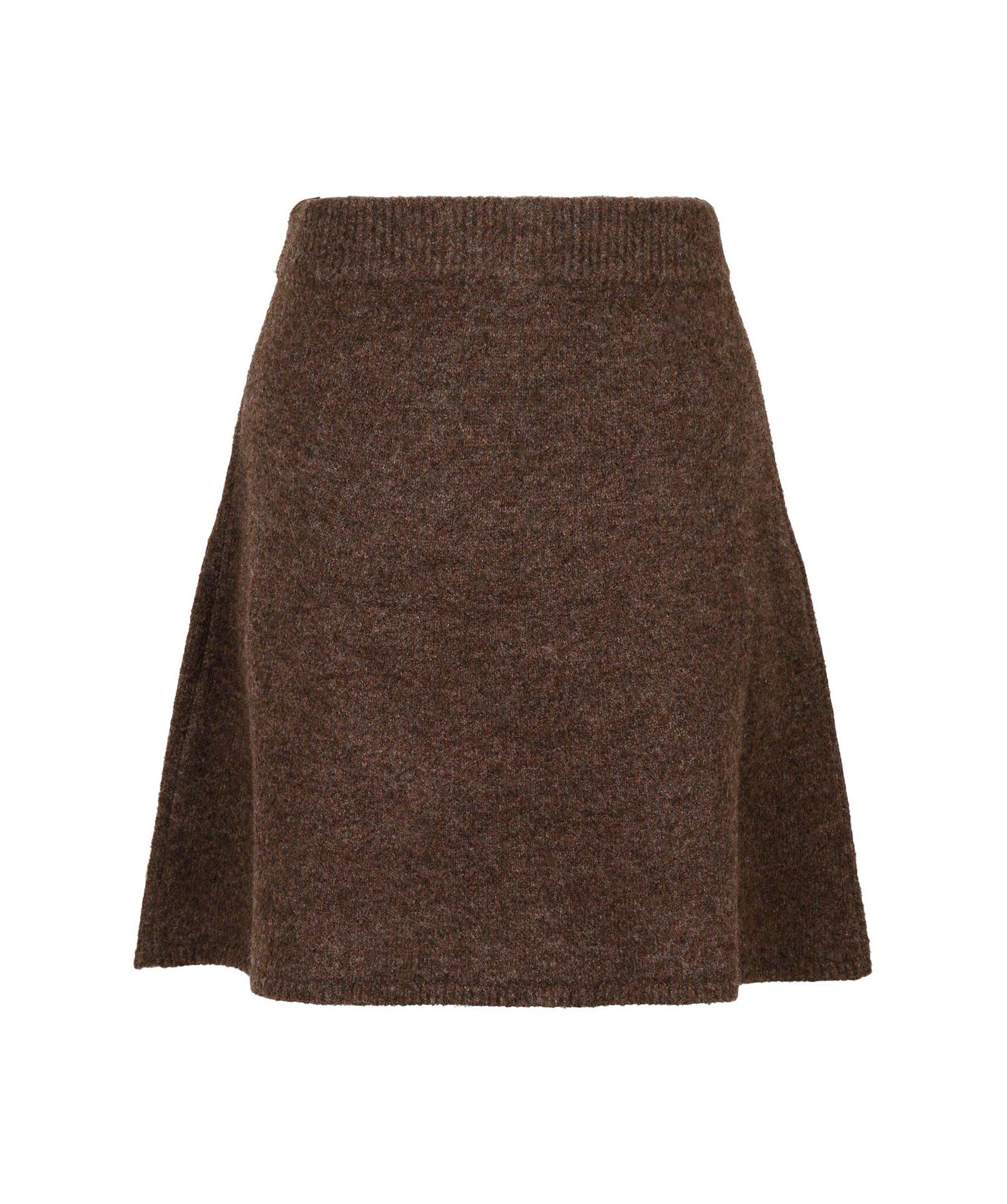 Brun, stickad kjol från Neo Noir. Kjolen har en ribbstickad, elastisk midja. Slutar ungefär mitt på låren. Tillverkad i en polyester- och ullblandning.