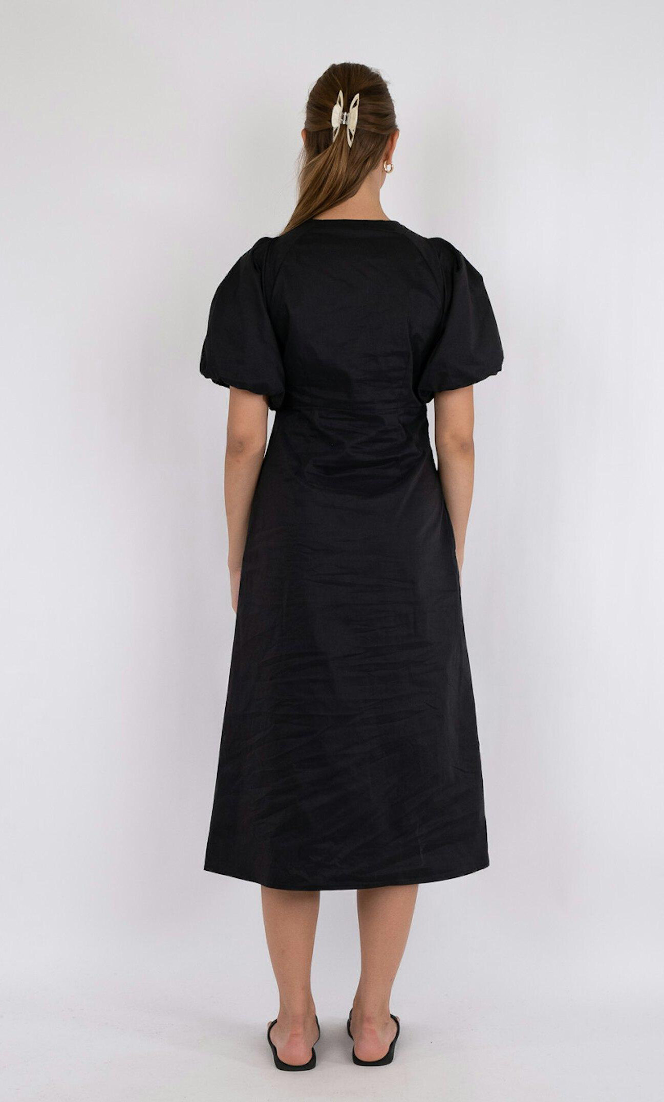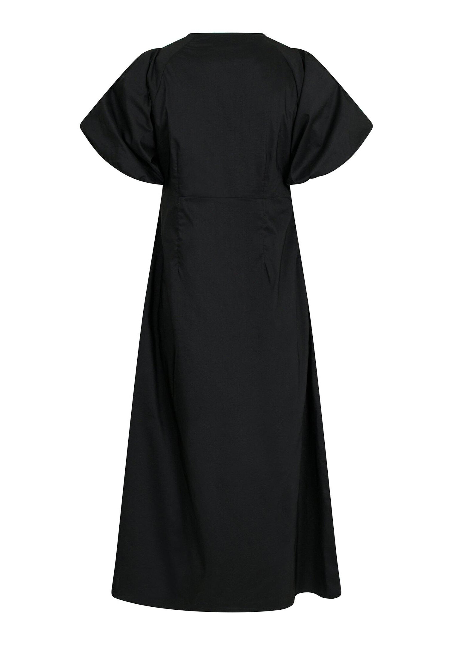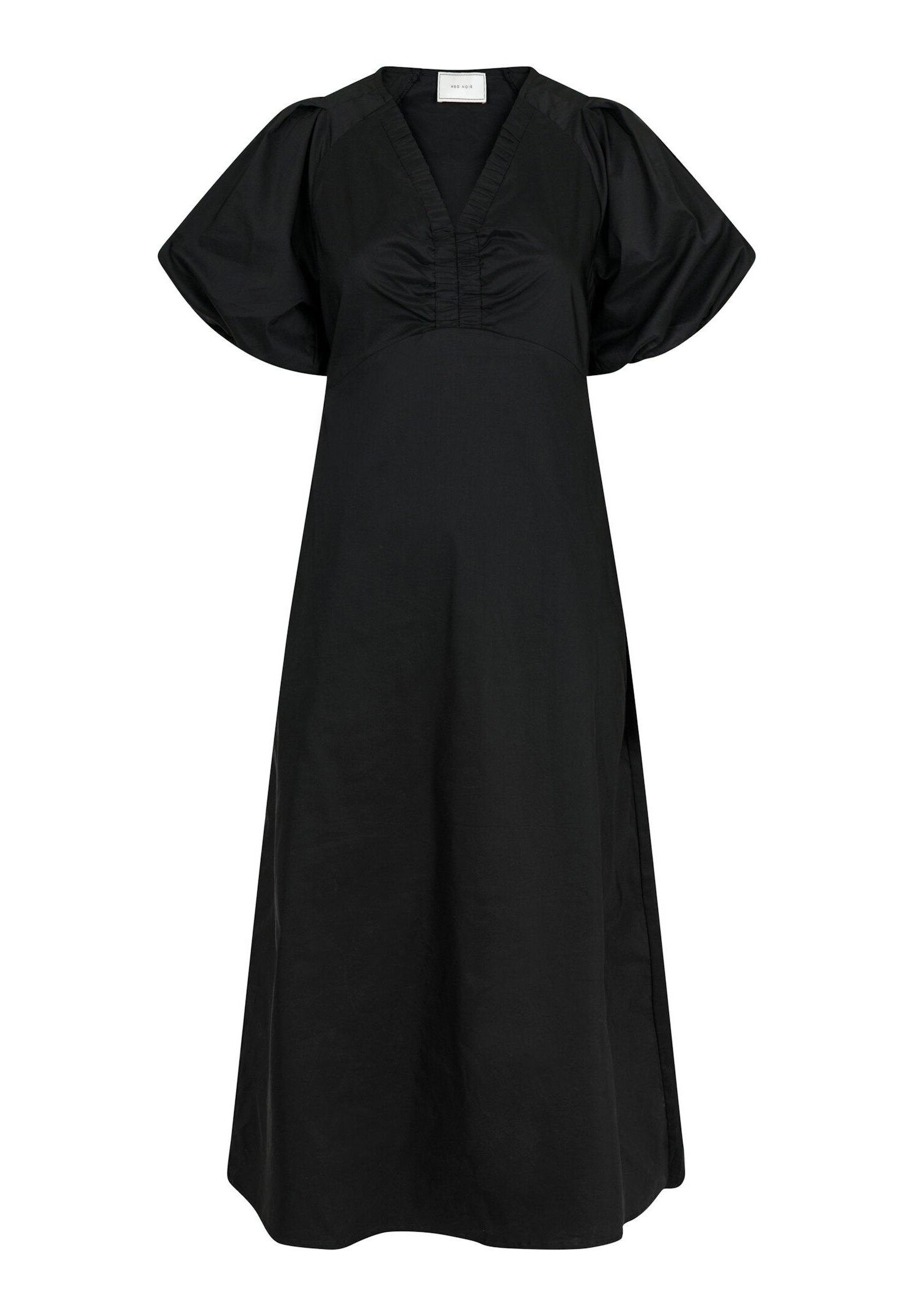 Svart klänning från Neo Noir. V-ringning med elastisk resår och veckade detaljer. Klänningen har korta, vida puffärmar. Tillverkad i bommullsblandning.