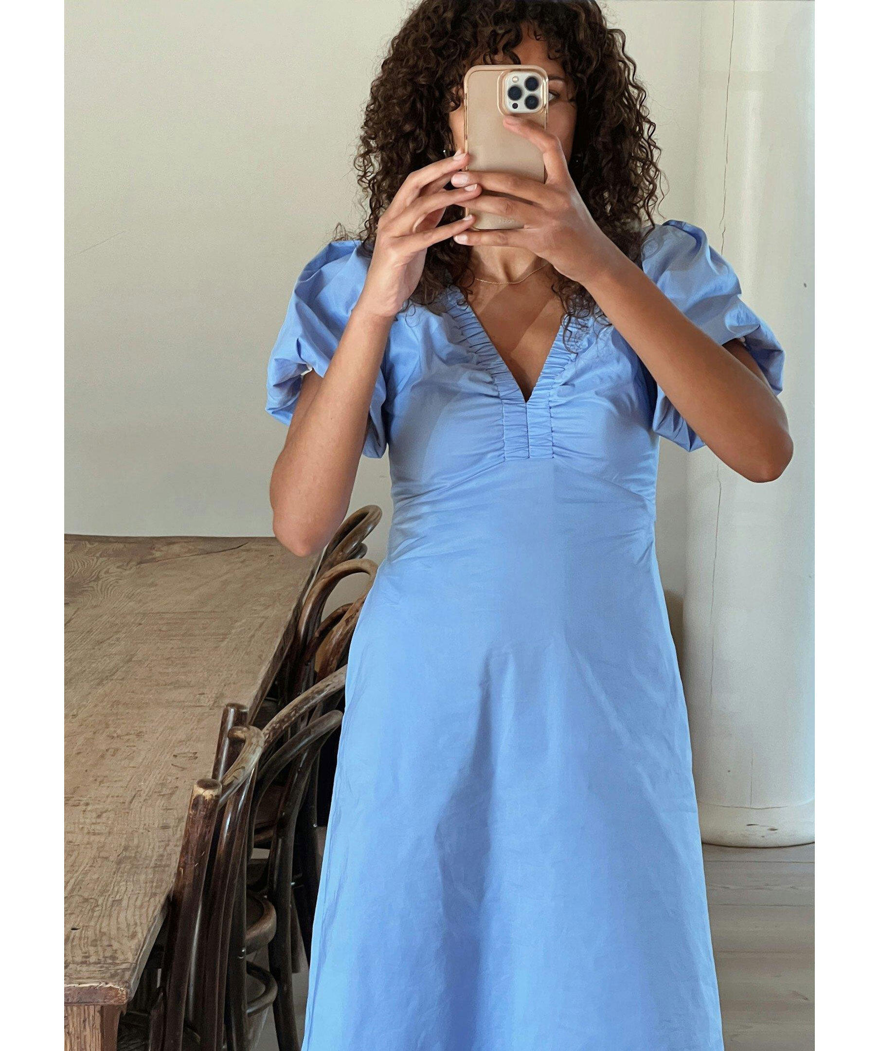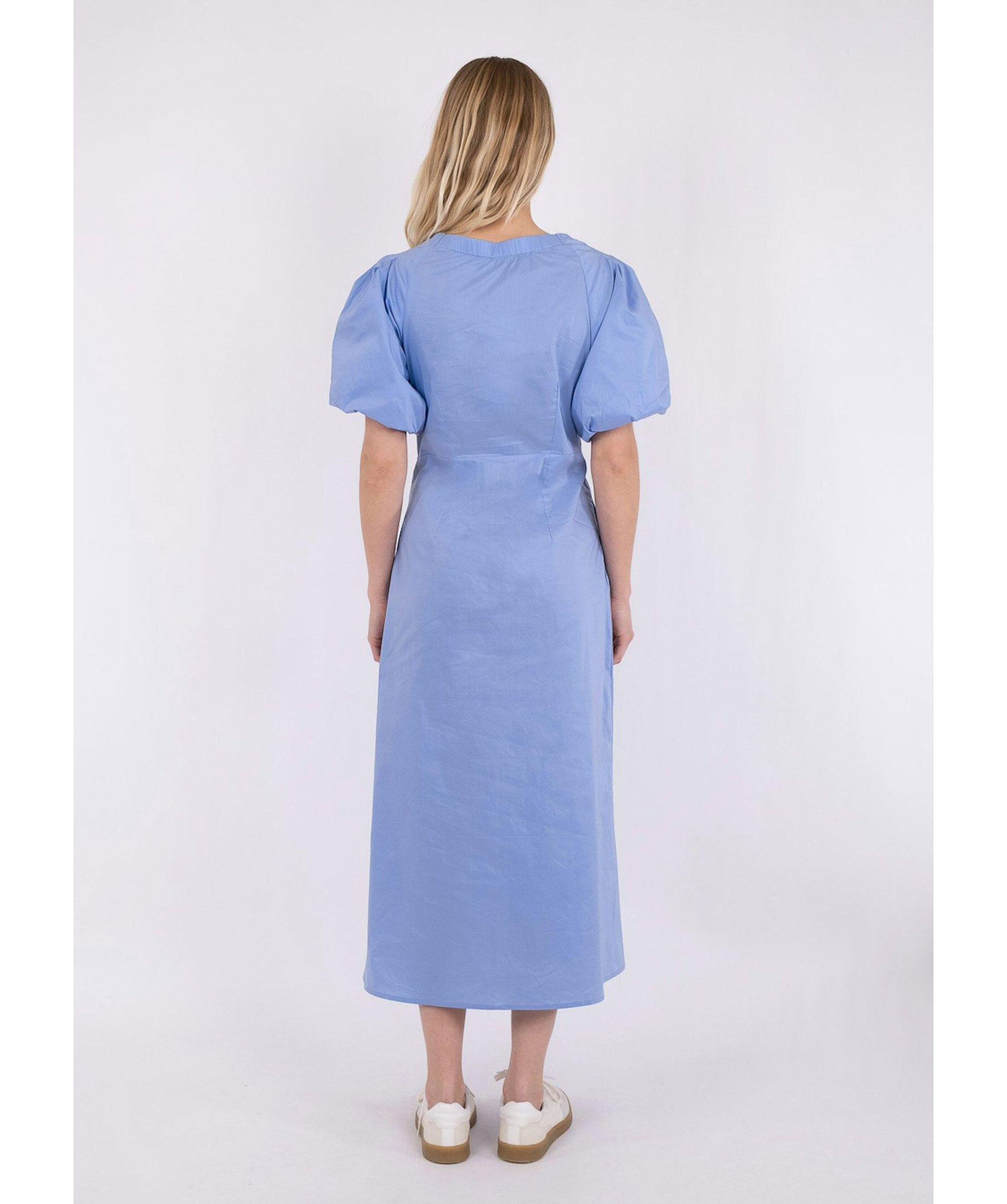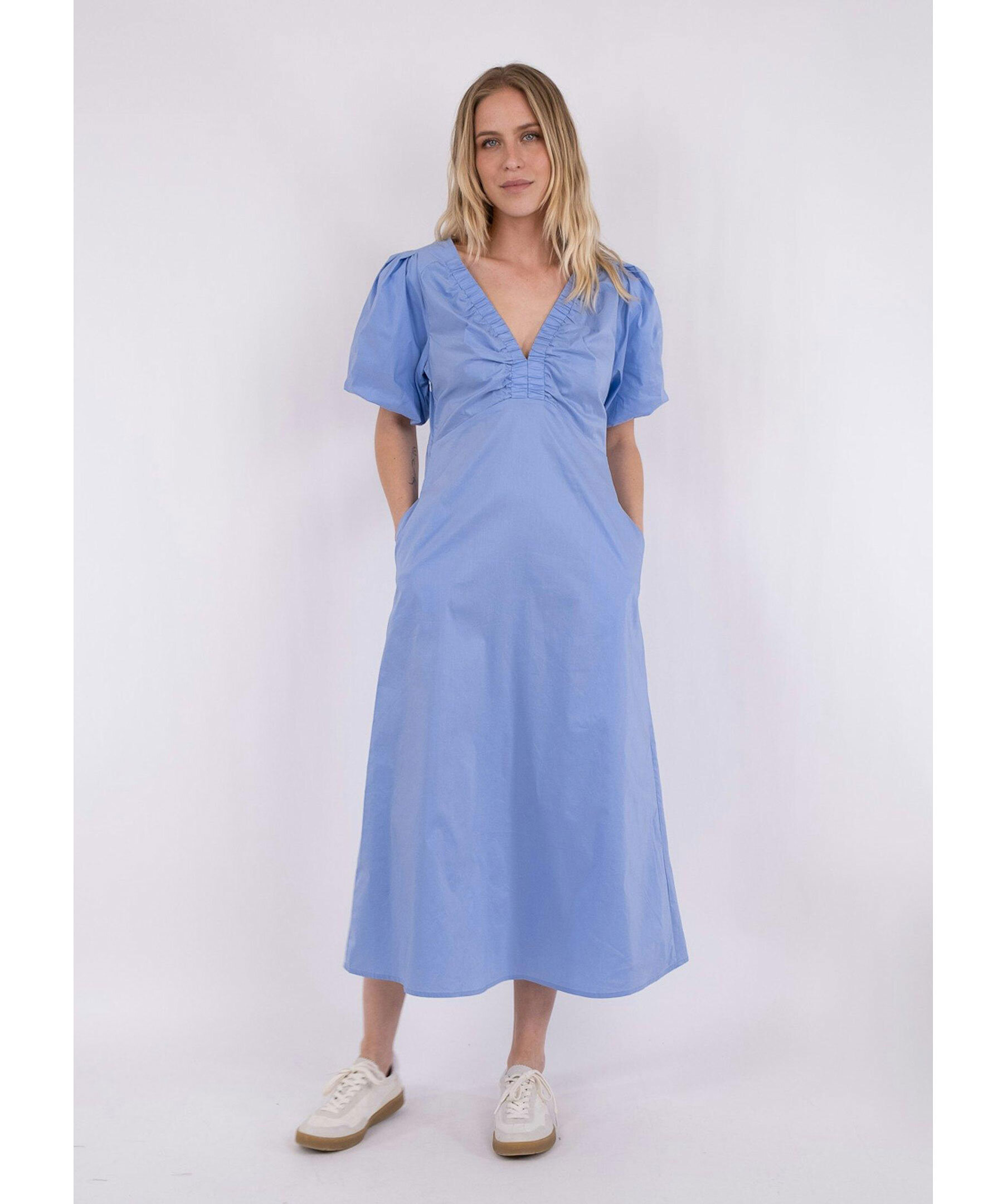 Himmelsblå klänning från Neo Noir. Klänningen slutar vid vaderna och har en v-ringning med rynkdetaljer, fickor i sidsömmarna och korta ärmar. Tillverkad i en mjuk och lyxig bomullspoplin.