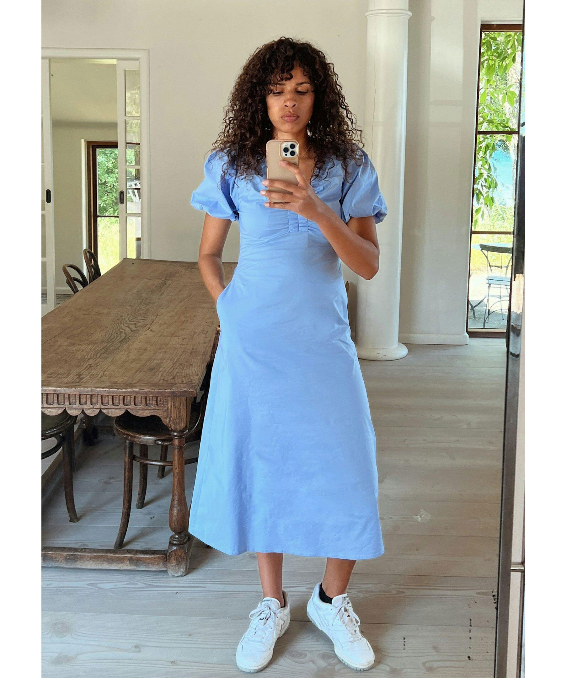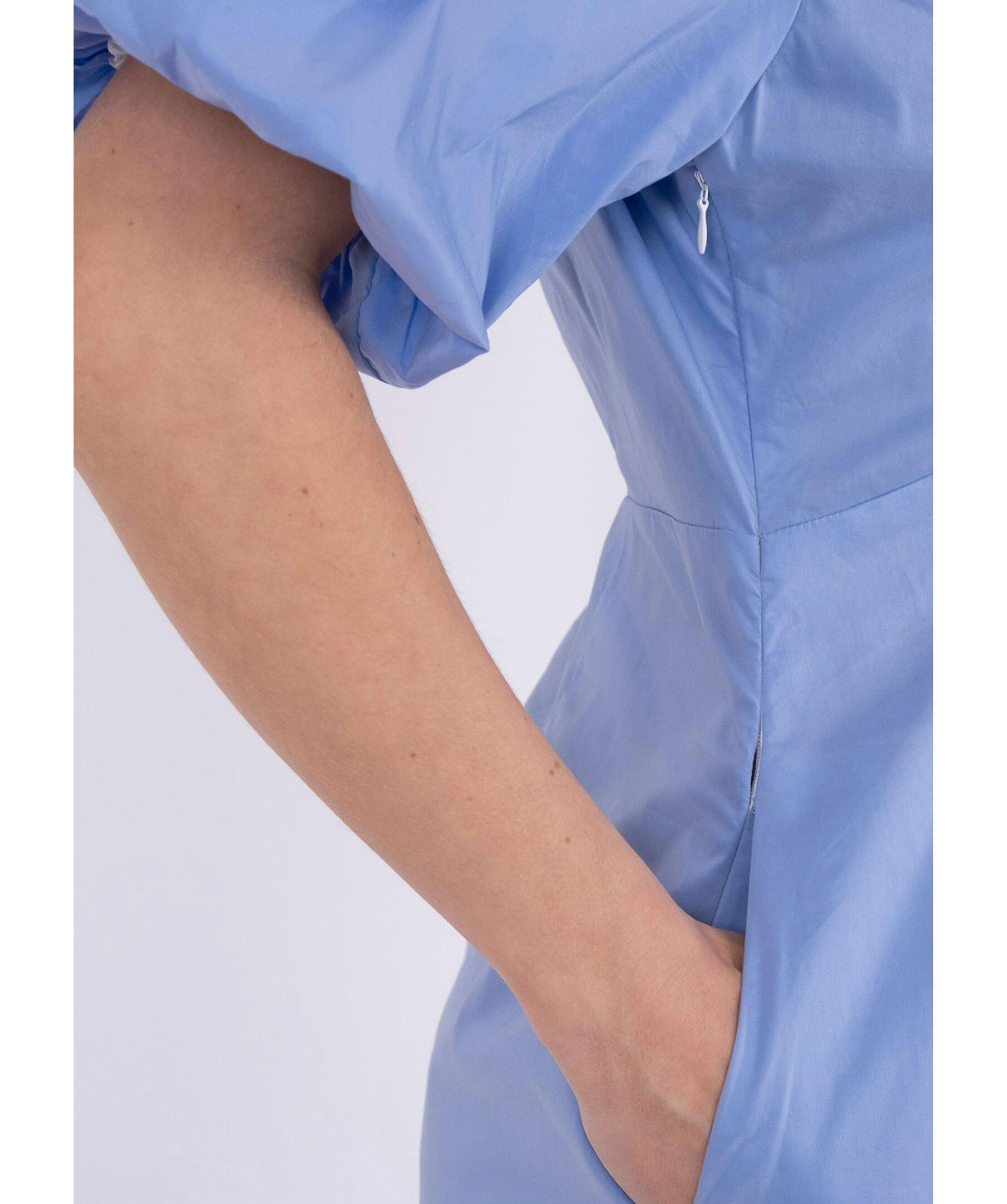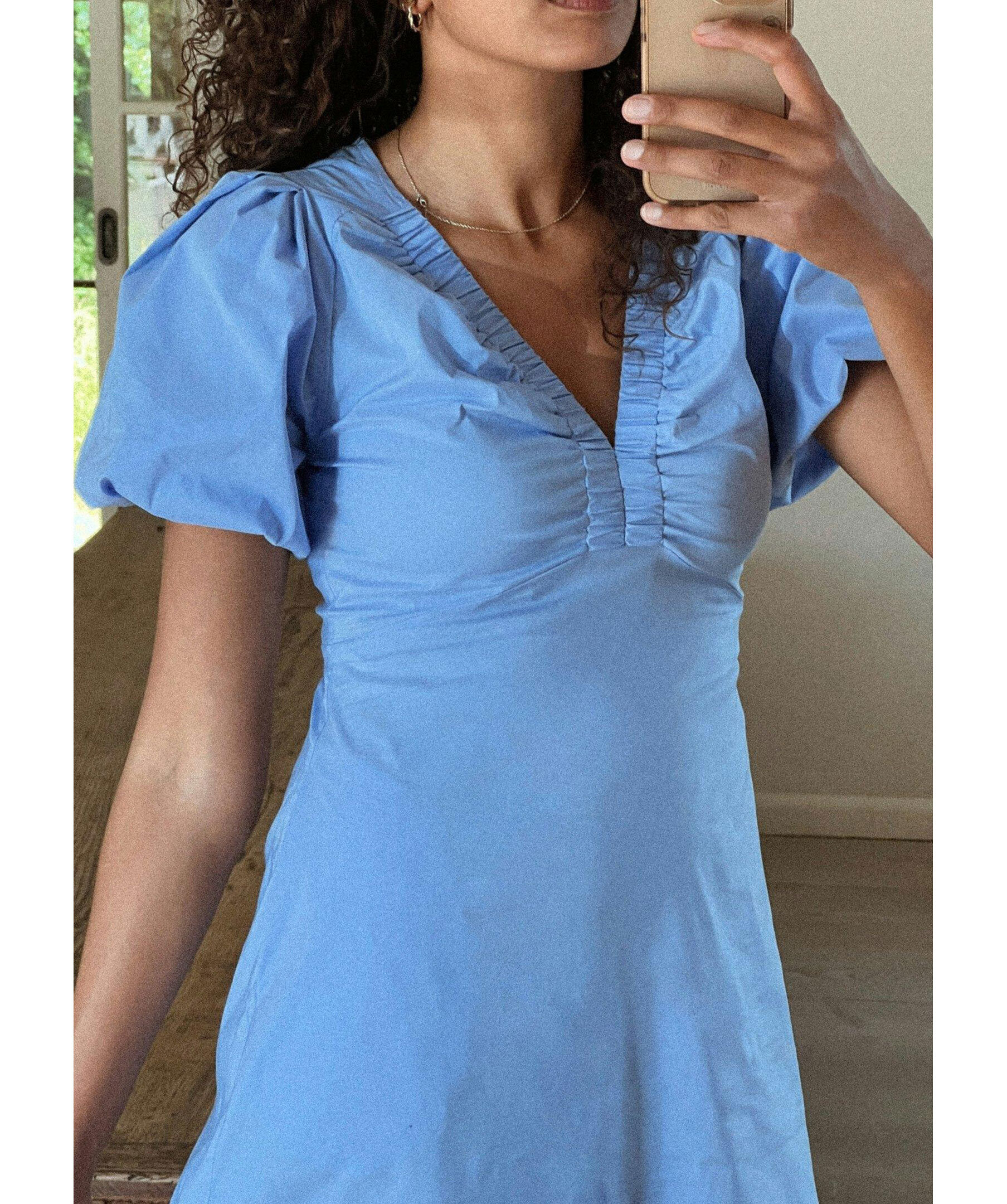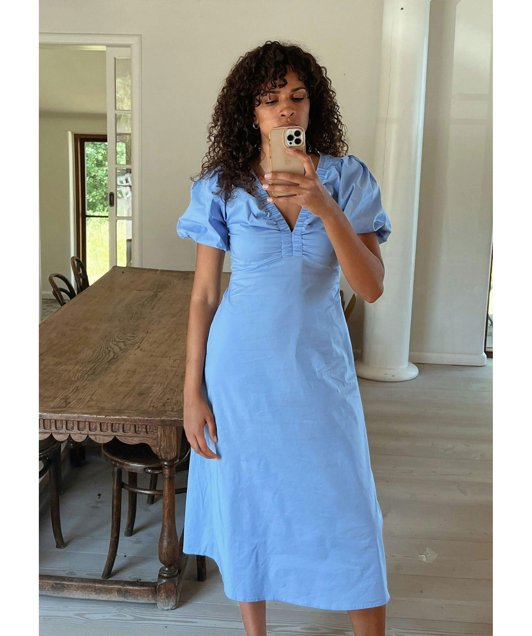 Himmelsblå klänning från Neo Noir. Klänningen slutar vid vaderna och har en v-ringning med rynkdetaljer, fickor i sidsömmarna och korta ärmar. Tillverkad i en mjuk och lyxig bomullspoplin.