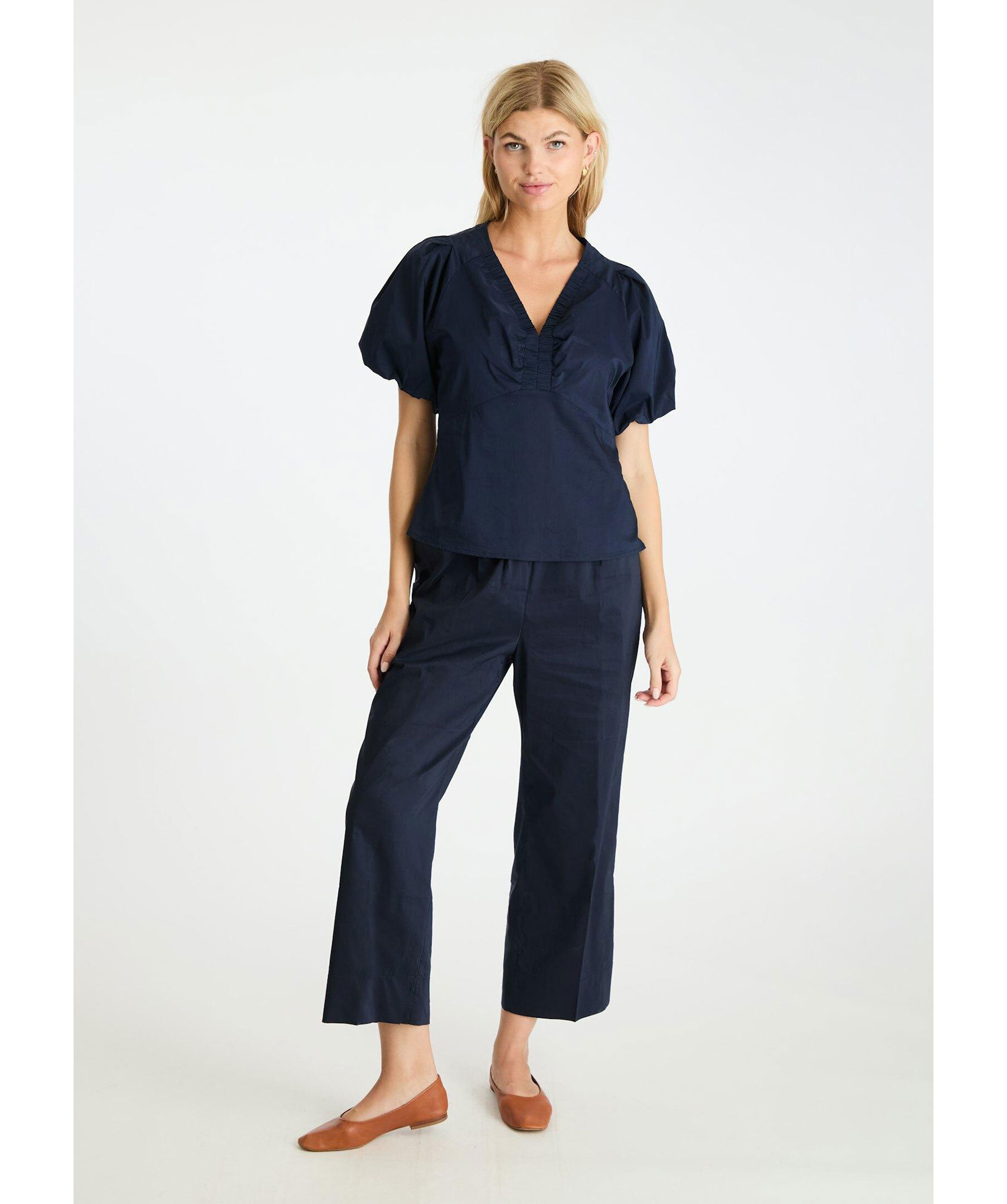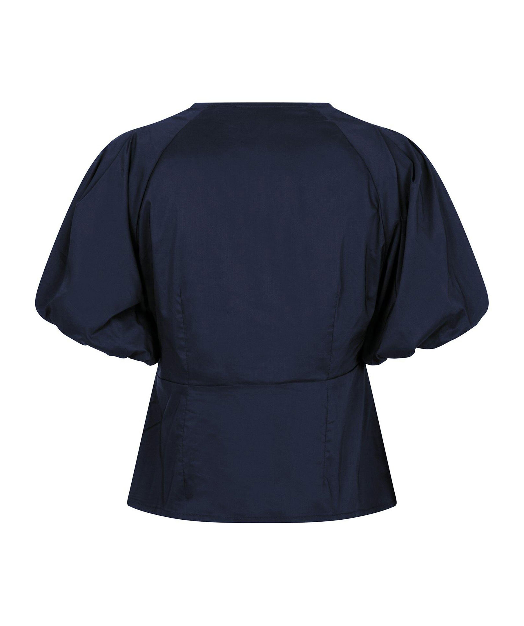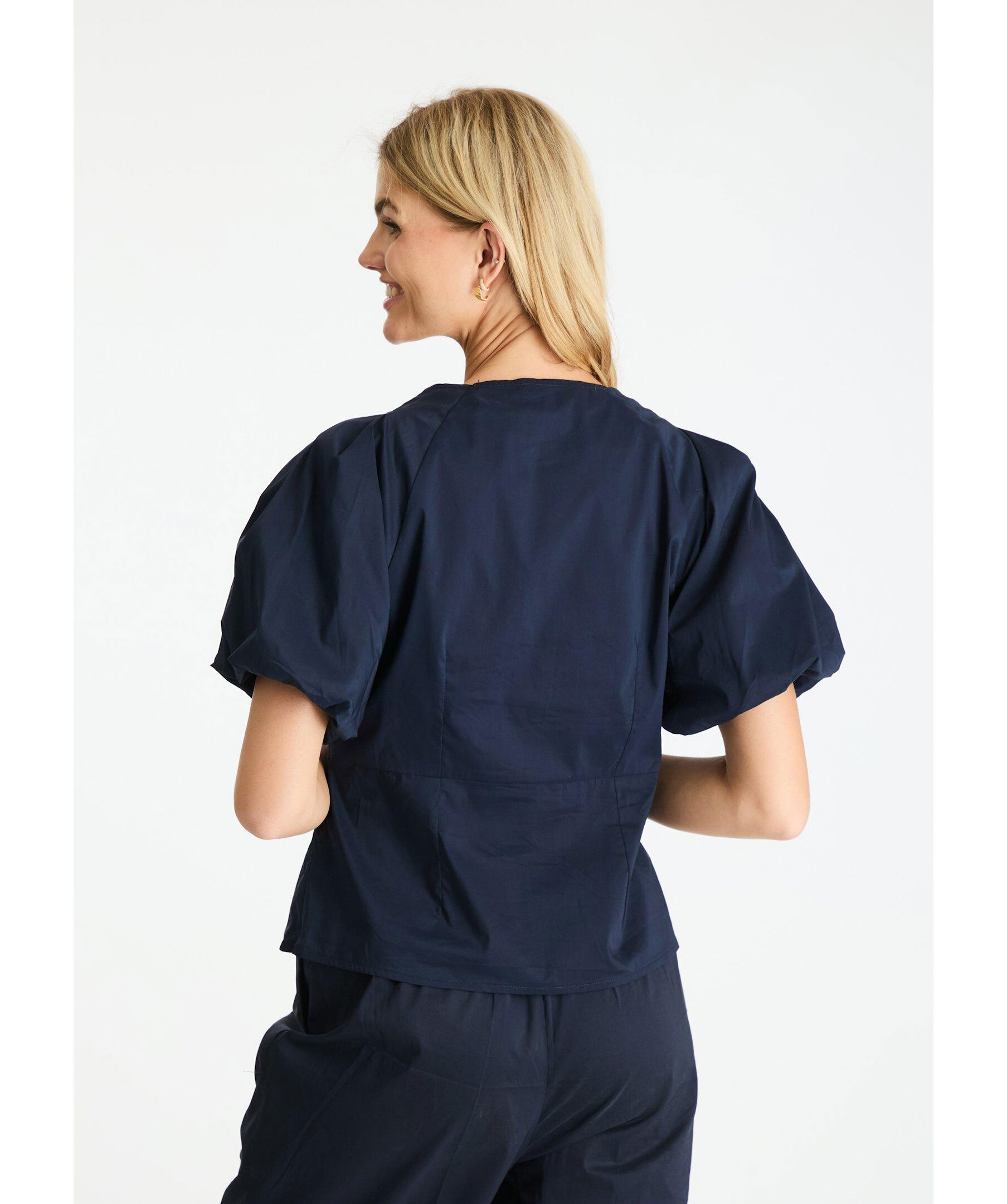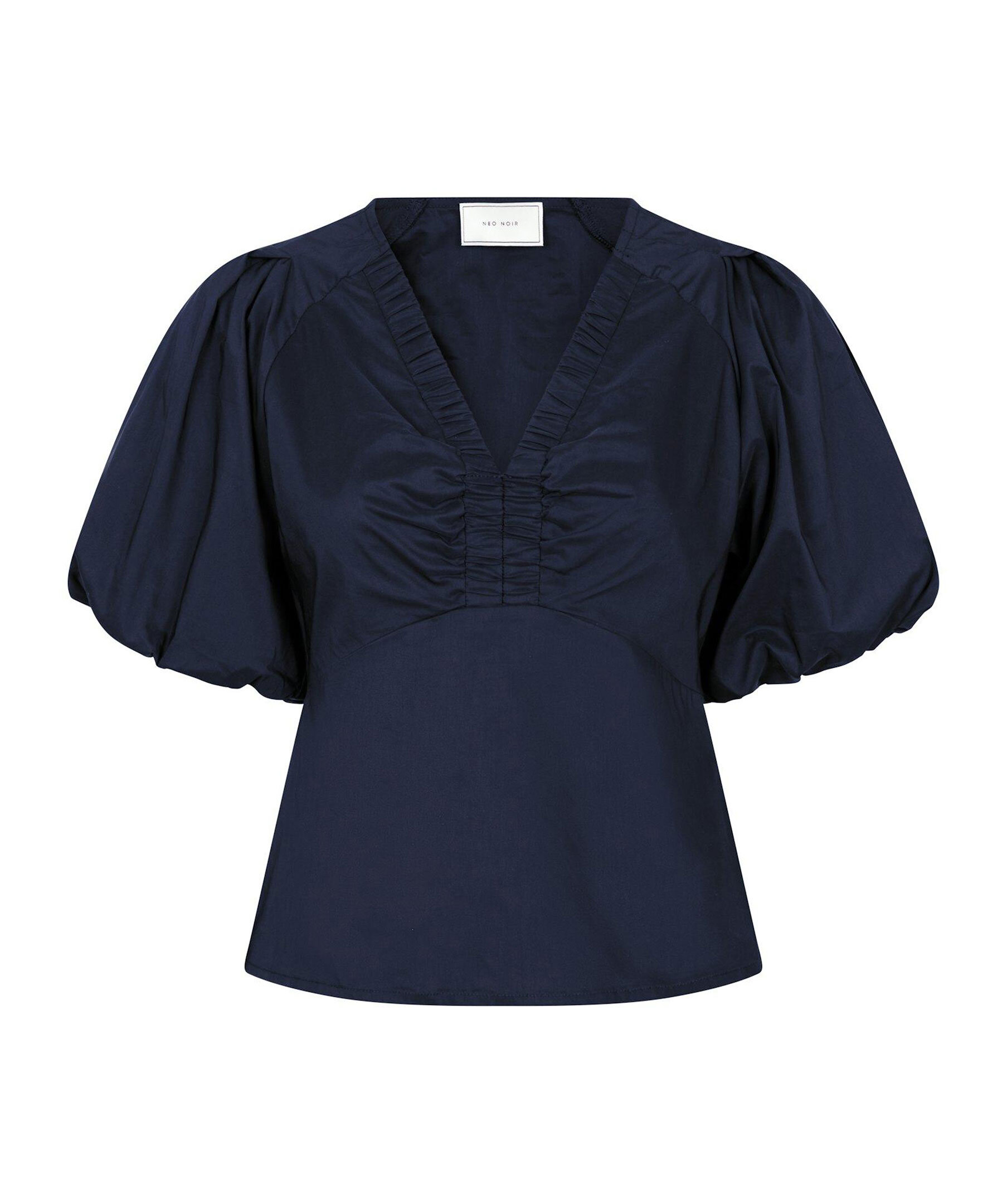 Marinblå blus från Neo Noir. V-ringad med elastisk resår och smock detalj. Korta vida puffärmar. Diskret dragkedja i sidan. Plagglängd på storlek 36 är 56 cm. Tillverkad av en bomullsblandning.