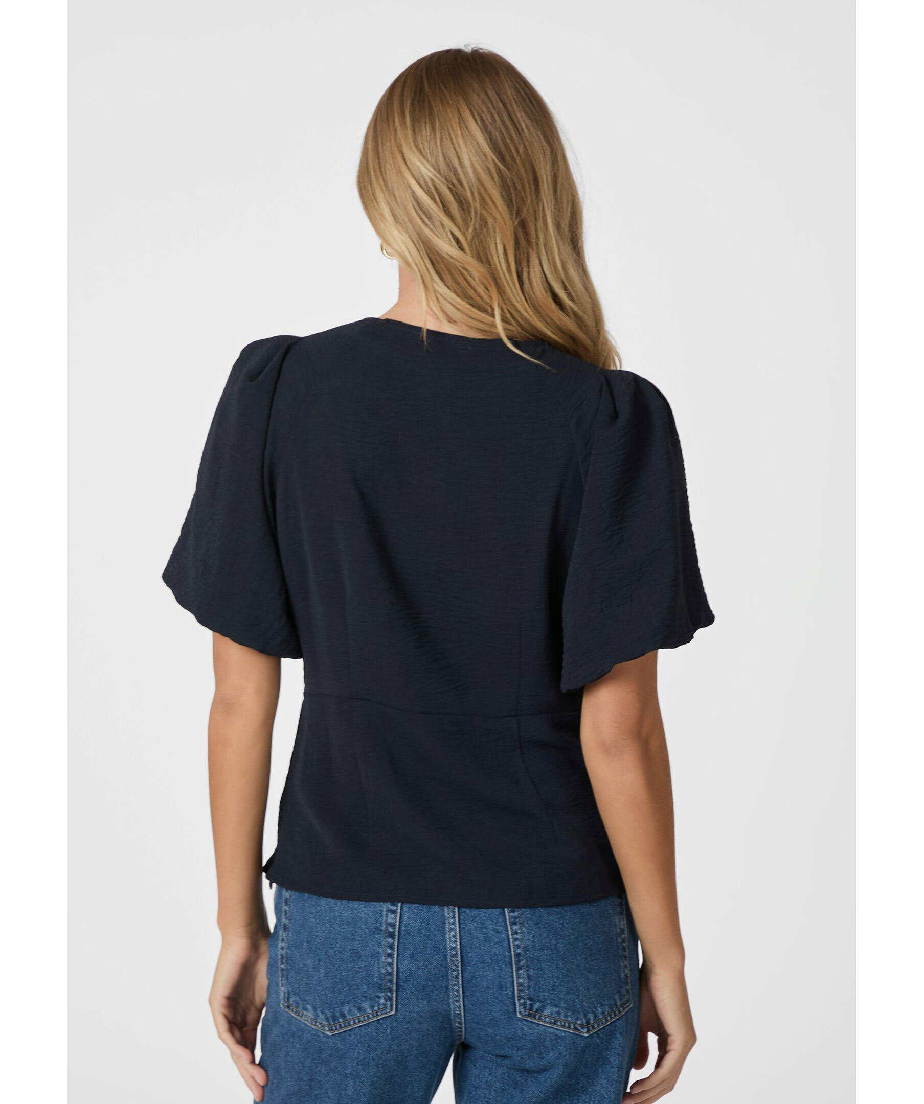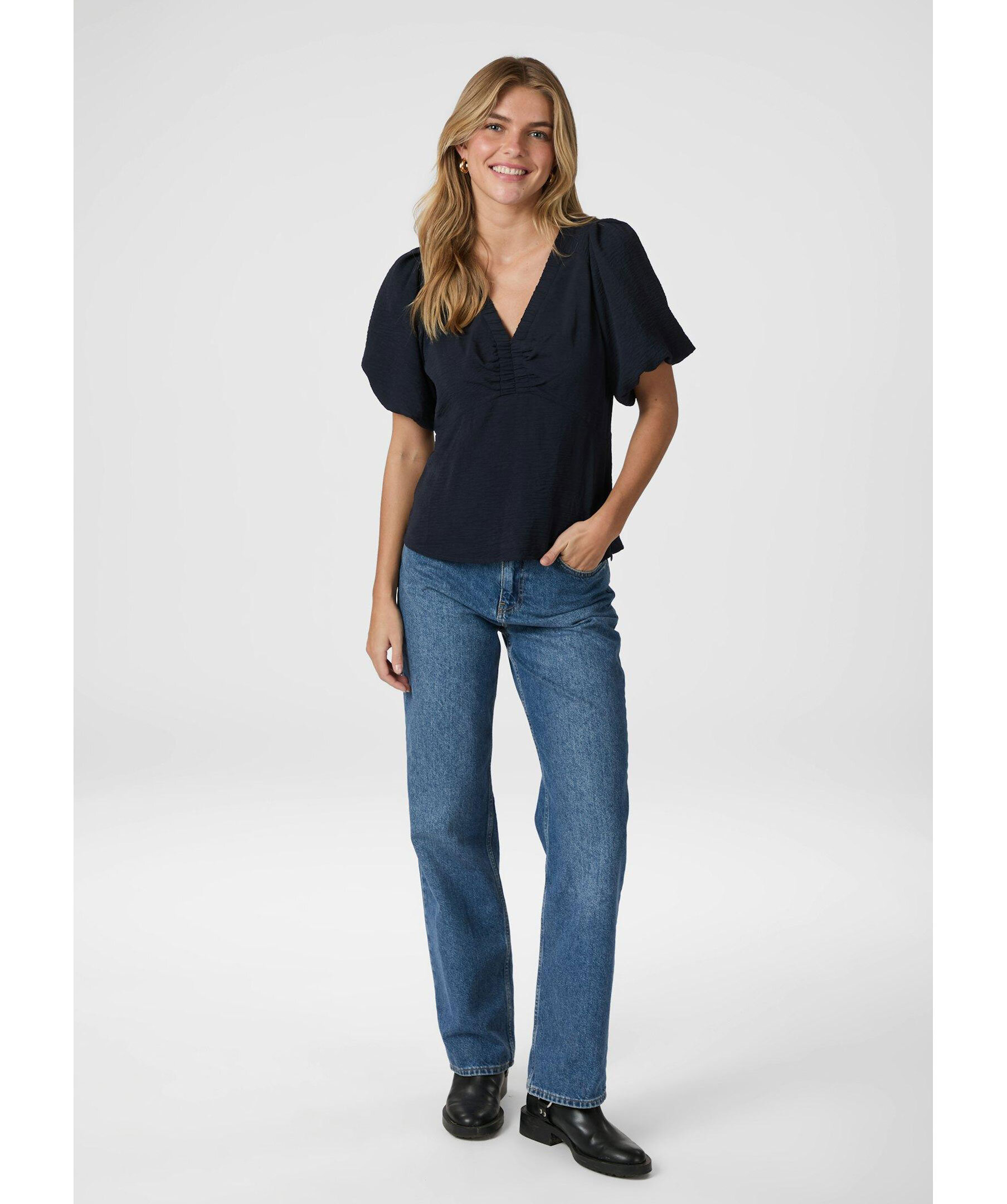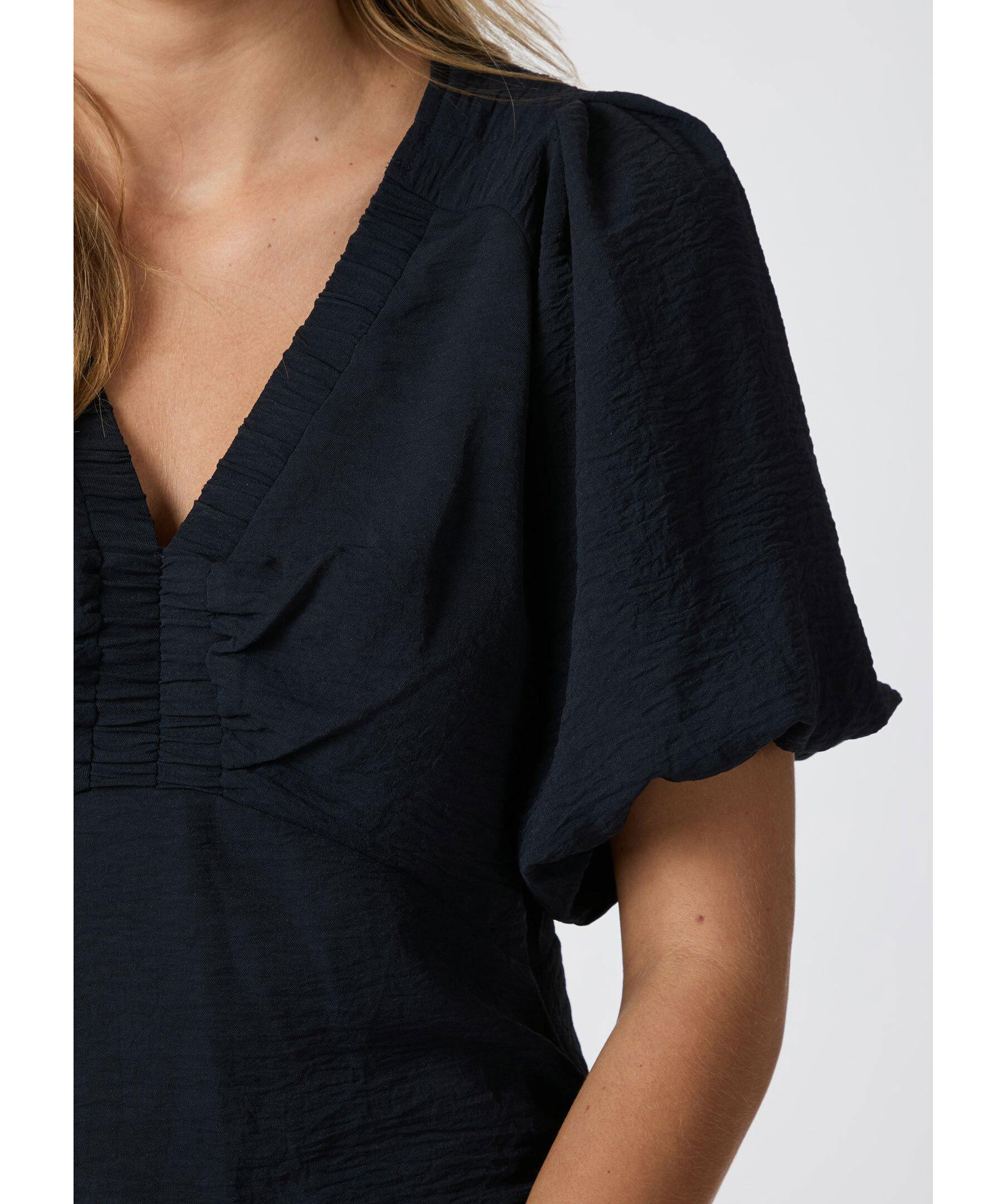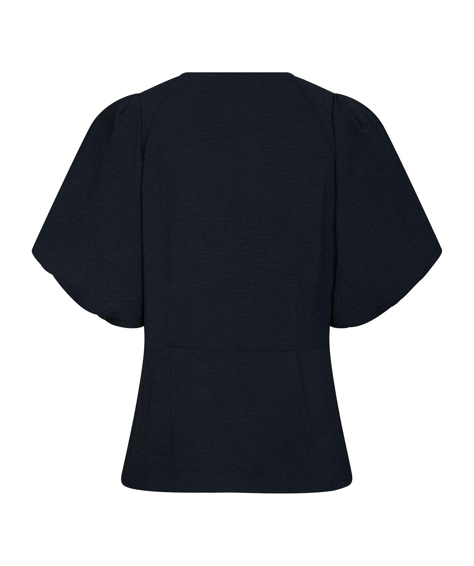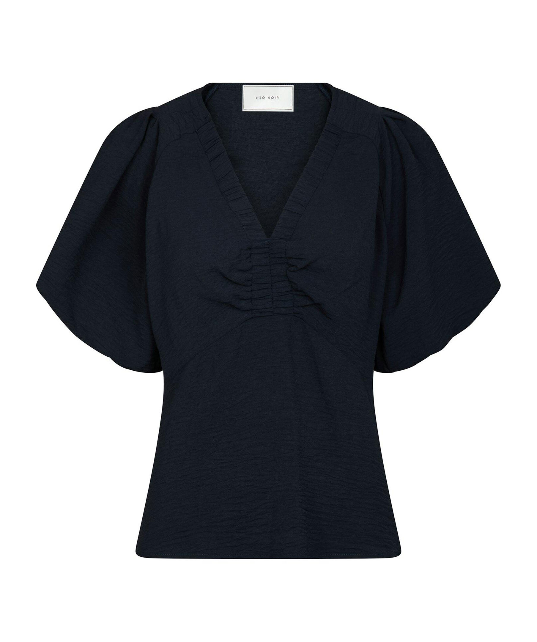 Mörkblå blus från Neo Noir. V-ringad med elastisk resår och smock detalj. Korta vida puffärmar. Diskret dragkedja i sidan. Tillverkad i polyester.