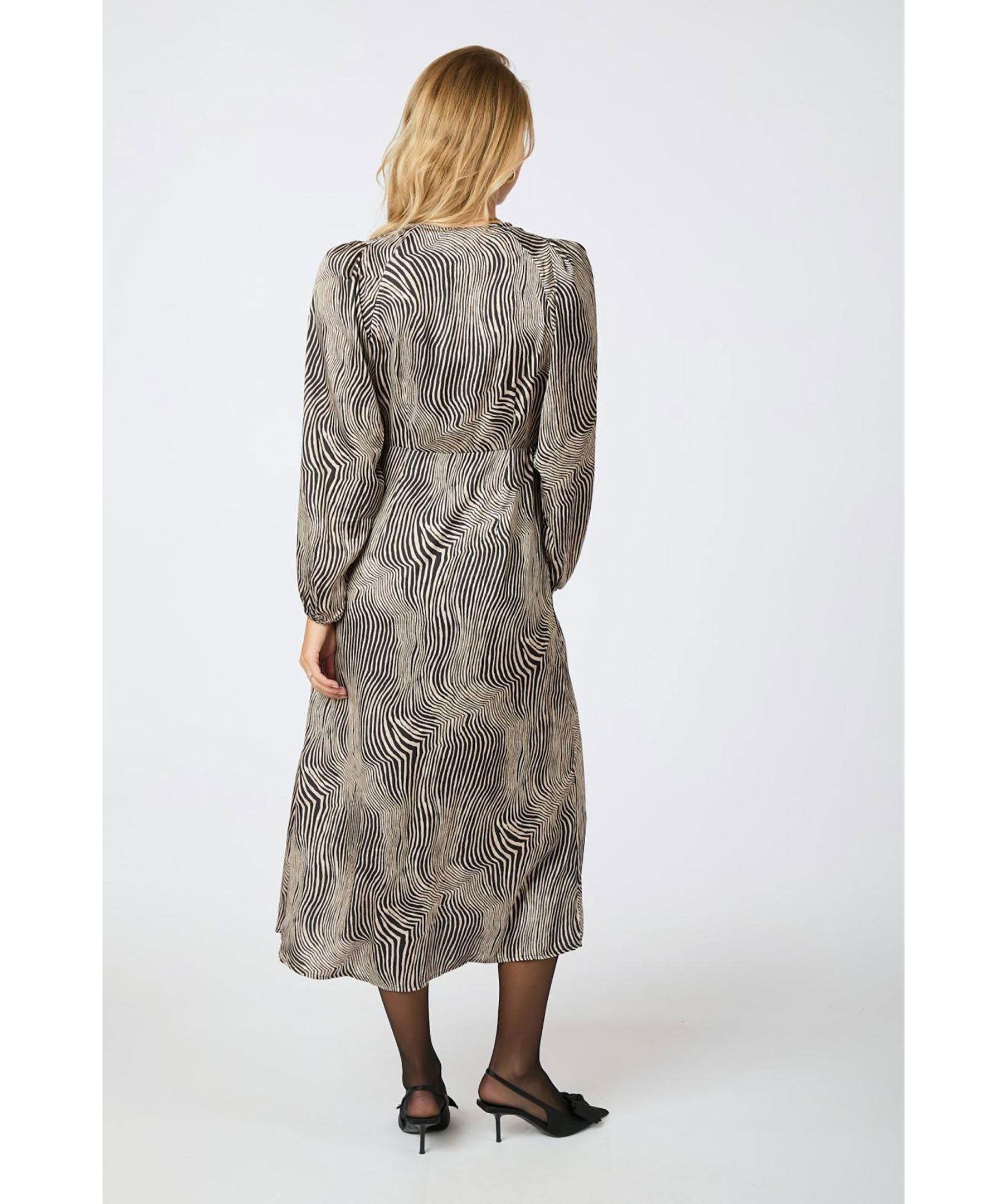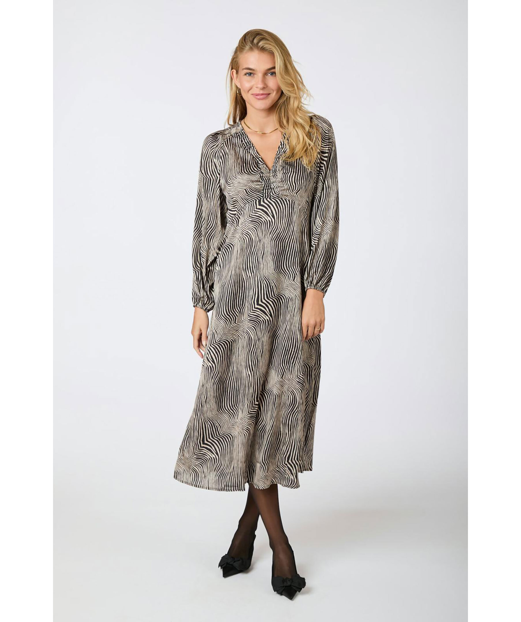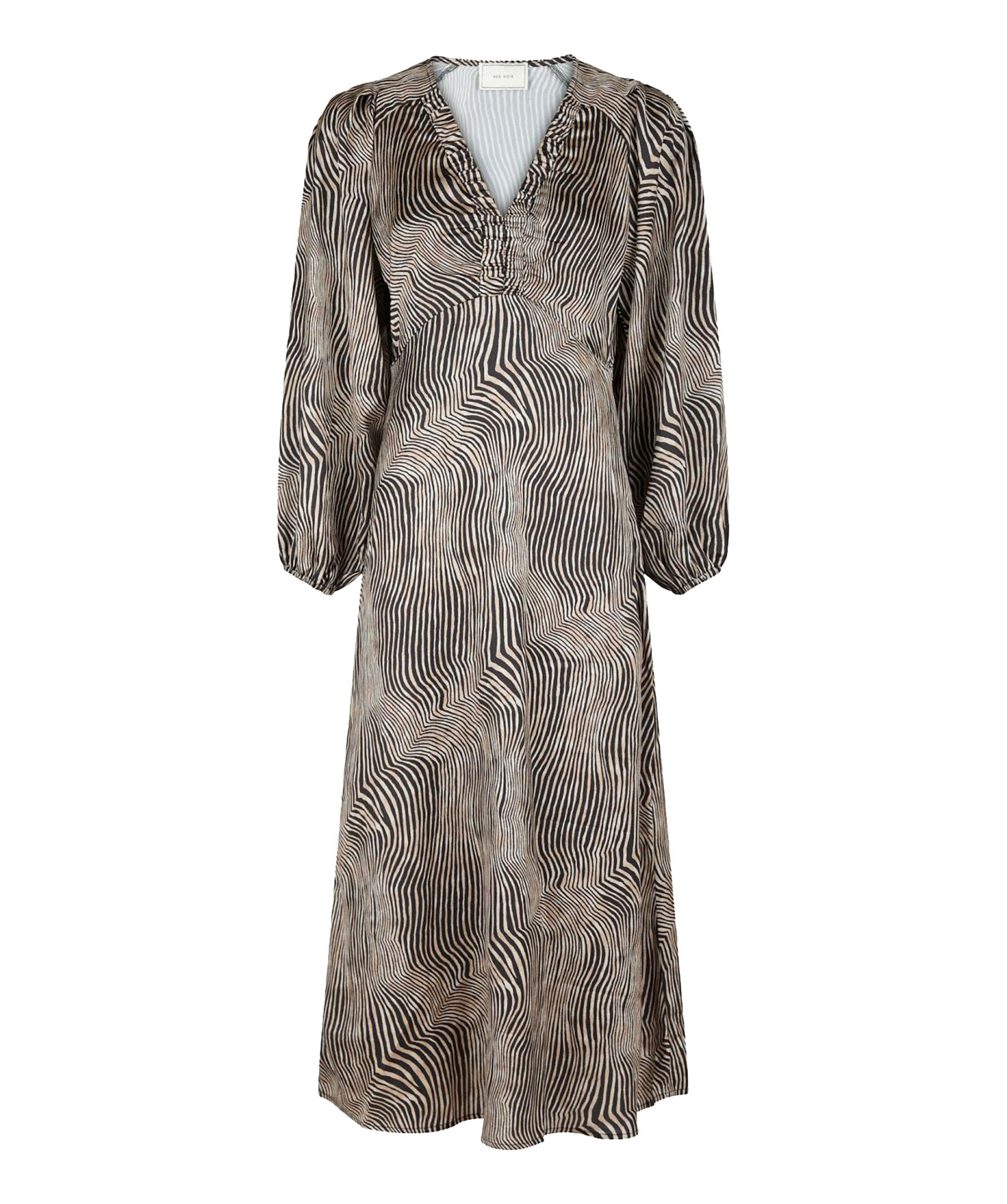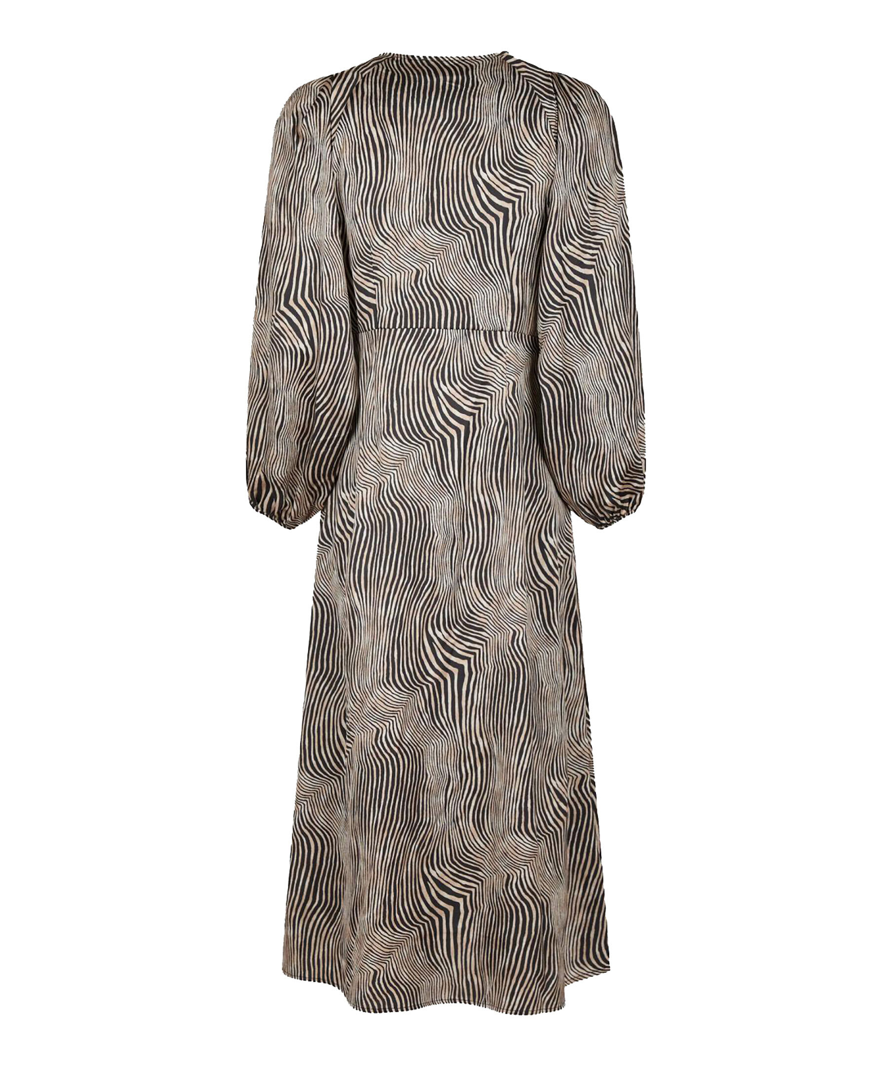 Zebra mönstrad klänning från Neo Noir. Klänningen har satinkänsla, långa ärmar med elastiska muddar. V-ringning med elastiskt lätt draperat band. Dragkedja i sidan. Tillverkad av polyester.