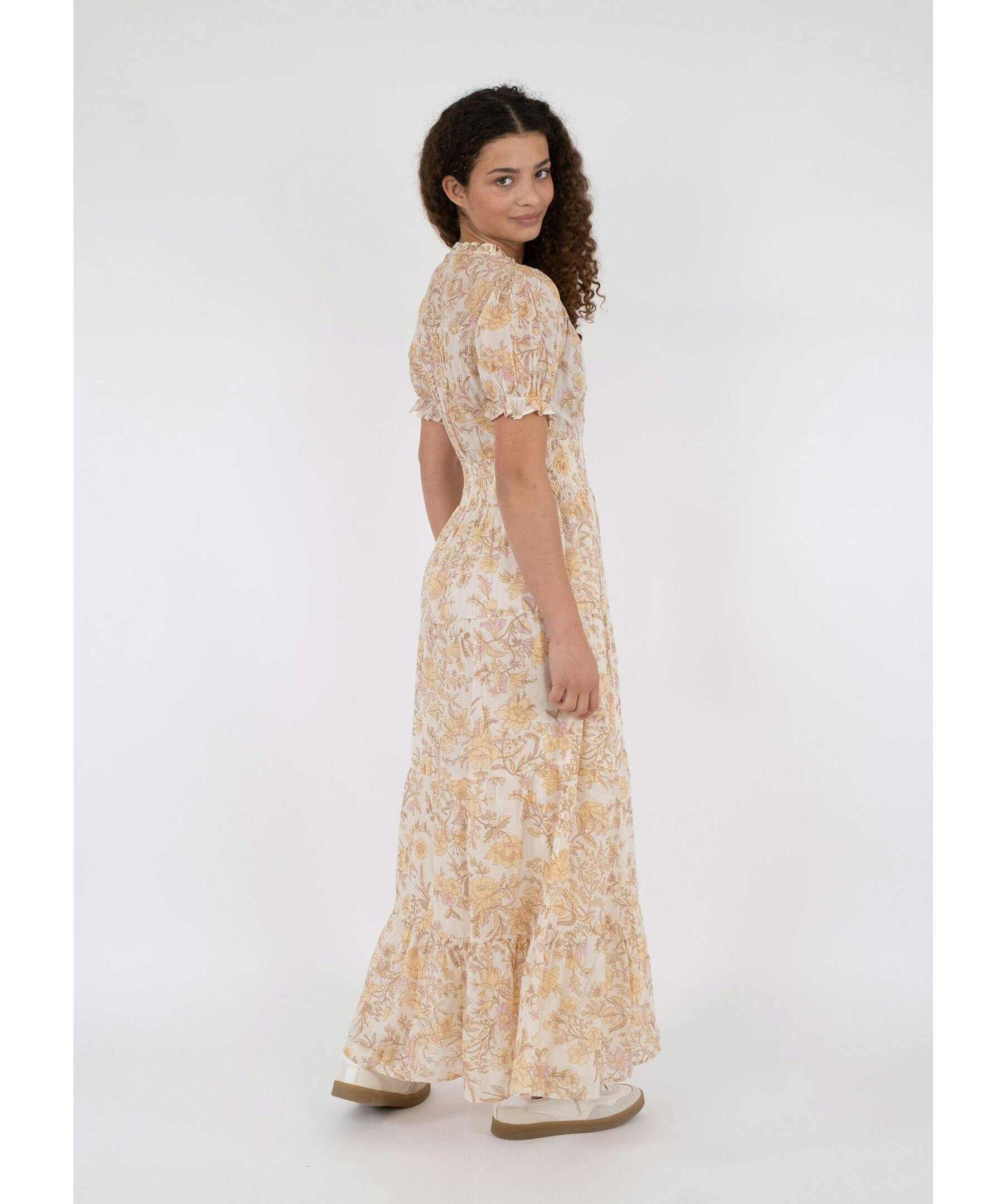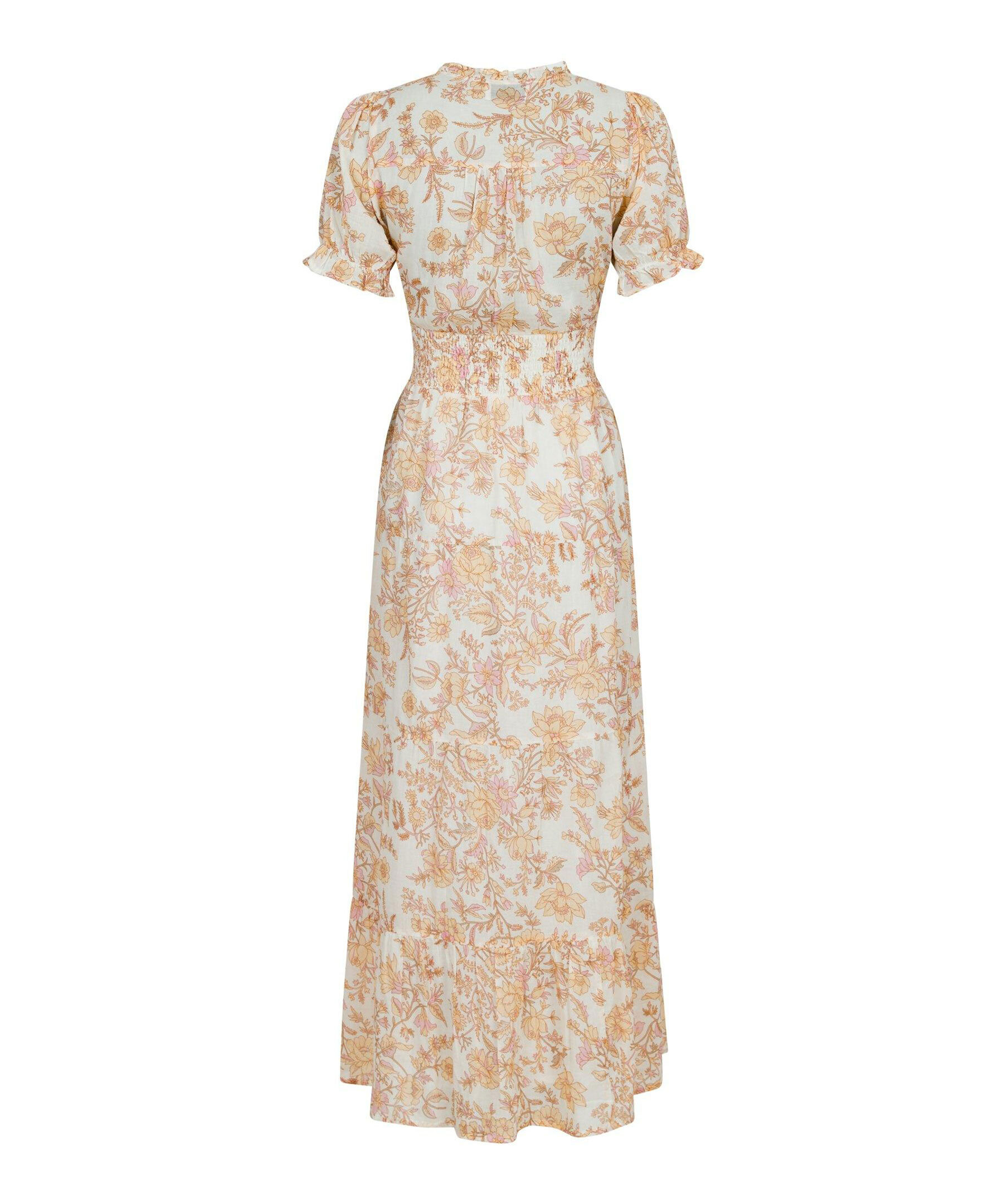 Gul, rosa och orange blommönstrad långklänning från Neo Noir. V-ringad med små volanger. Volanger vid ärmslut. Smock i midjan. Tillverkad i 100% bomull.
