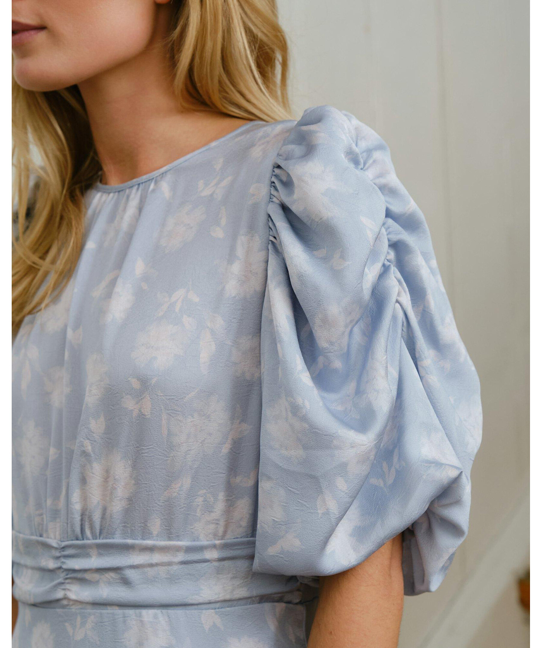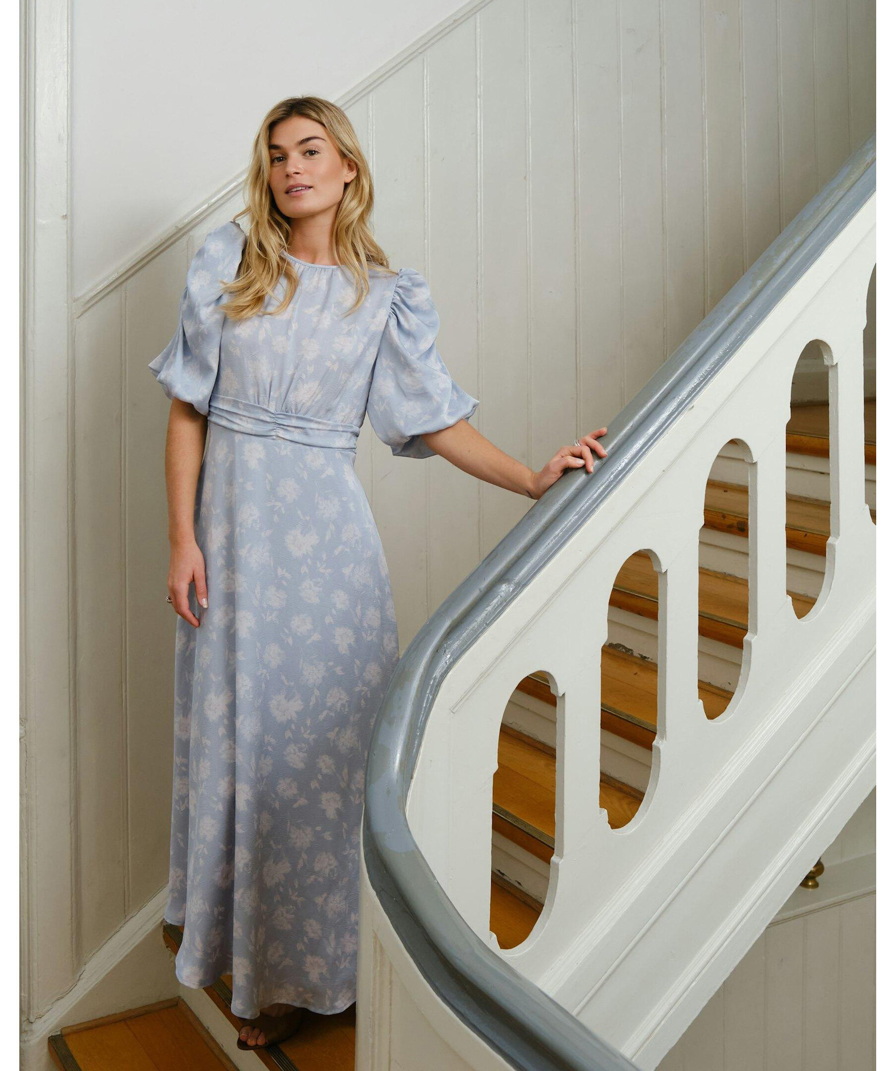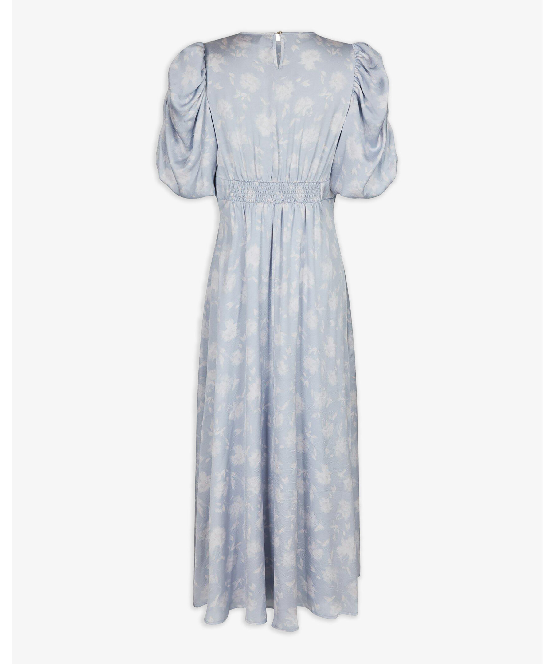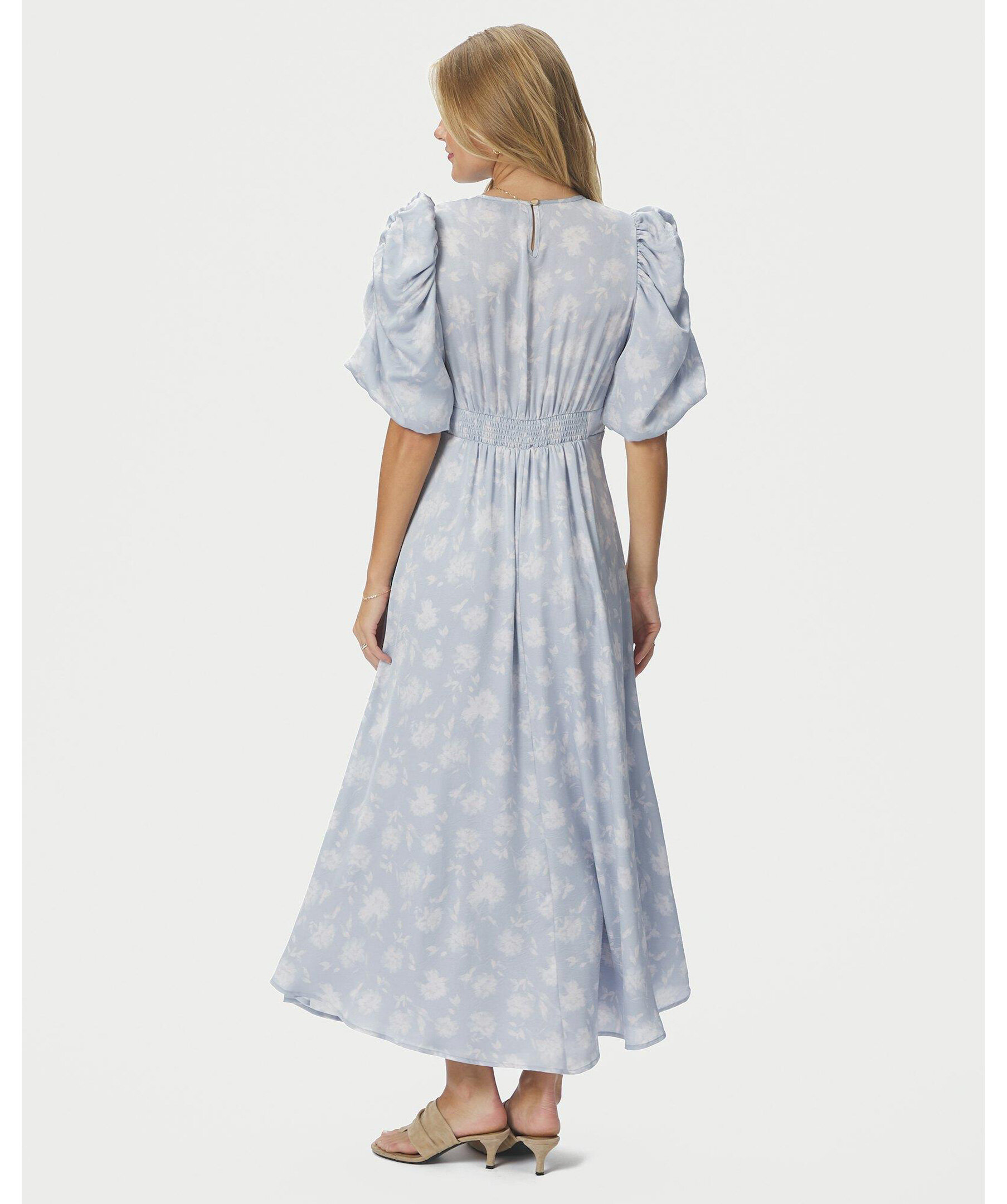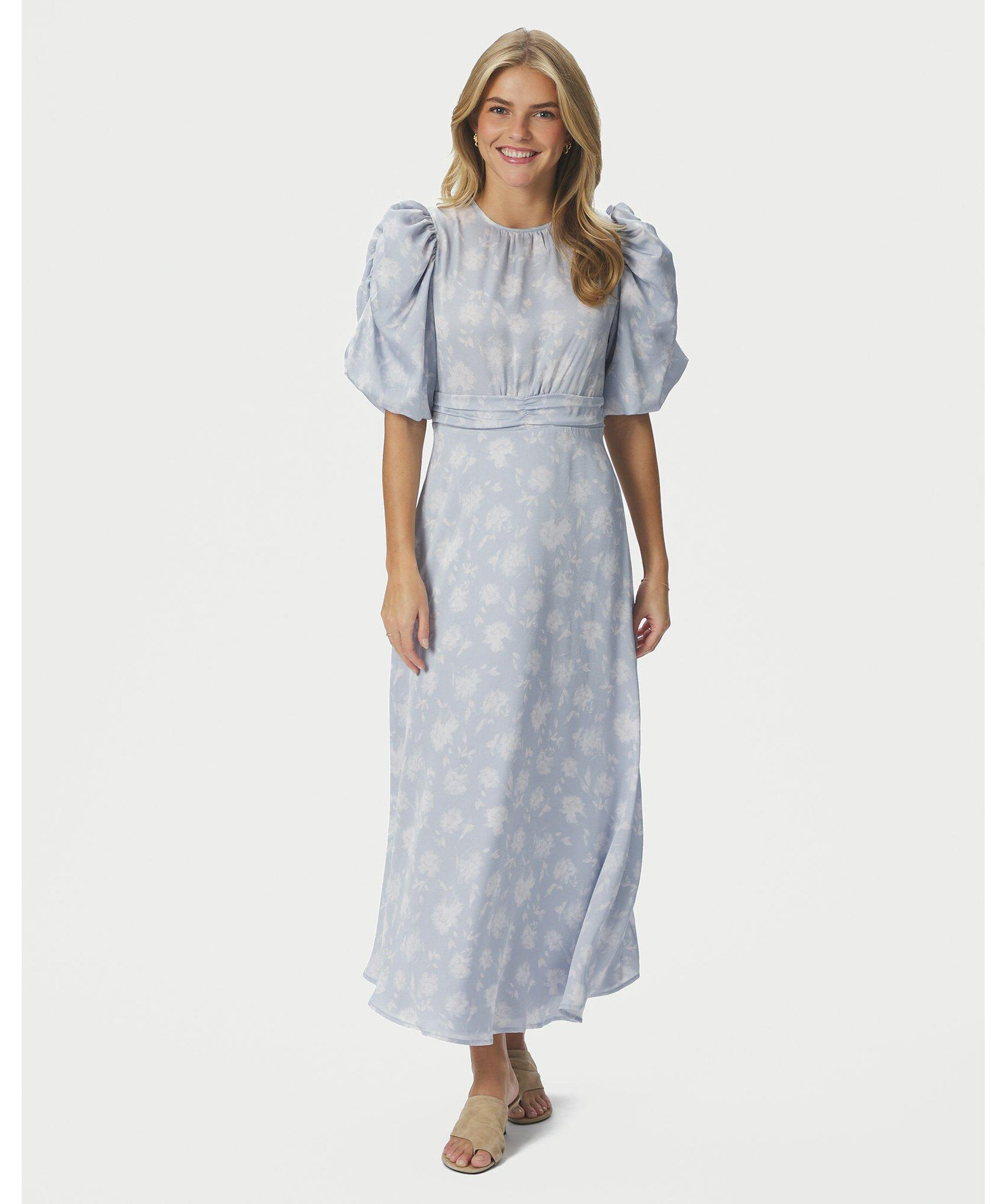 Ljusblå lång klänning med ett vackert blommönster. Klänningen har 3/4-ärmar och smock bak i midjan. Klänningen har en knappstängning vid halsen. Modellen är 176 cm lång och bär storlek