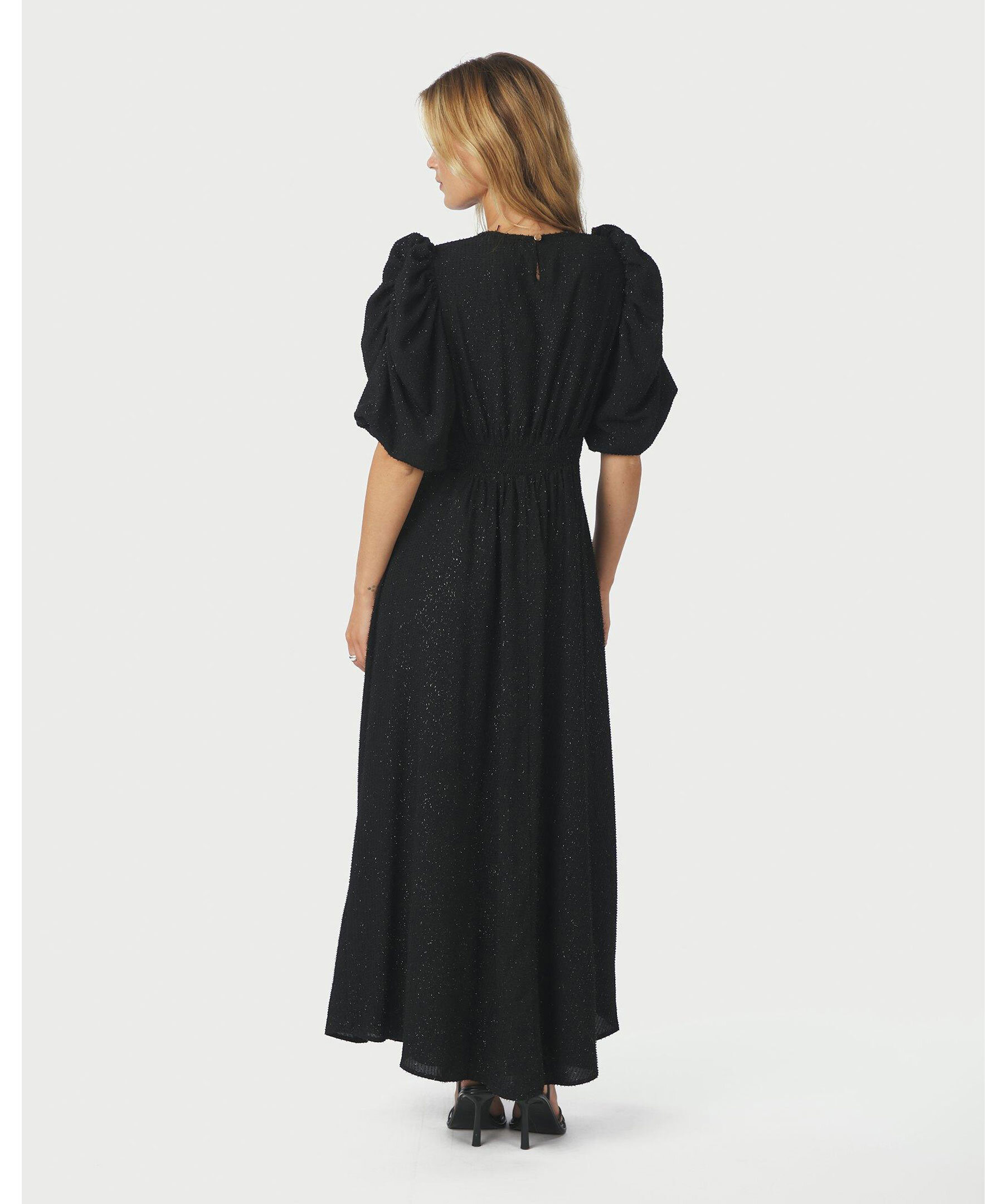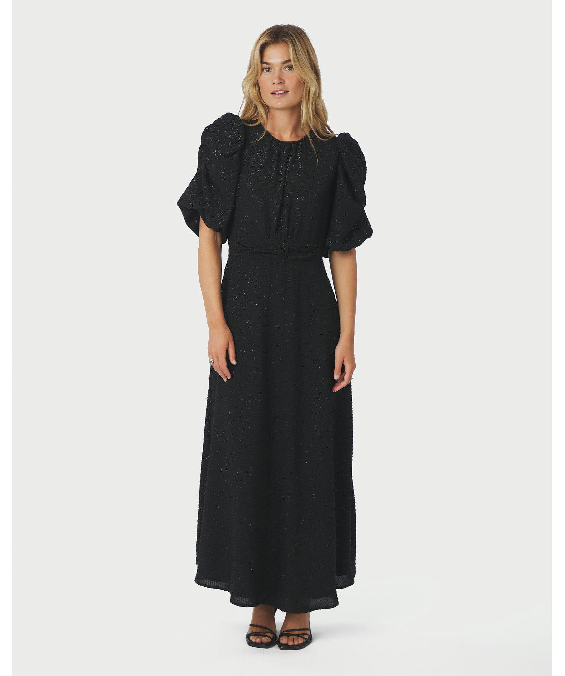 Svart långklänning från Neo Noir med subtila glitterdetaljer och elegant puffärm. Klänningen har smock i midjan på baktill och knäpps med knappar i nacken.