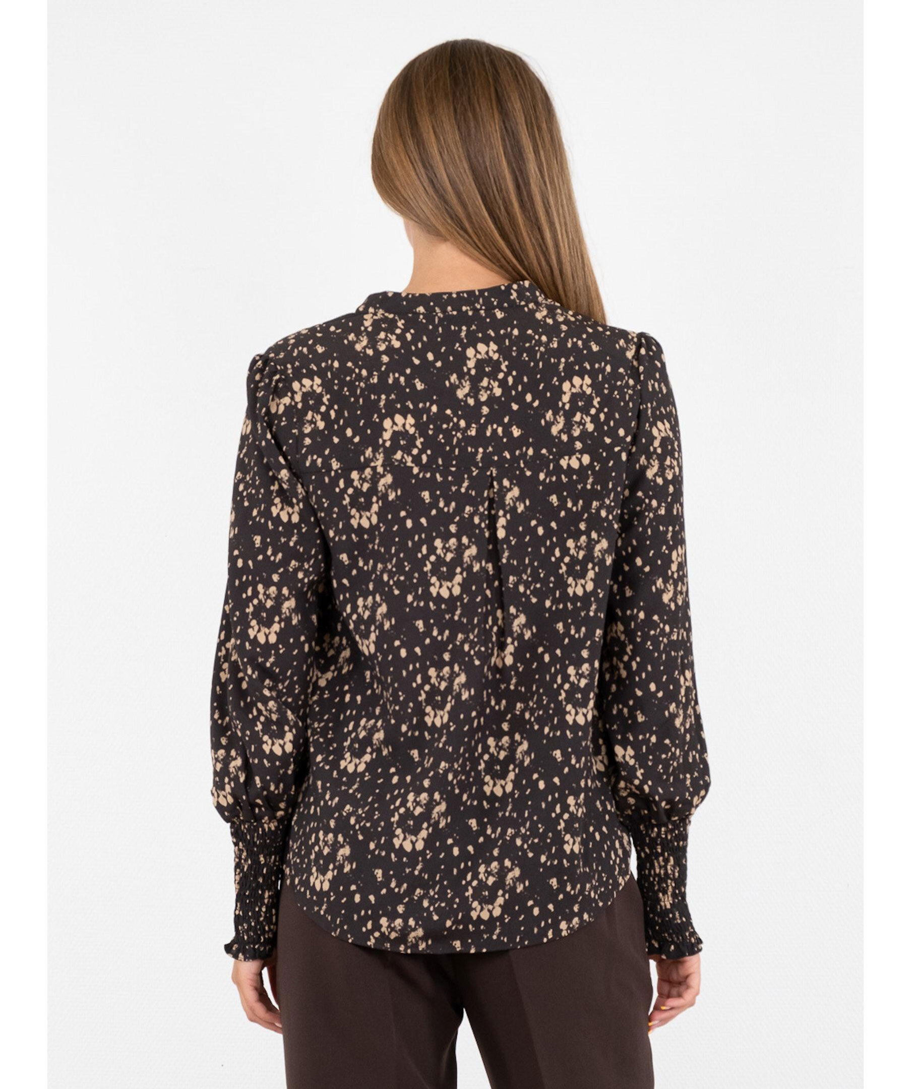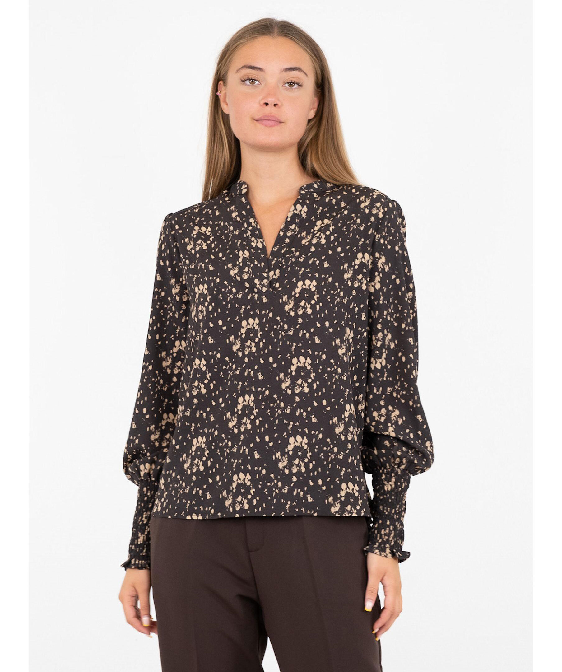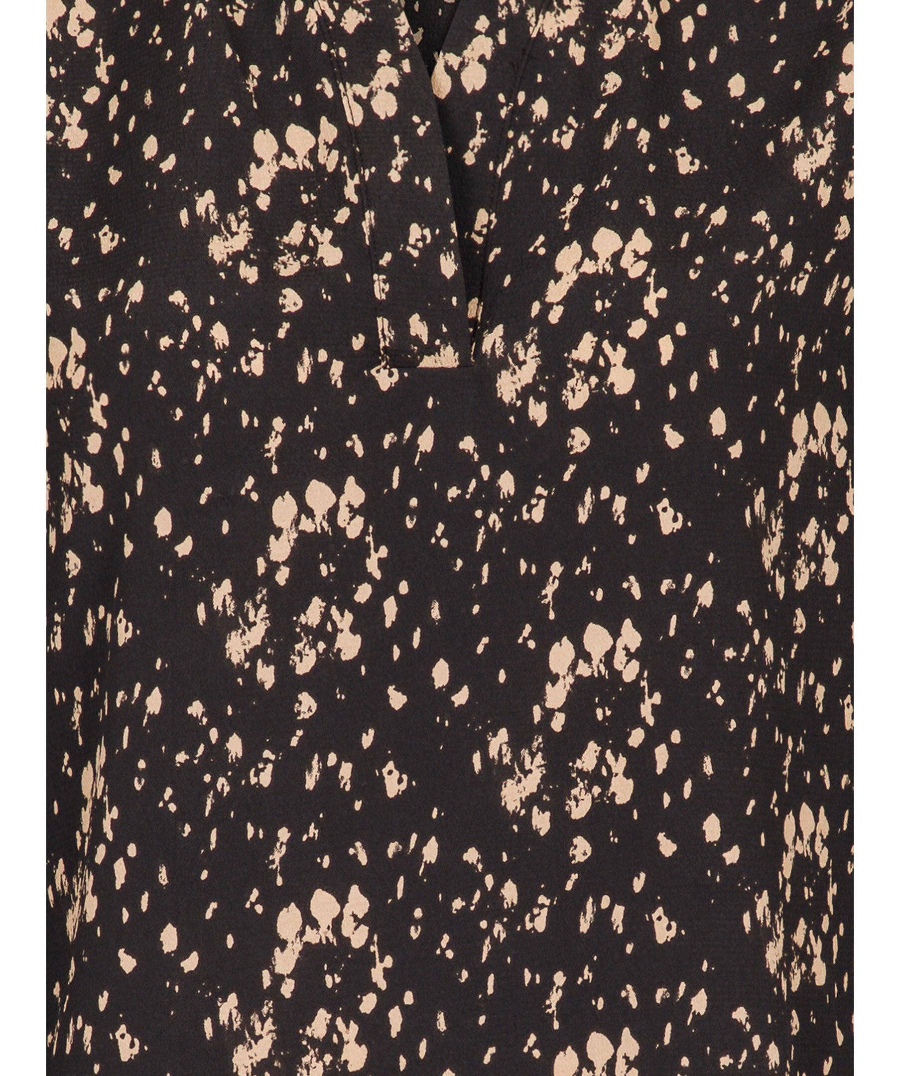 Svart blus från Neo Noir. Mönstrad med beige asymmetriska prickar. V-ringning och en mindre puffärm uppe vid axeln, draperad mudd nertill armslutet.