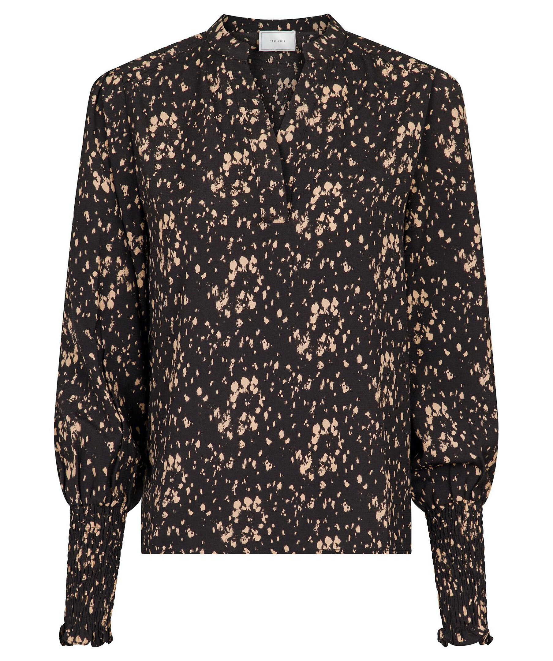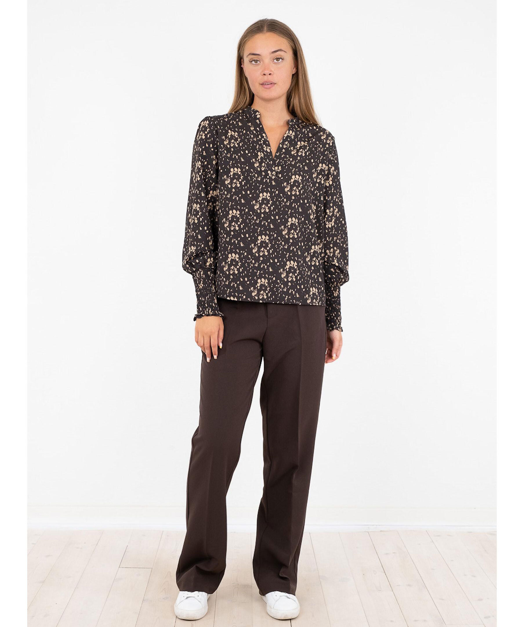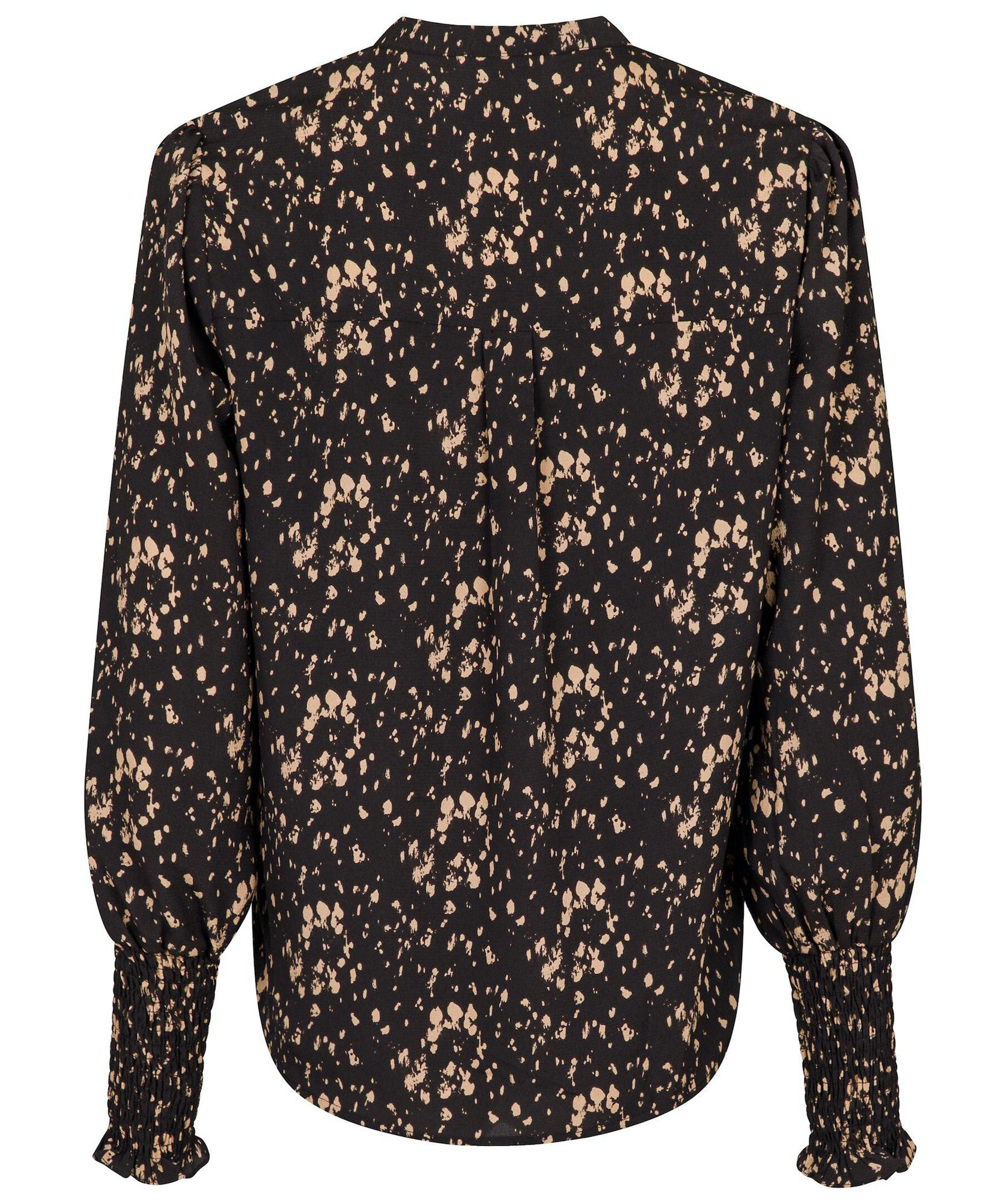 Svart blus från Neo Noir. Mönstrad med beige asymmetriska prickar. V-ringning och en mindre puffärm uppe vid axeln, draperad mudd nertill armslutet.