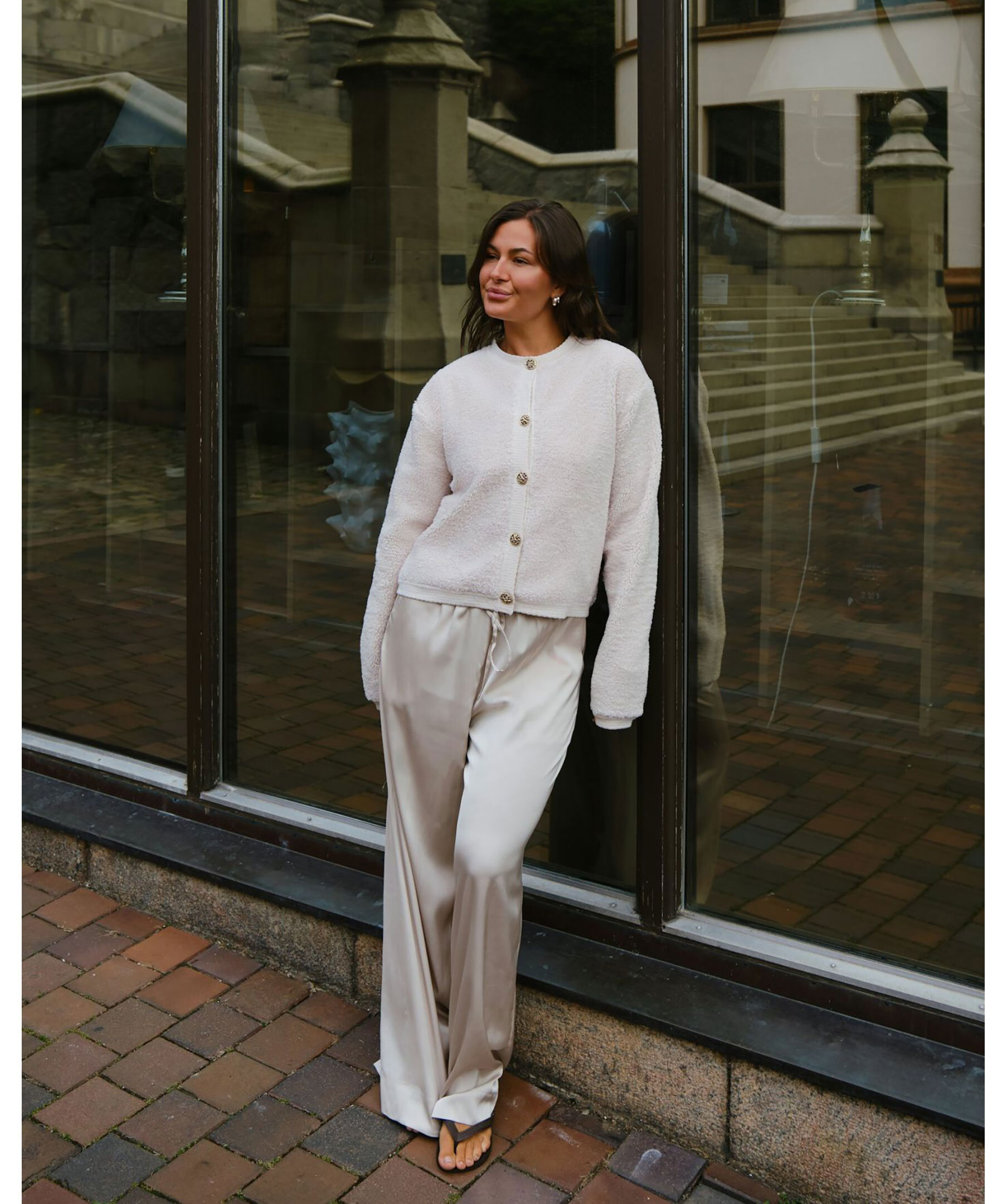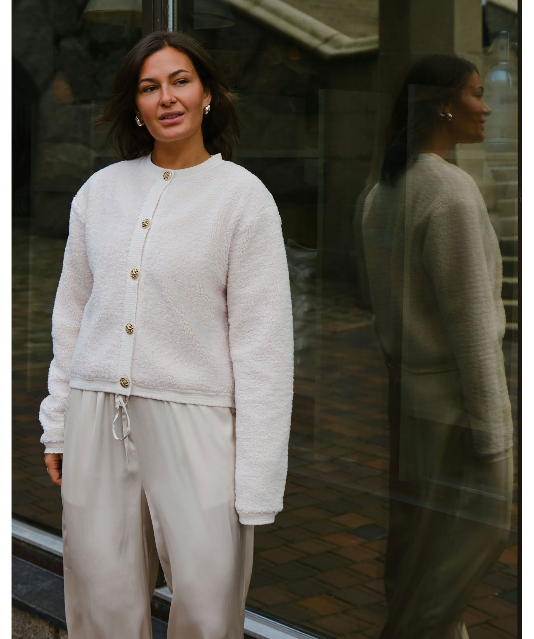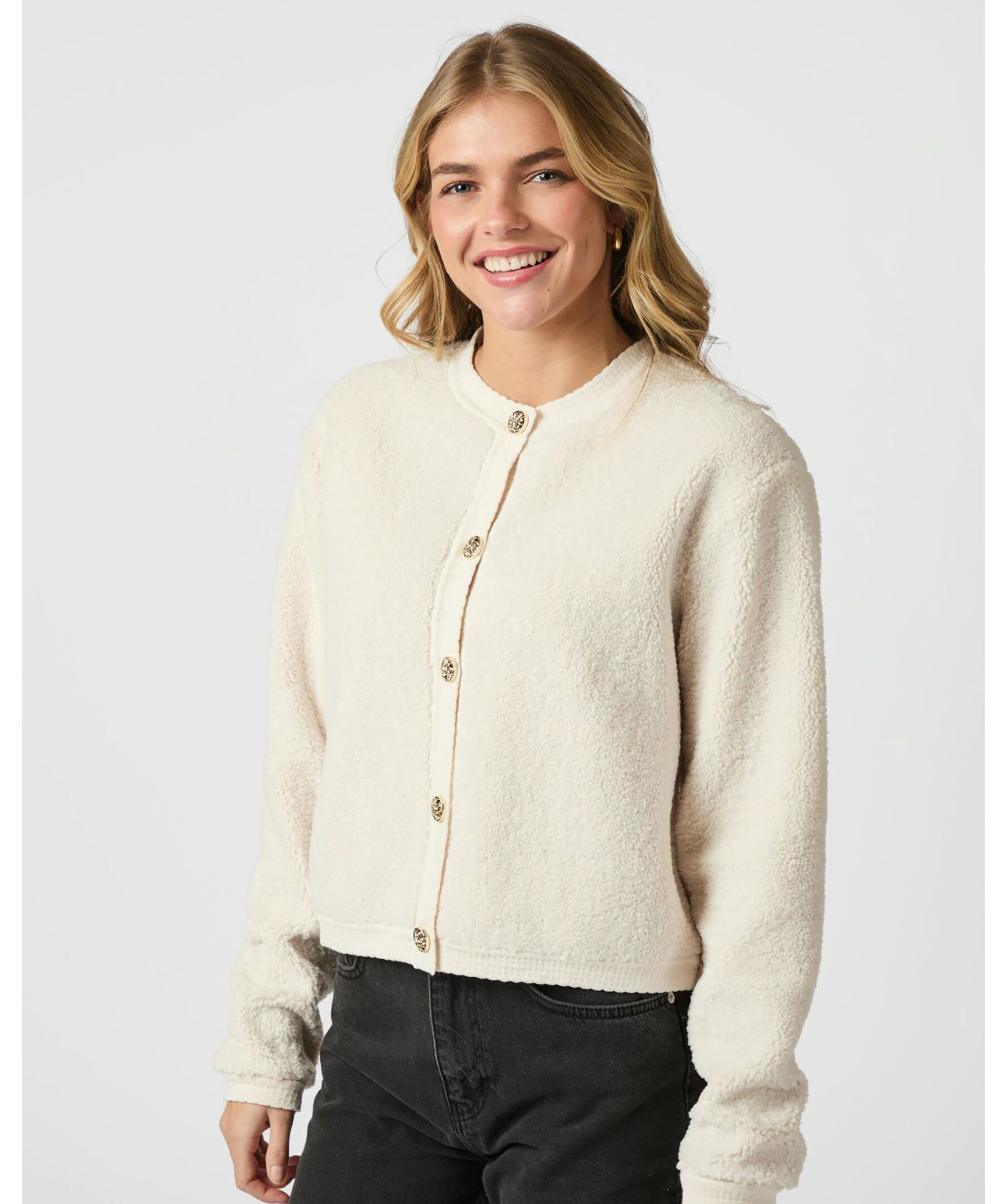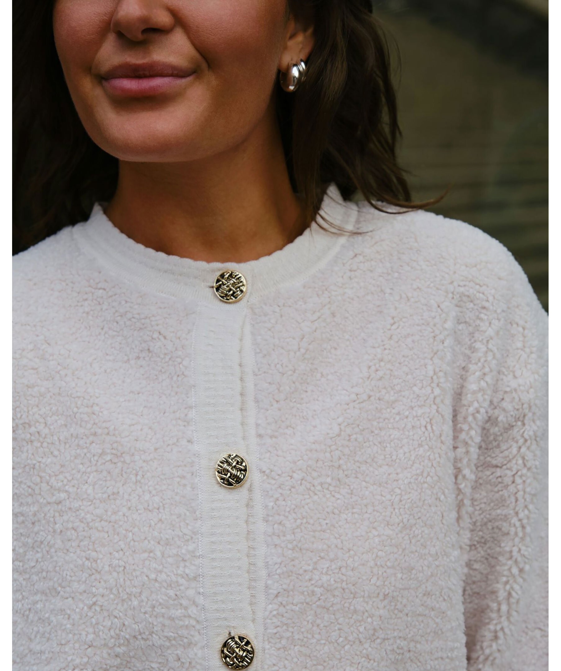 Cremefärgad fluffig kofta från Neo Noir. Koftan stängs med dekorativa knappar framtill och har två fickor. Tillverkad i polyester.