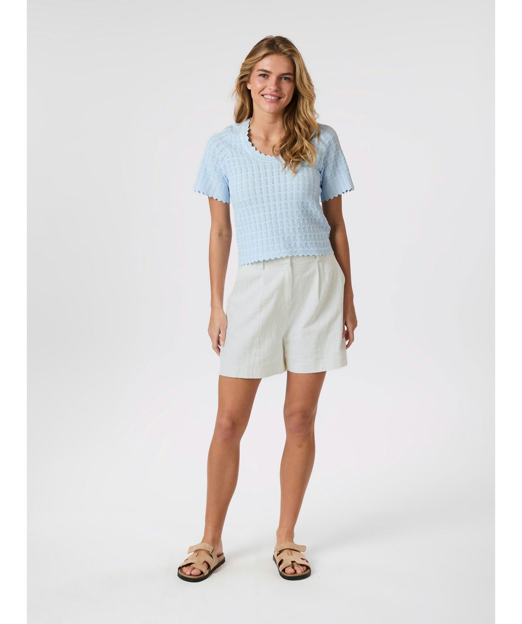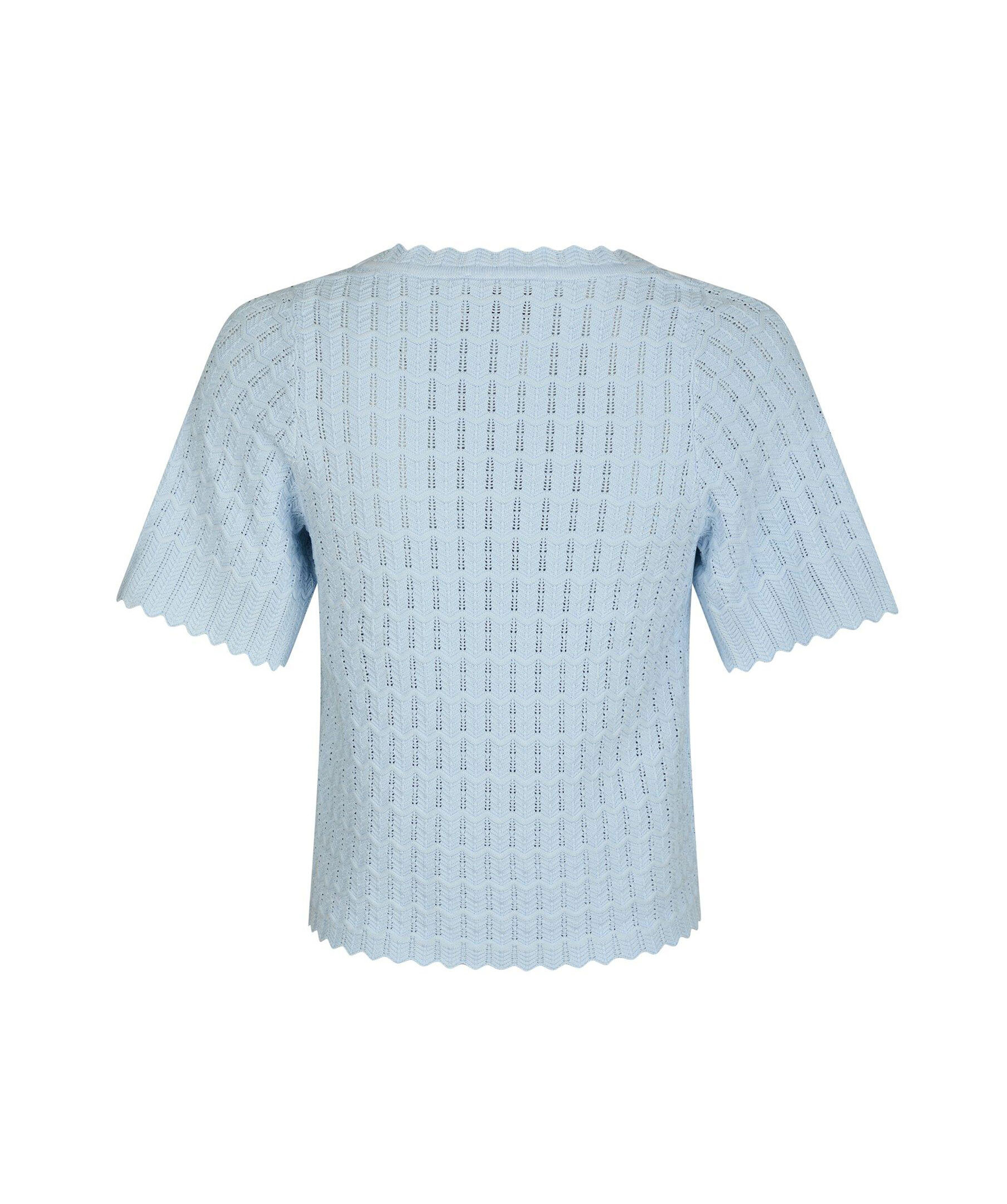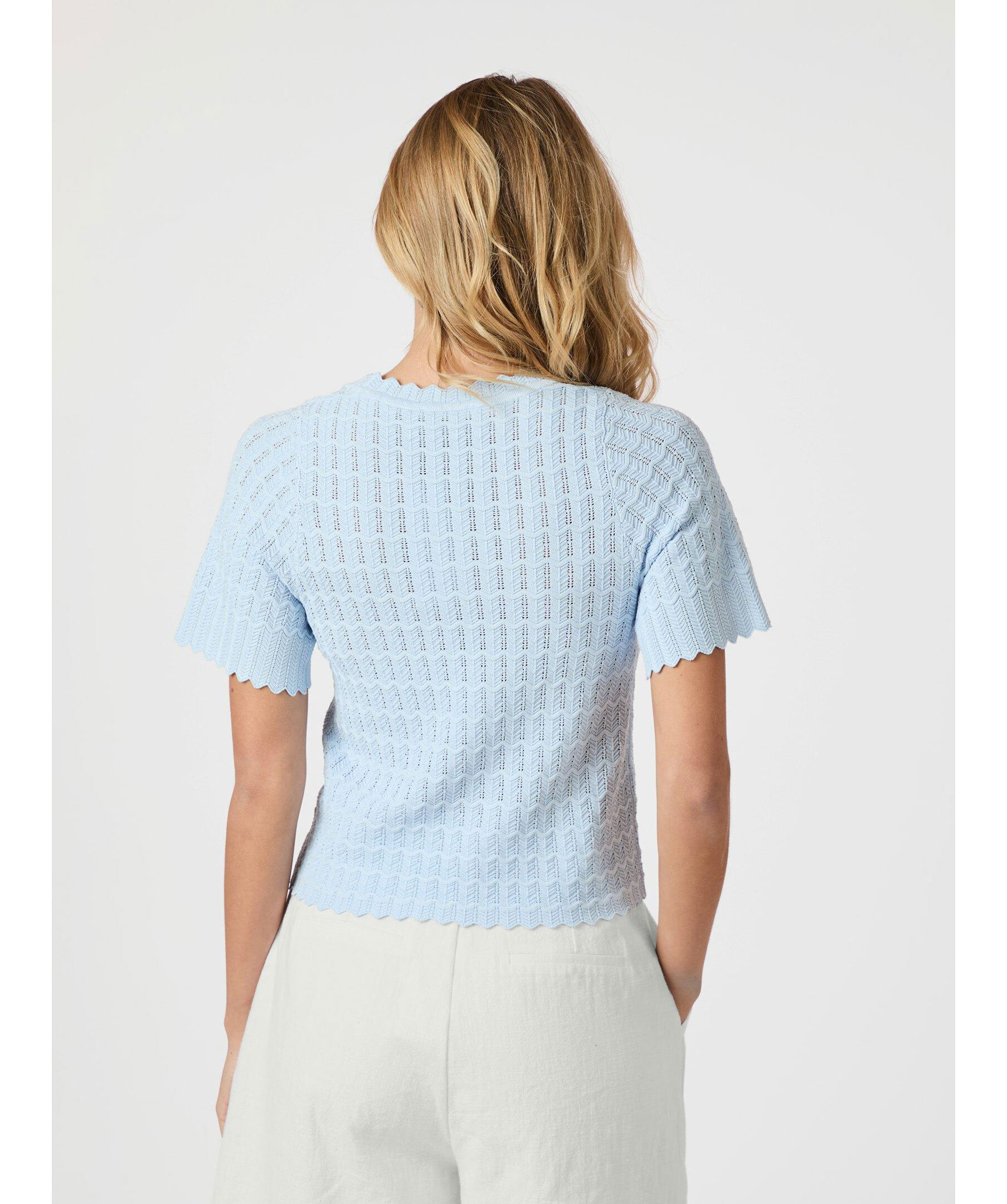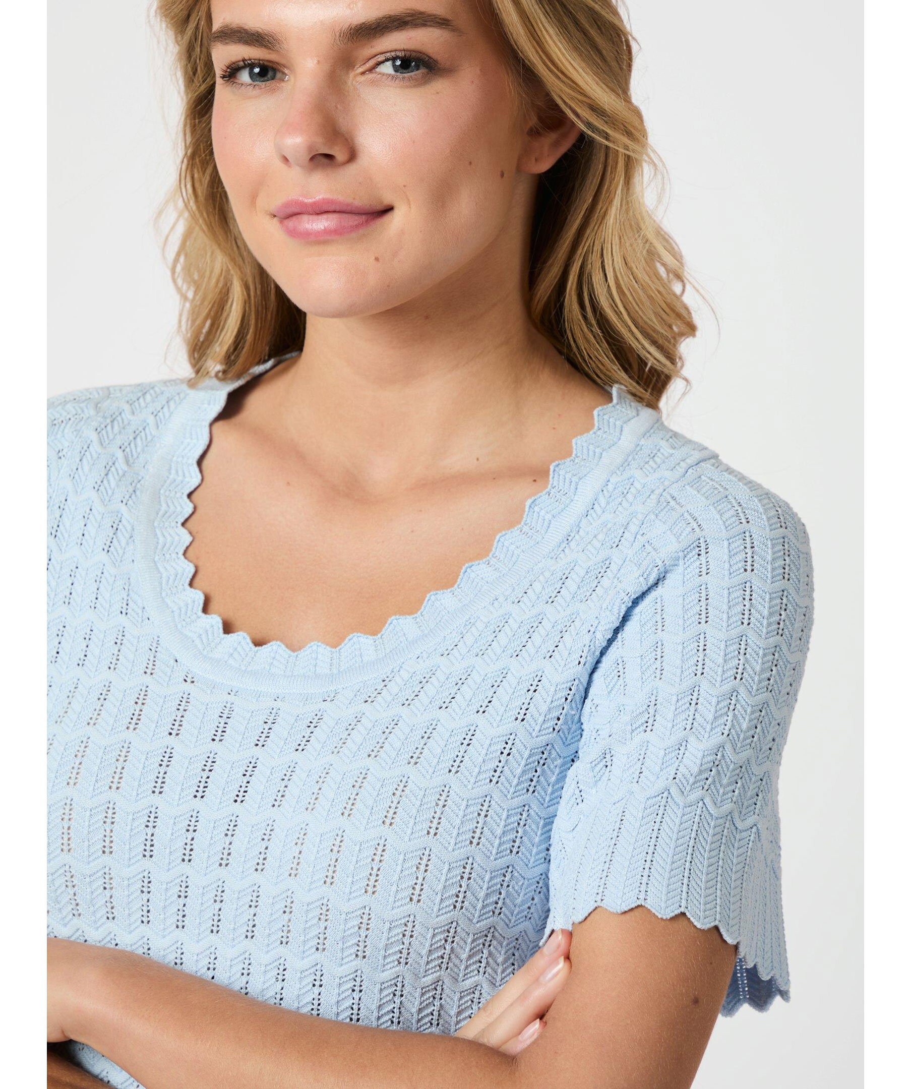 En vacker stickad blus med korta ärmar. Blusen har en djup, rund halsringning och är stickad i ett zigzag-mönster. Modellen är 176 cm lång och bär storlek 36.