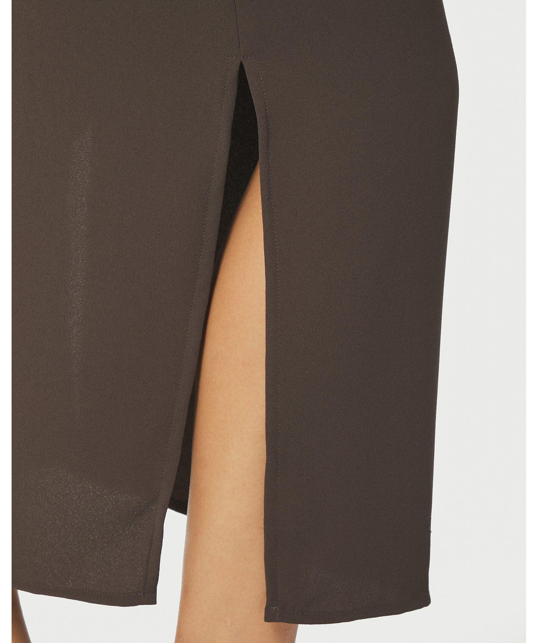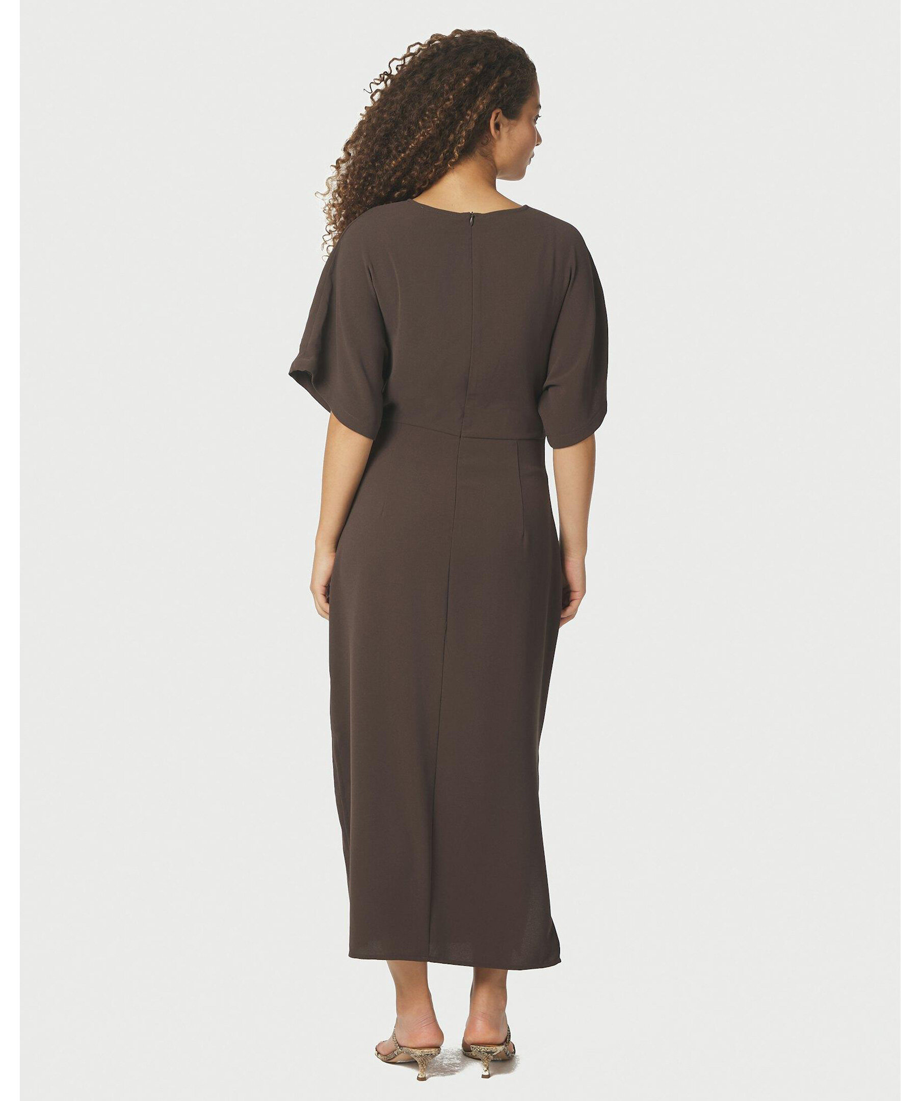 Brun draperad klänning med rynkor vid midjan för en figurnära och feminin look. Modellen är 176 cm lång och bär storlek 36.
