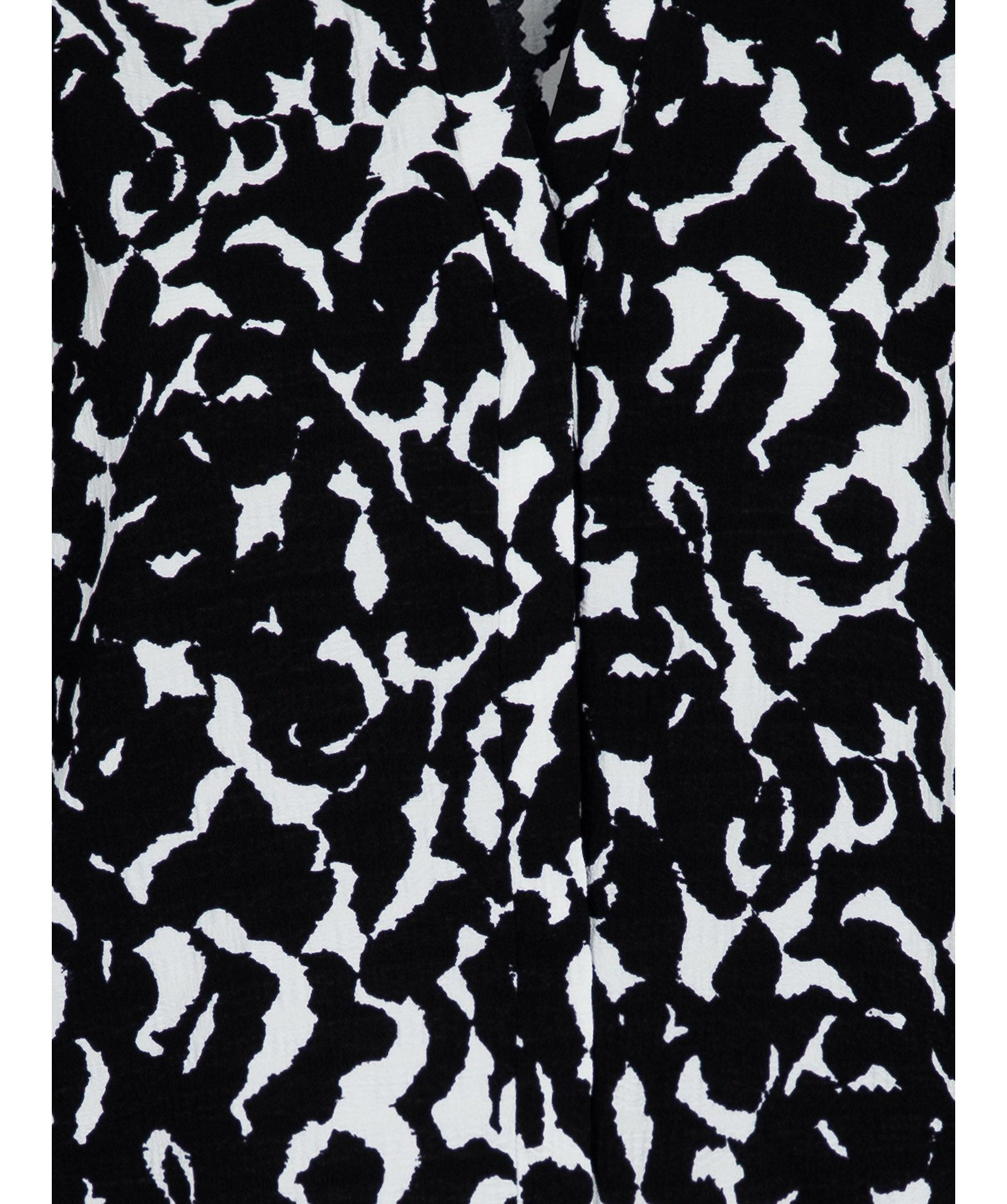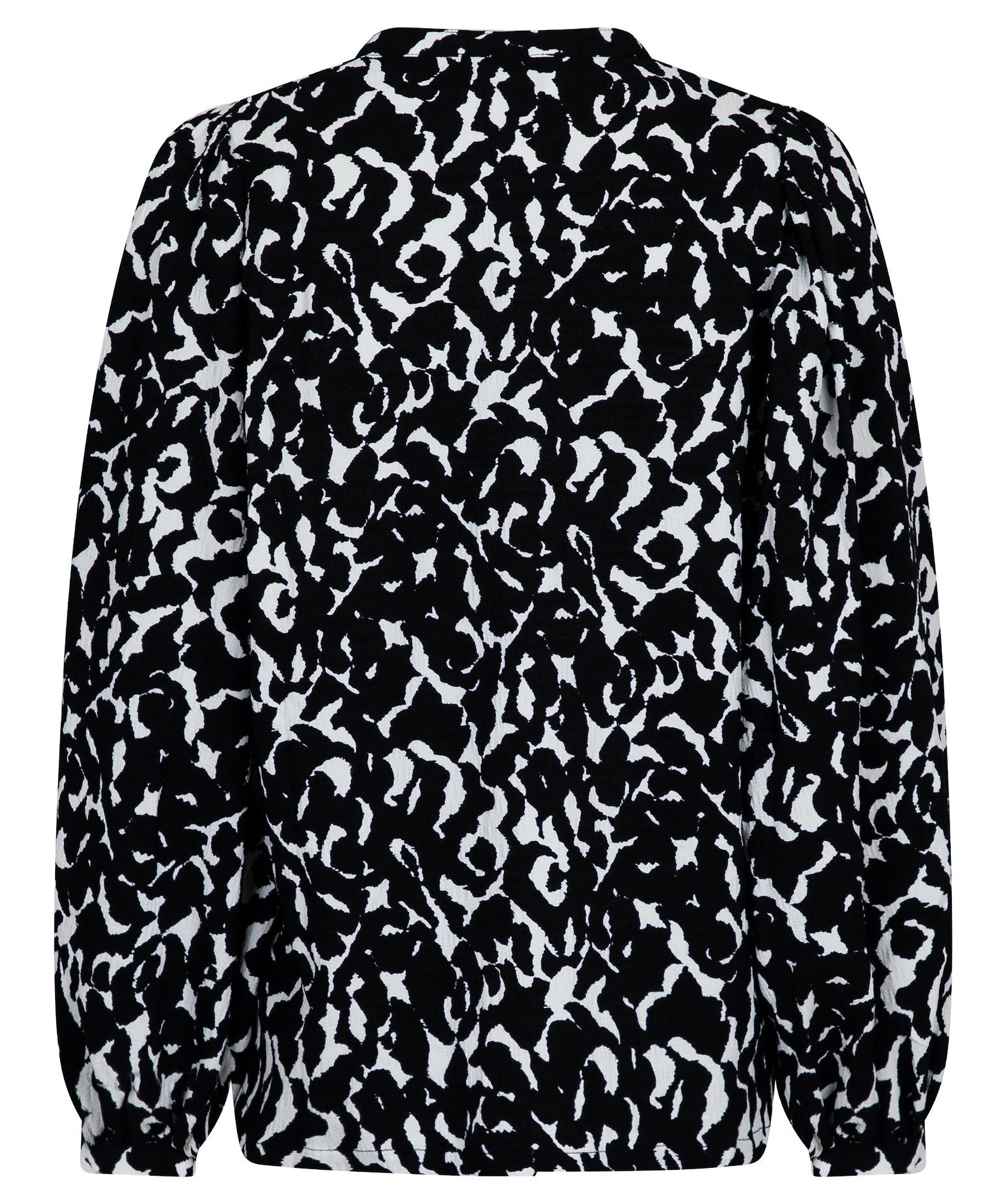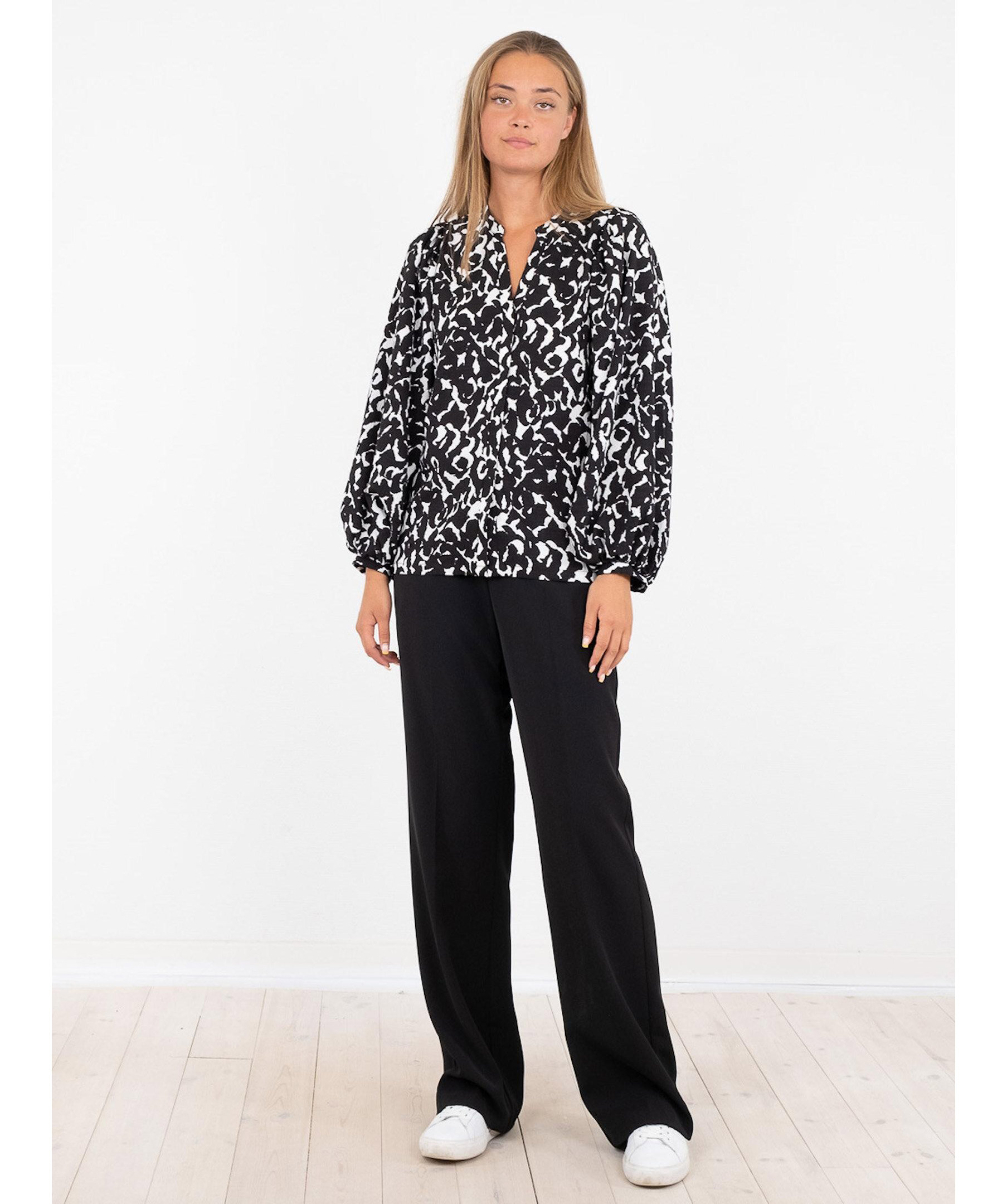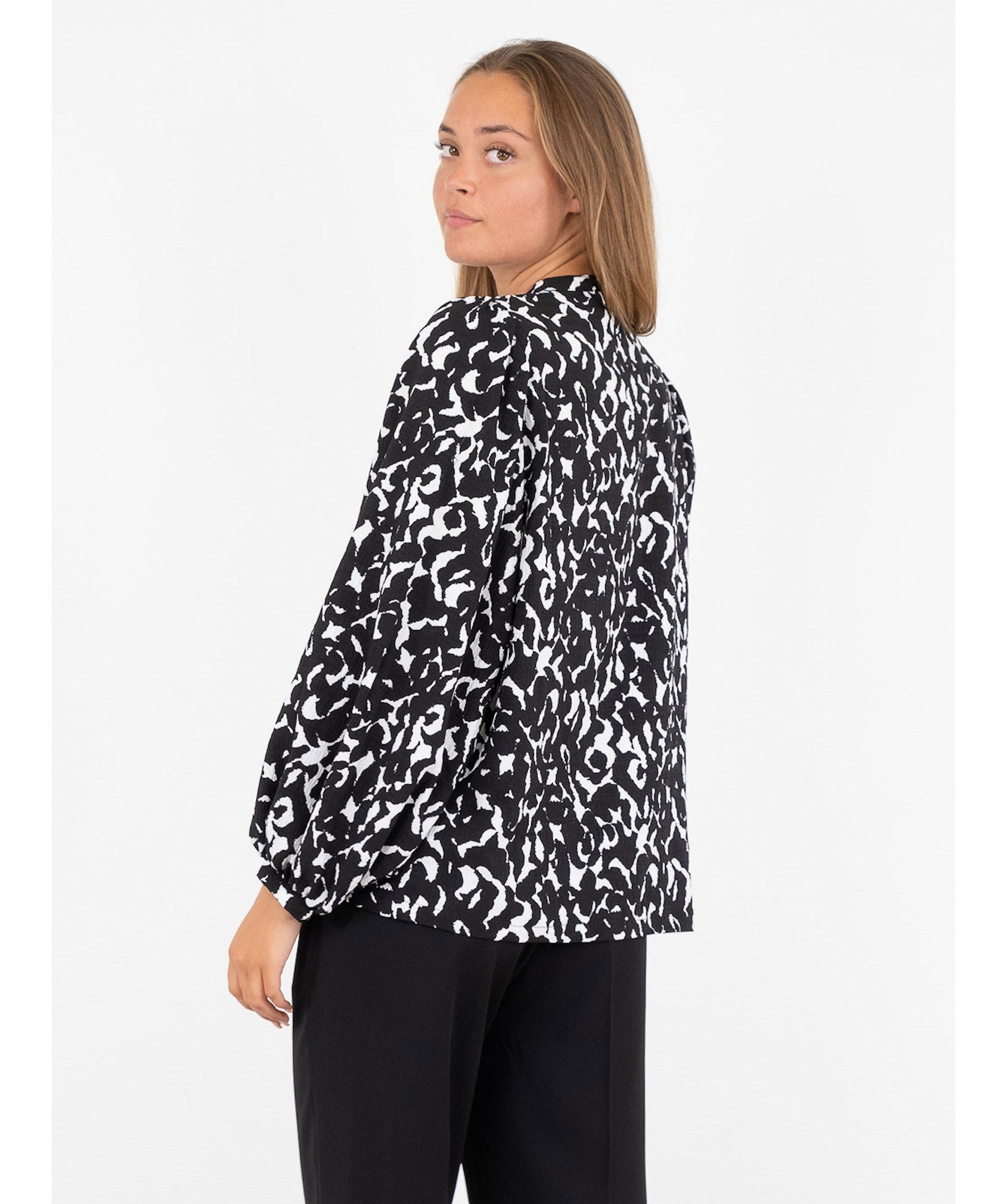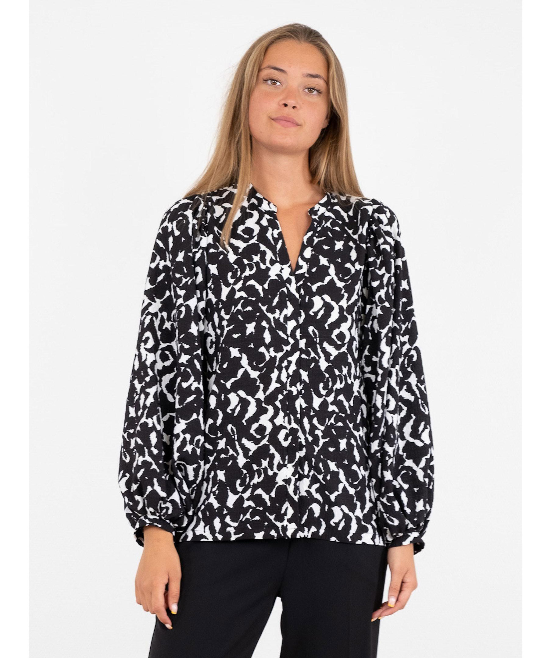 Mönstrad blus i mjuk stretchig kvalitet från Neo Noir. Blusen har en smal v-ringad öppning framtill och passformen är lös med stora puffärmar och kommer i ett coolt grafiskt tryck i svart och vitt.