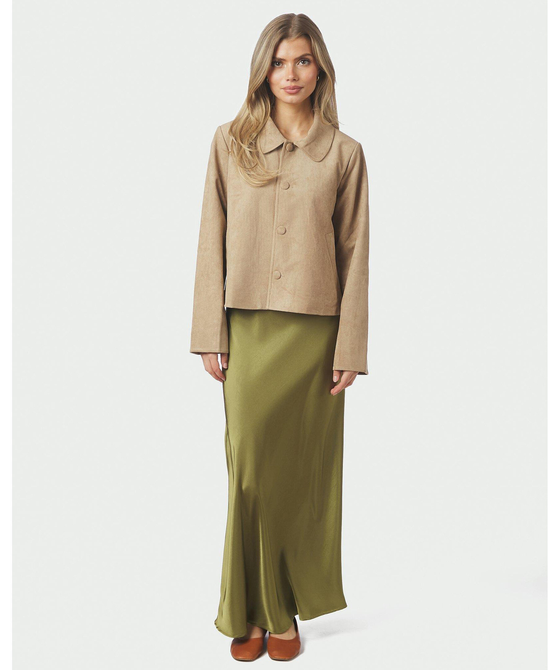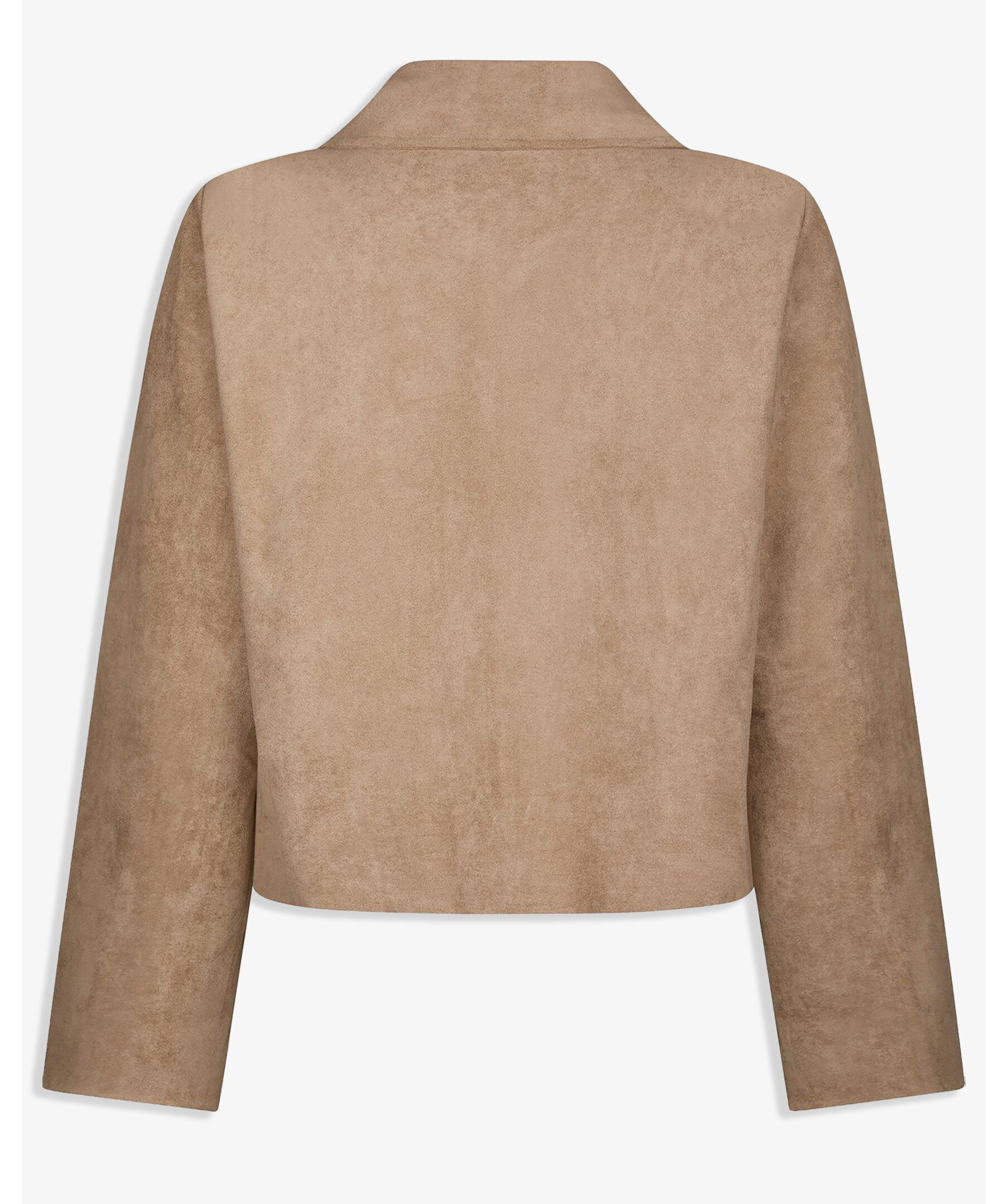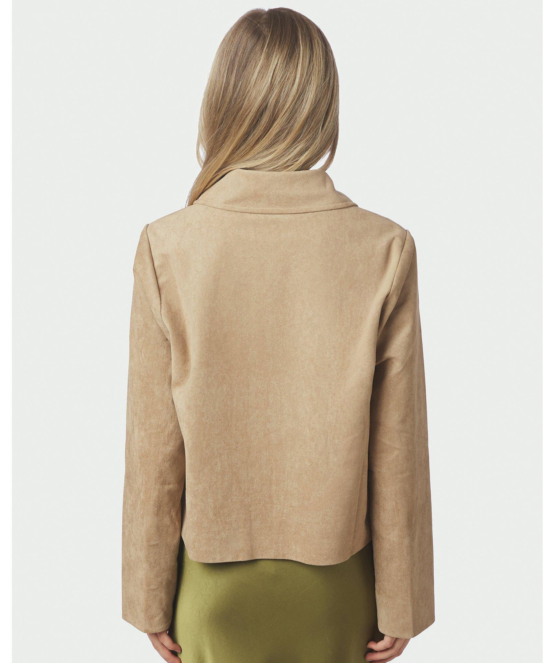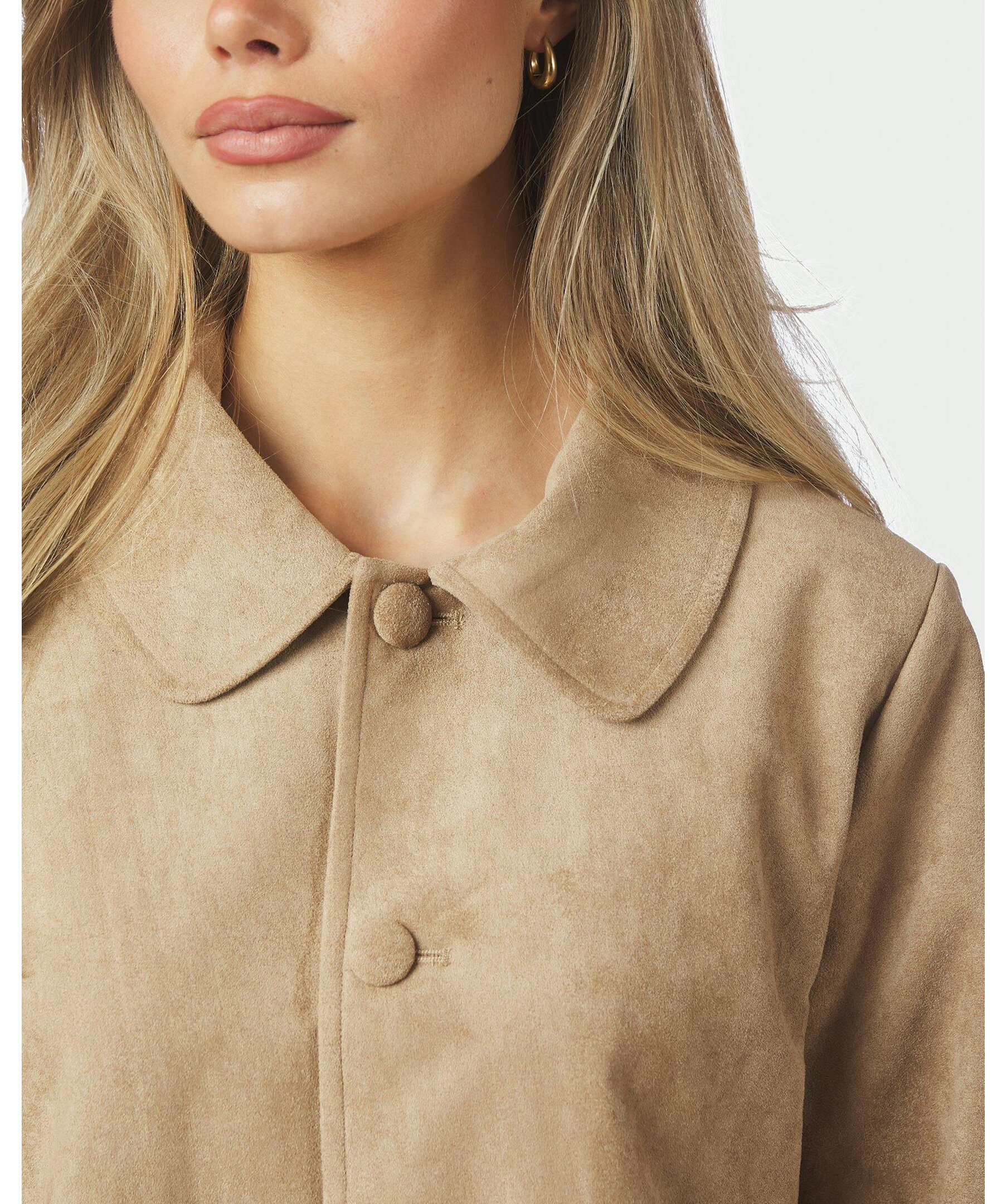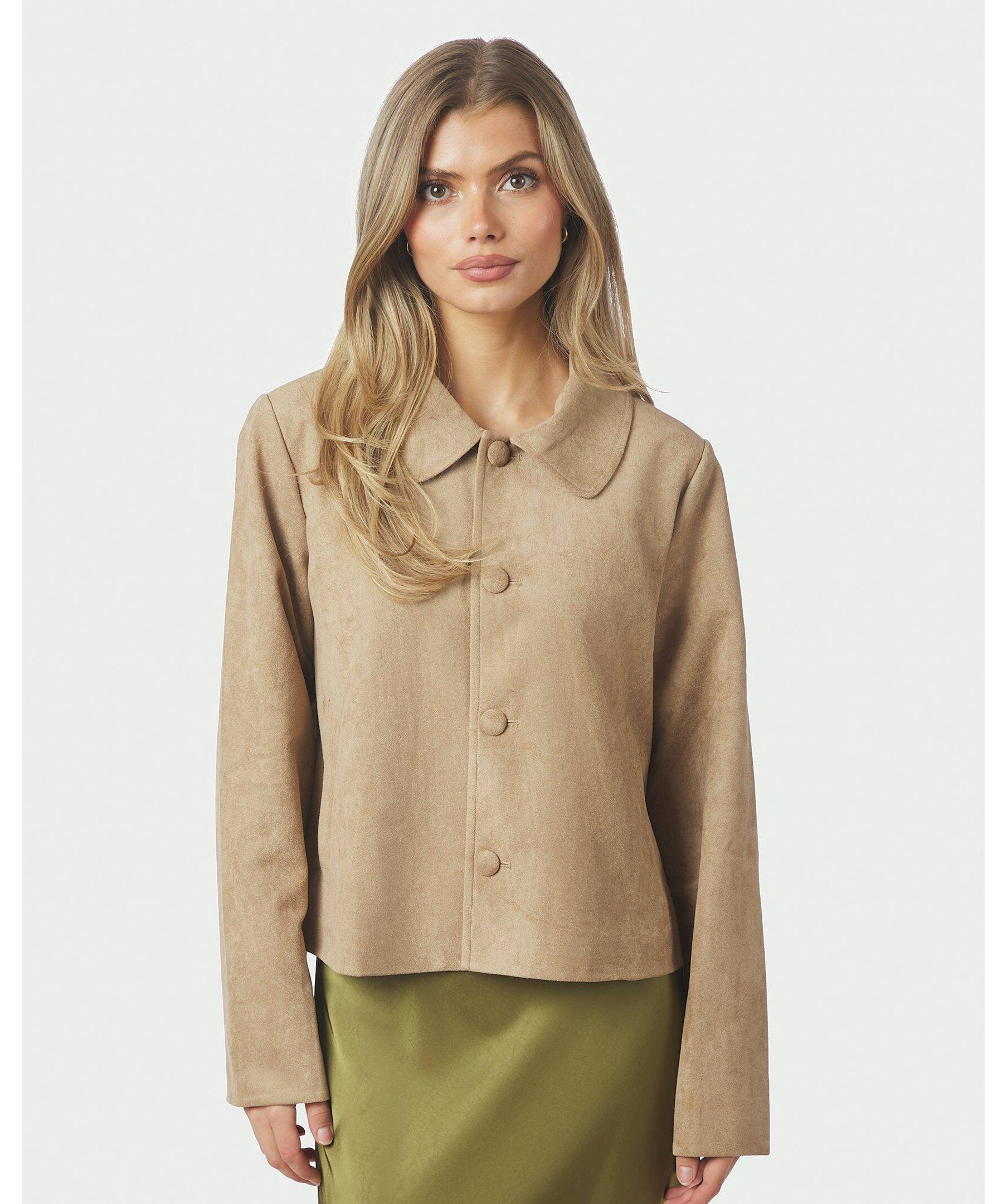 Sandfärgad mocka-jacka med fickor fram. Jackan är i en kvalitet av faux mocka. Modellen är 176 cm och bär storlek 36.