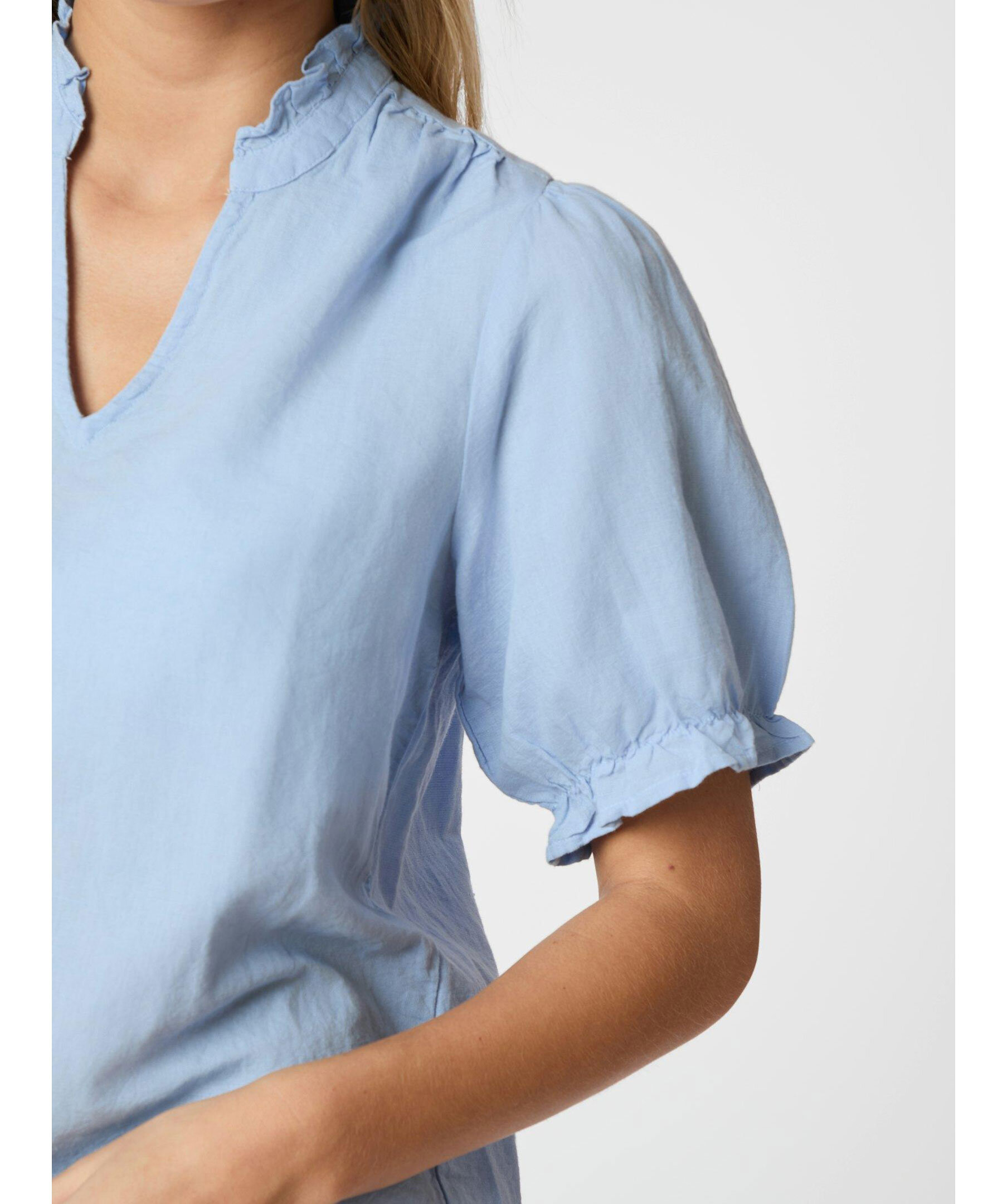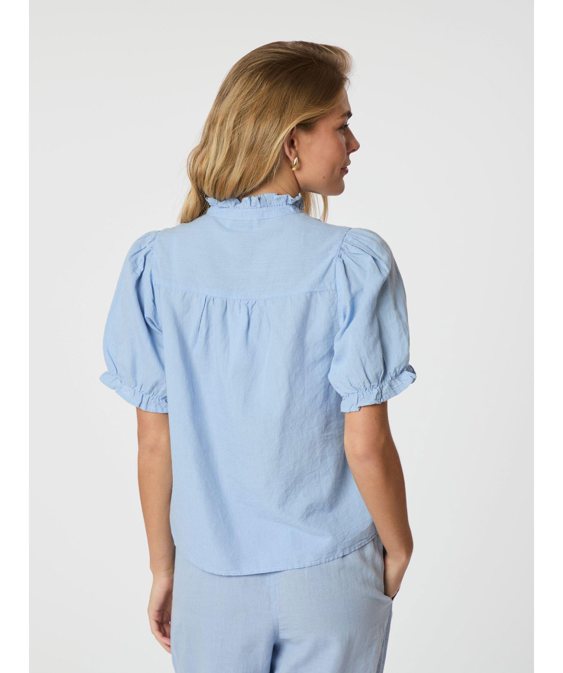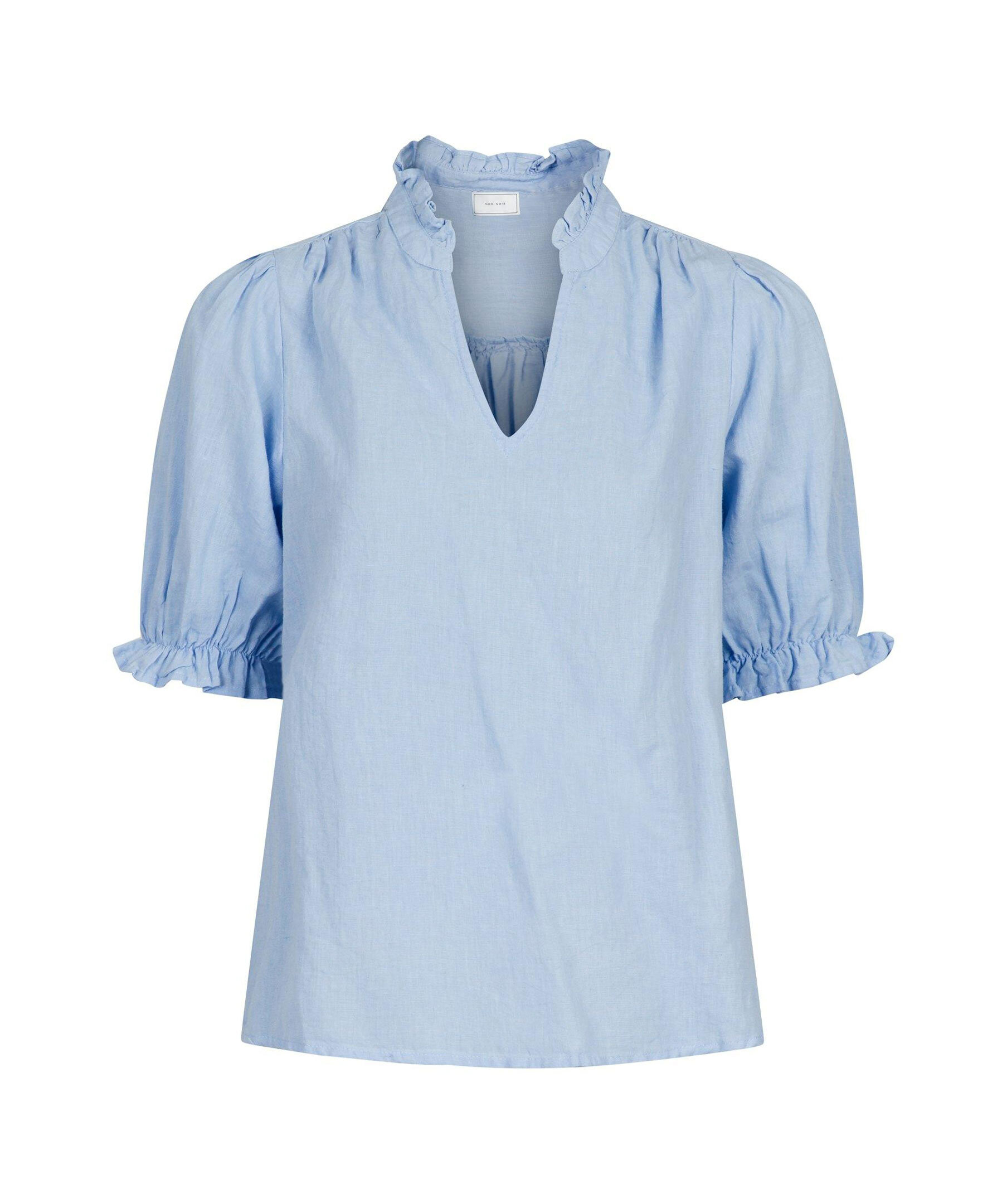 Ljusblå kortärmad blus från Neo Noir med fin volangdetalj vid krage och axlar. Blusen har en V-ringad hals och puffdetalj vid armarna. Tillverkad i en linneblandning.