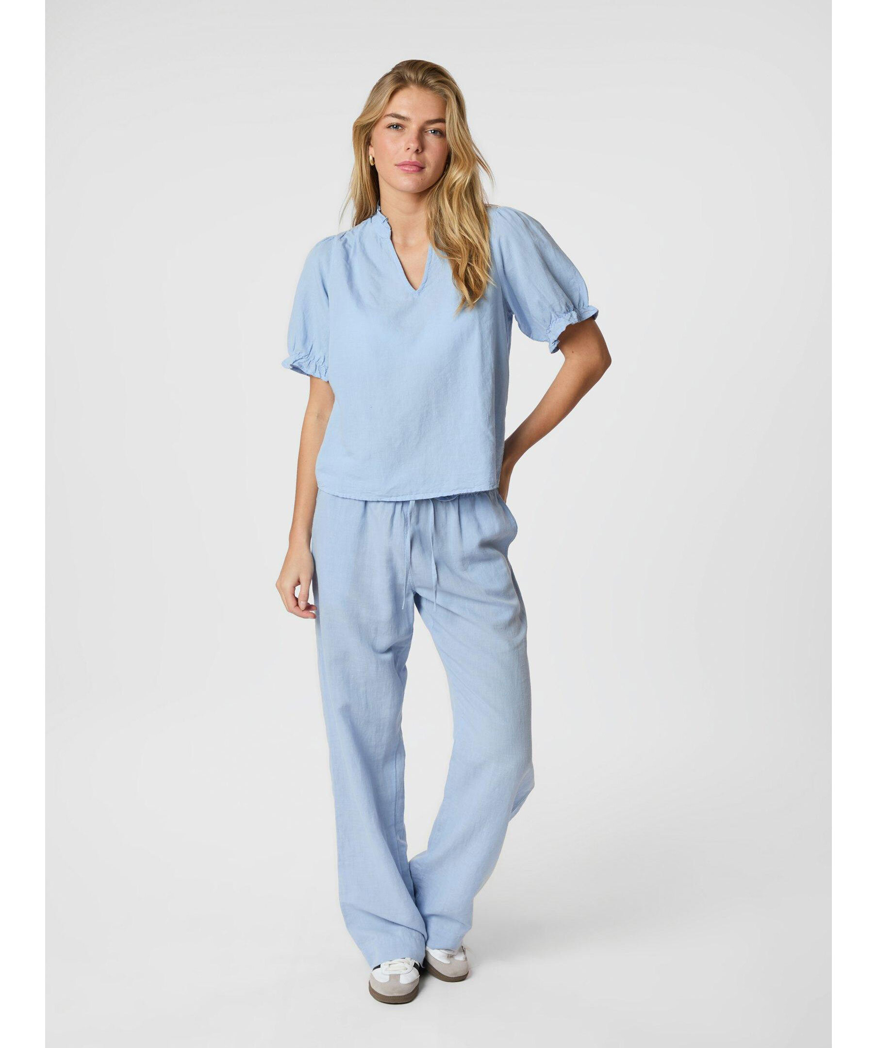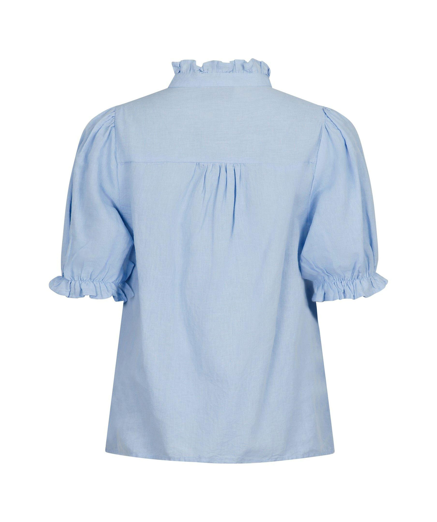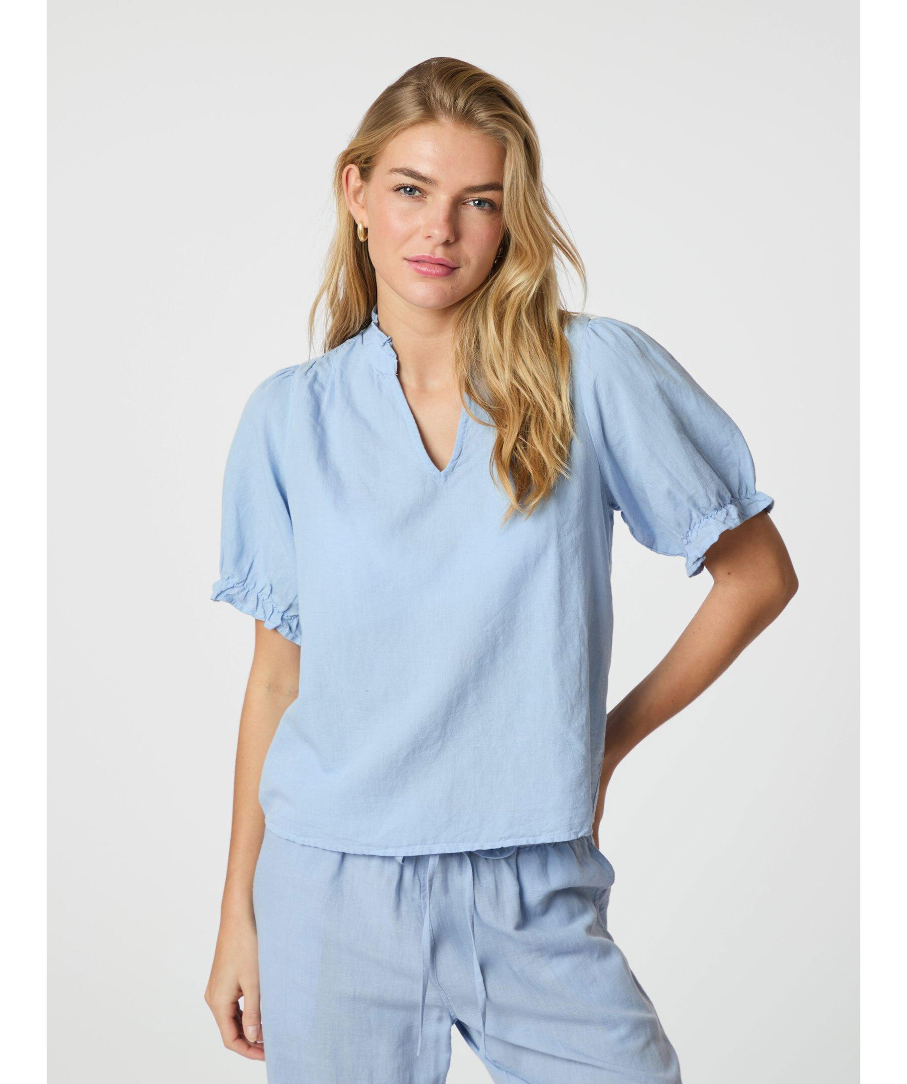 Ljusblå kortärmad blus från Neo Noir med fin volangdetalj vid krage och axlar. Blusen har en V-ringad hals och puffdetalj vid armarna. Tillverkad i en linneblandning.